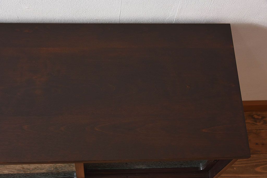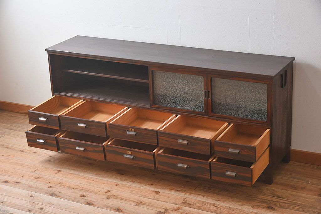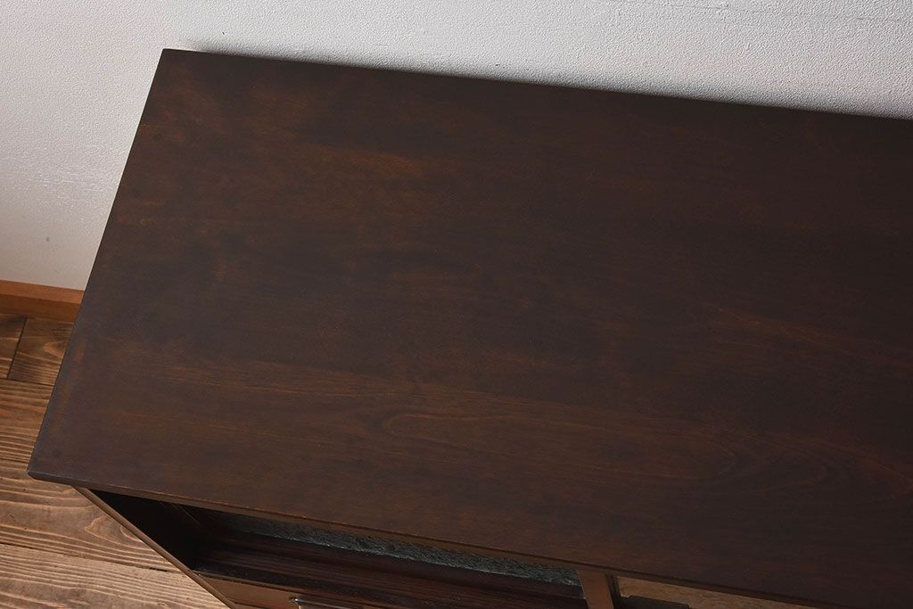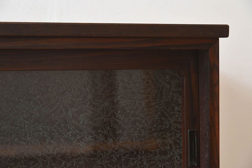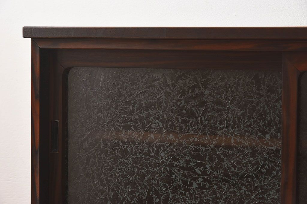 前面黒檀材 脚付き 結霜ガラス入り4枚引き戸のアンティークローボードです。