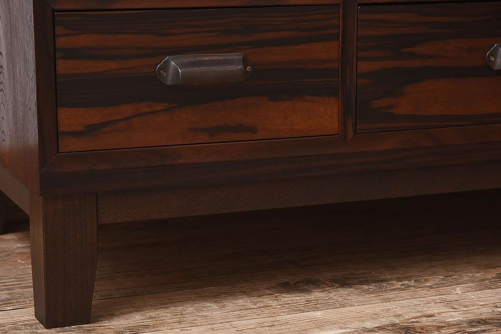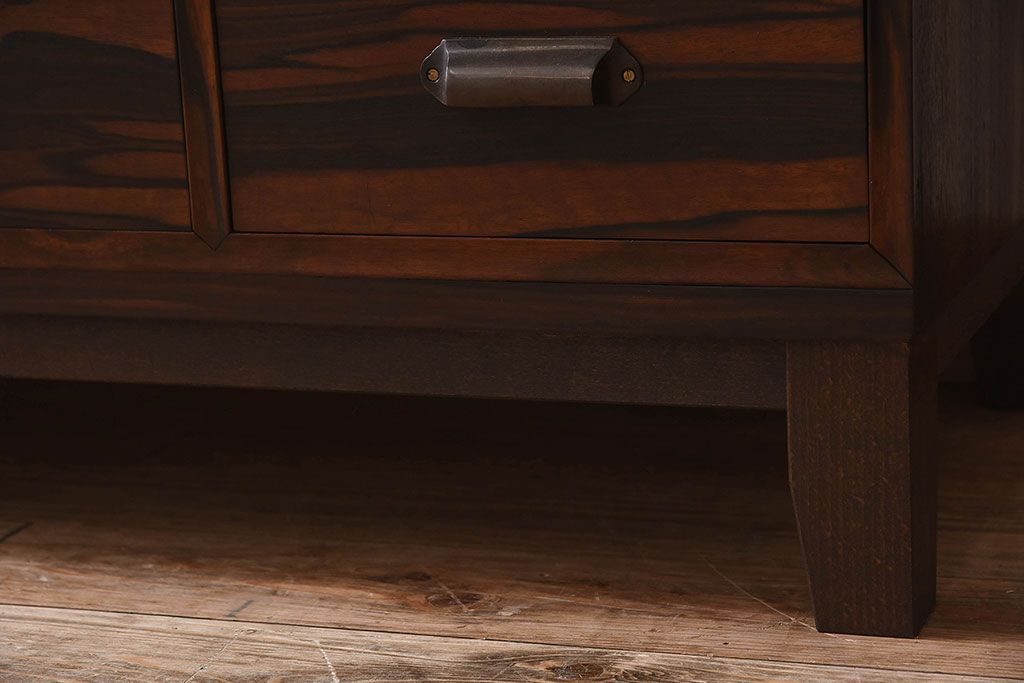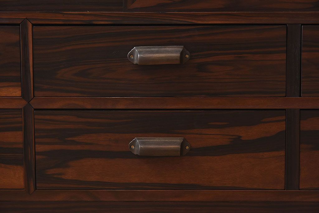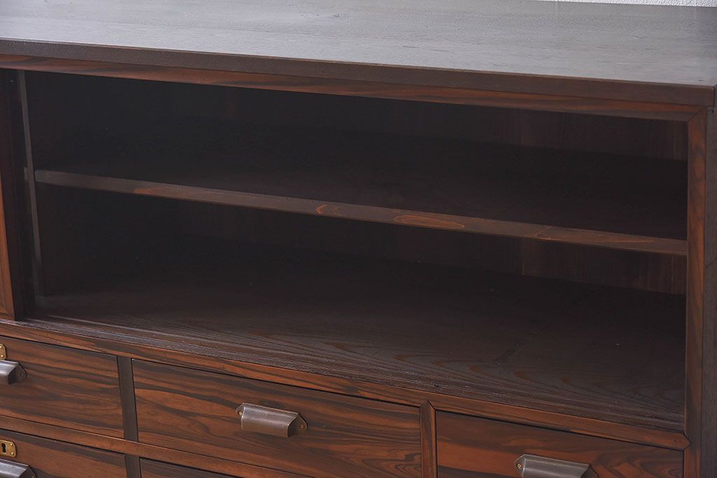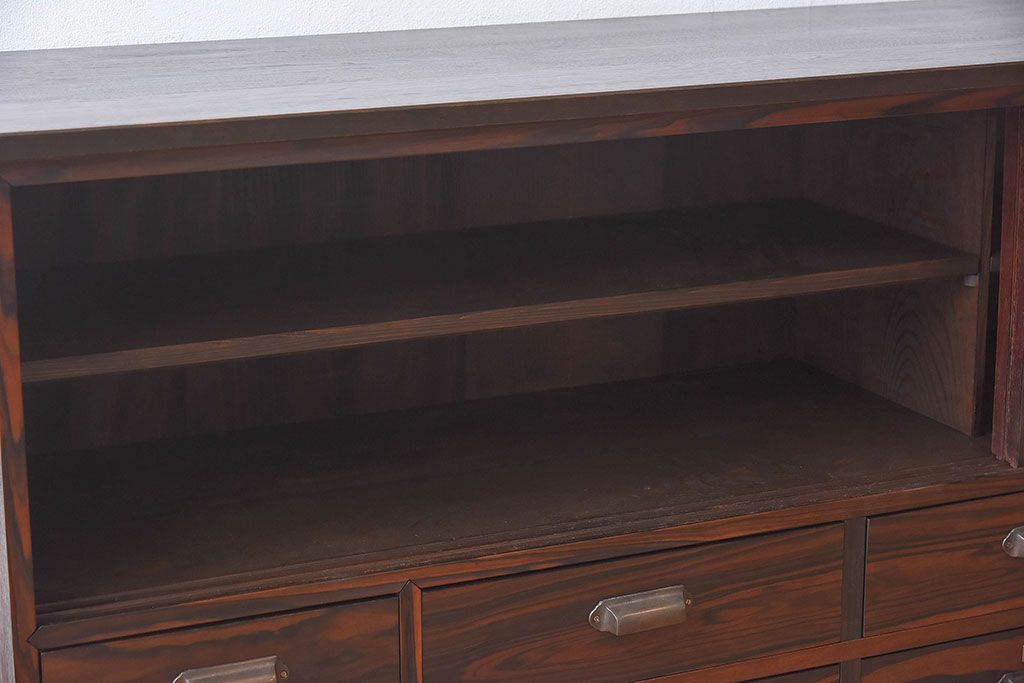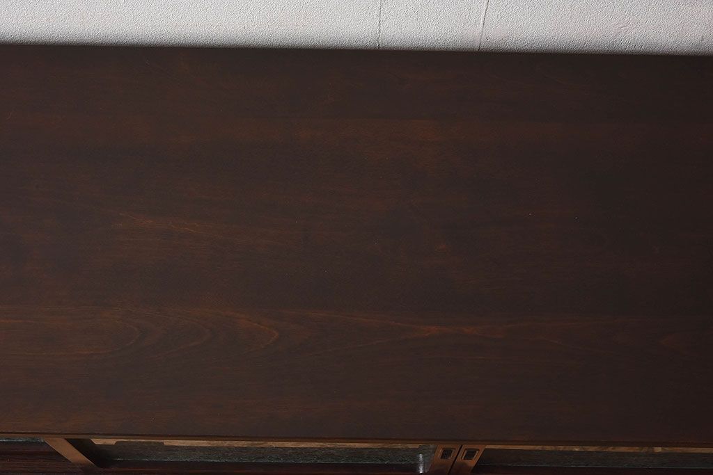 前面黒檀材 脚付き 結霜ガラス入り4枚引き戸のアンティークローボードです。