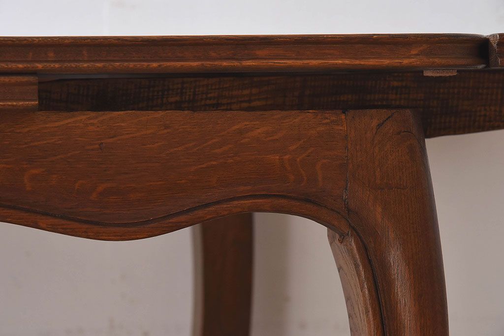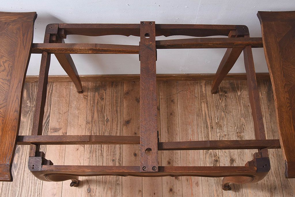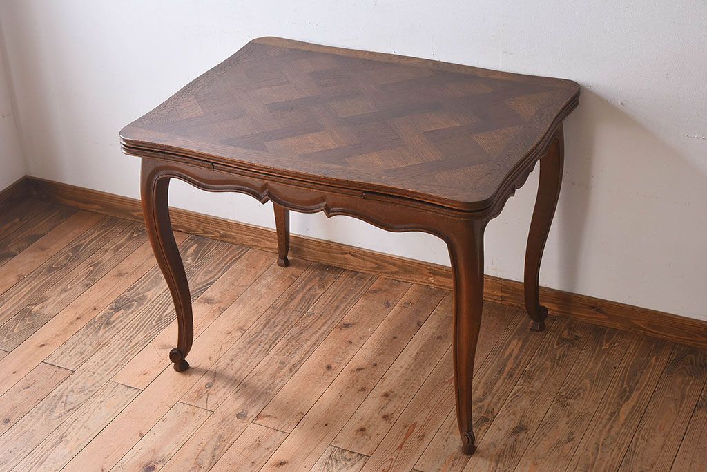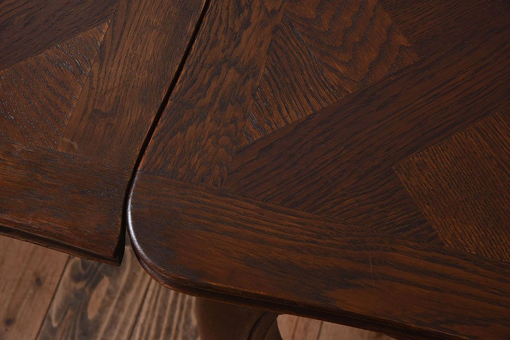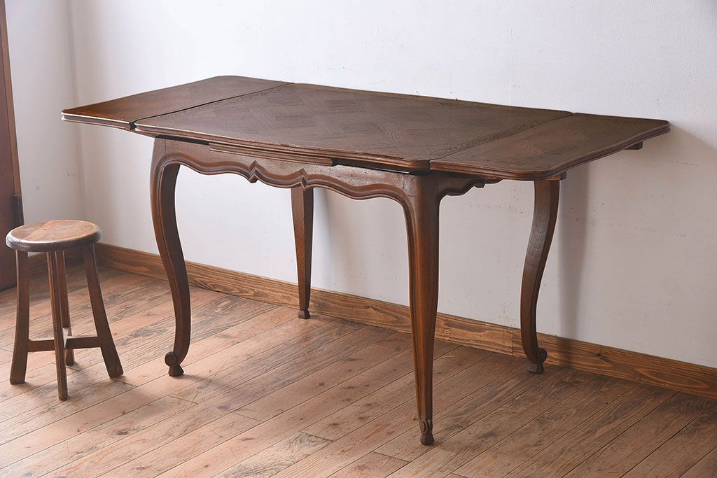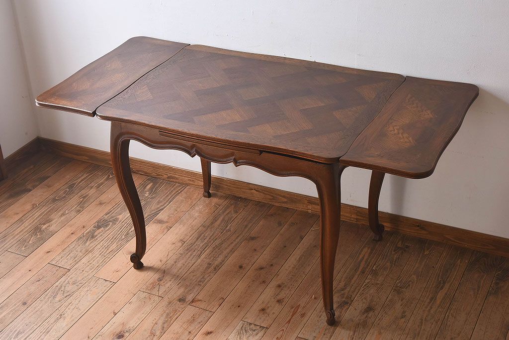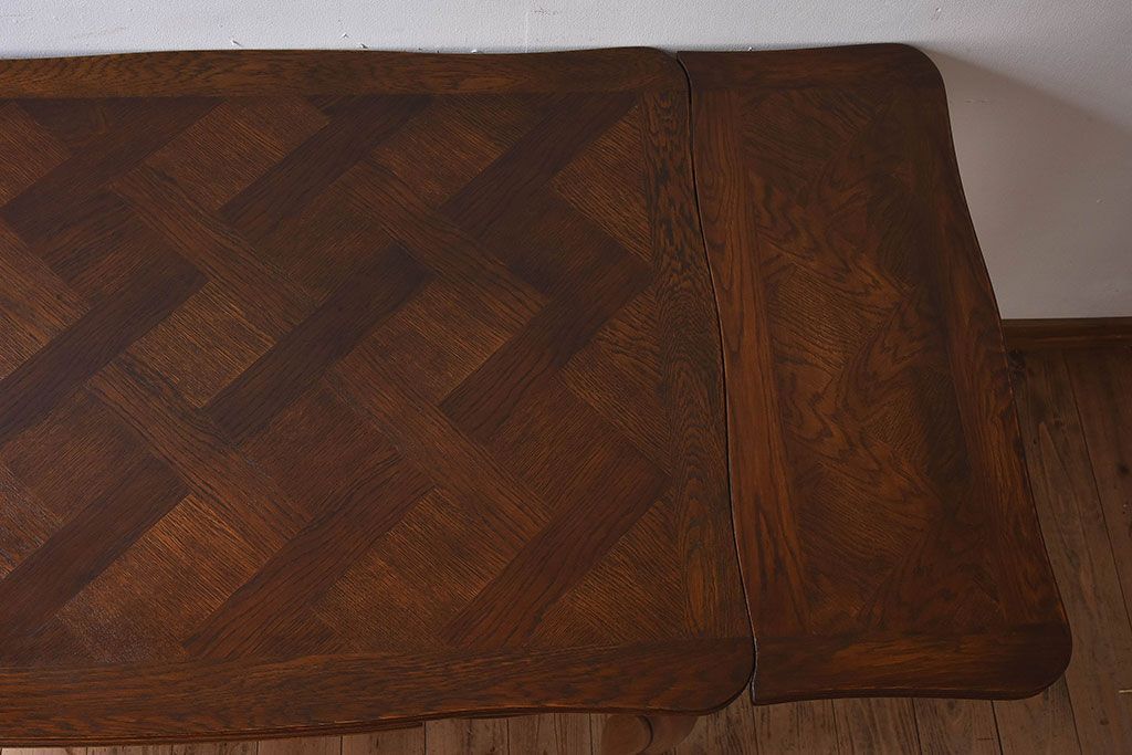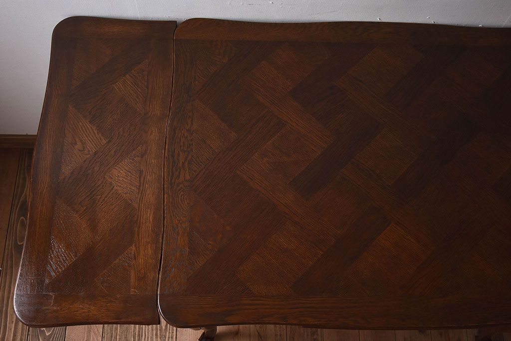 アンティーク家具 フランスアンティーク オーク材 パーケット天板と猫脚のデザインが素敵なエクステンションテーブル