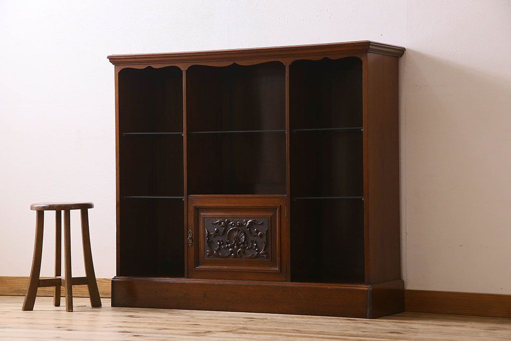 ラフジュ工房> オープンラック・シェルフ> 本棚 > アンティーク家具 英国製 マホガニー材 彫刻が美しい上品な飾り棚(陳列棚)