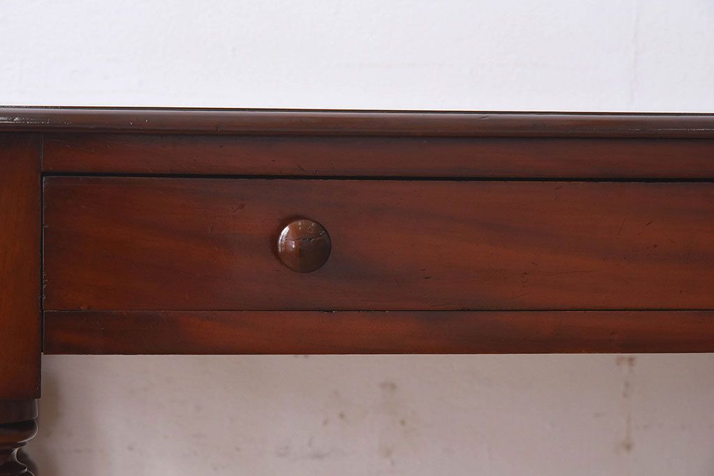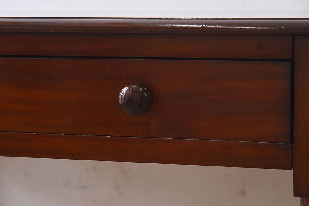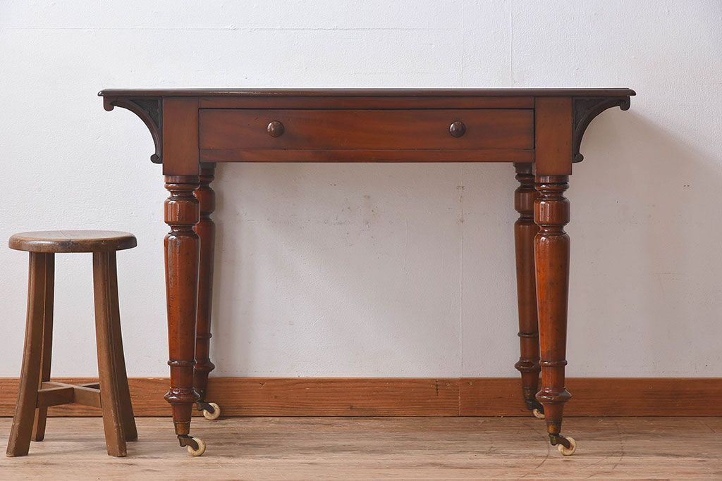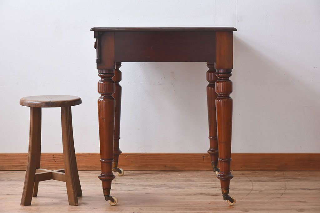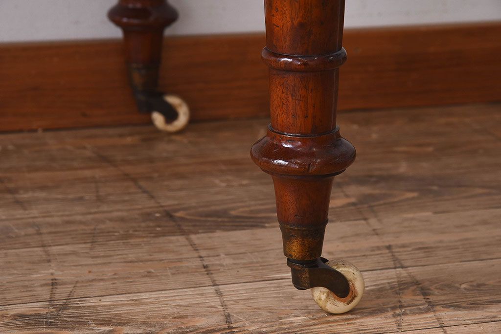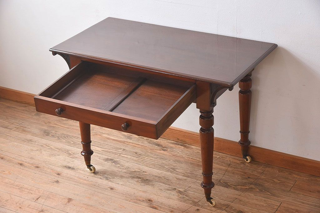 アンティーク家具 イギリスアンティーク マホガニー材 上品なデザインのキャスター付き平机(デスク)
