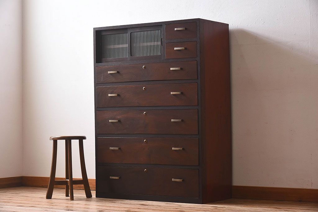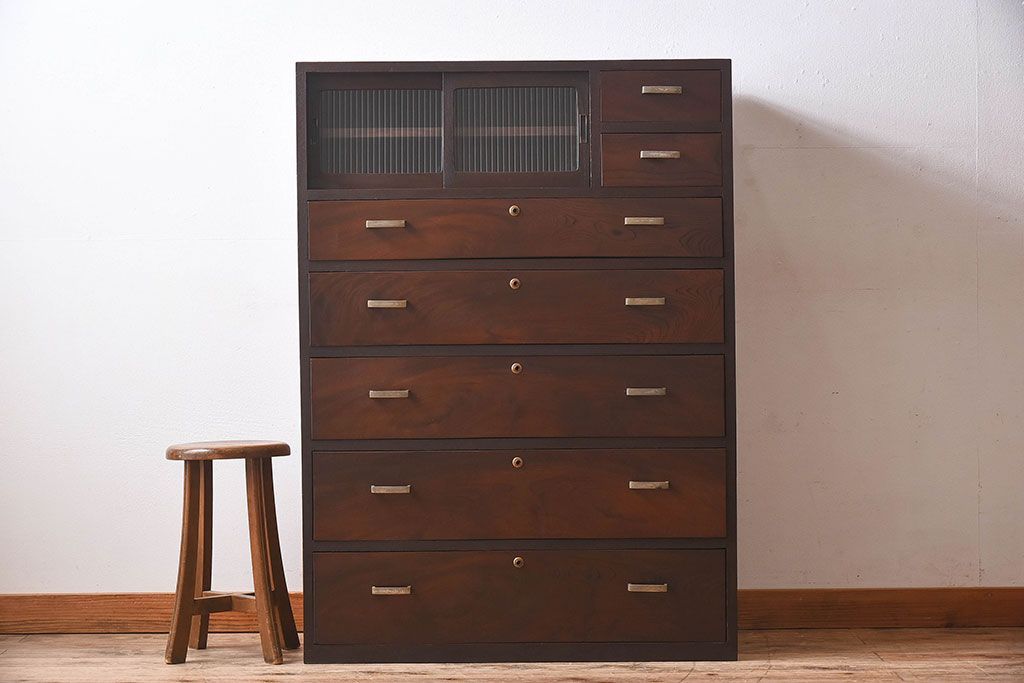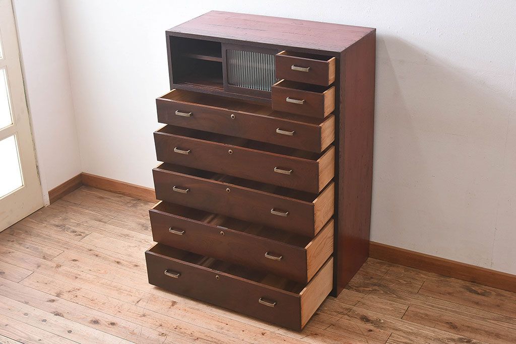 レトロ家具 昭和レトロ 前面栗材製 モールガラス入り!衣装箪笥(引き出し、チェスト)