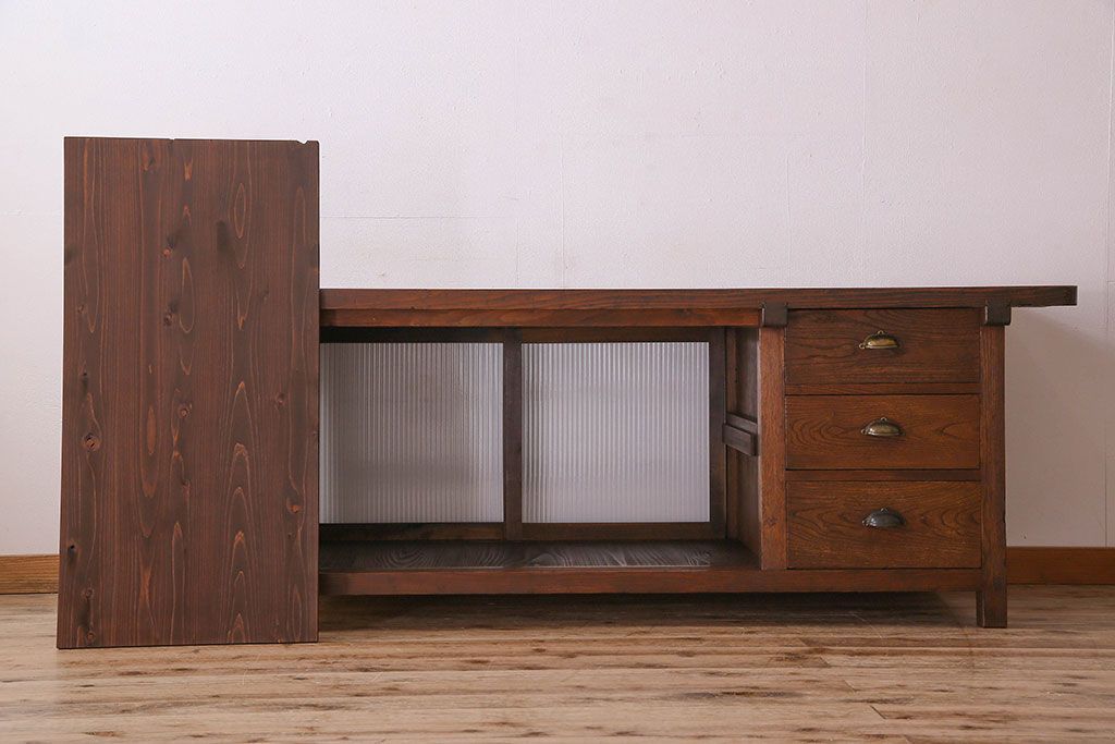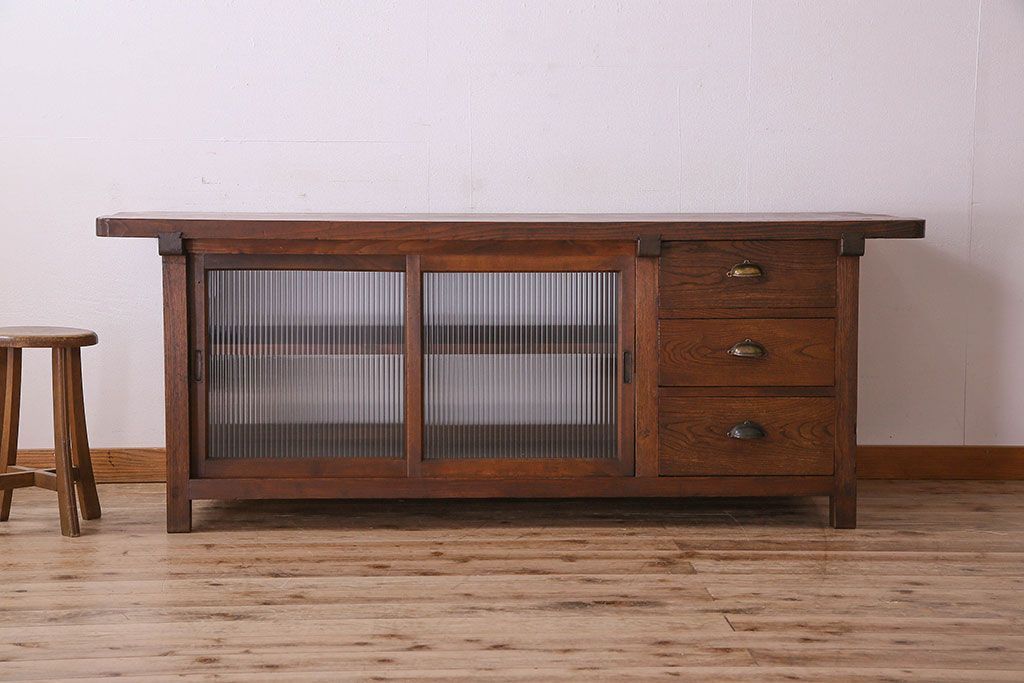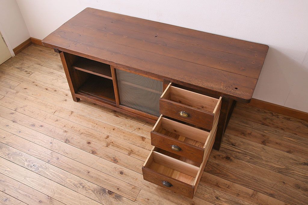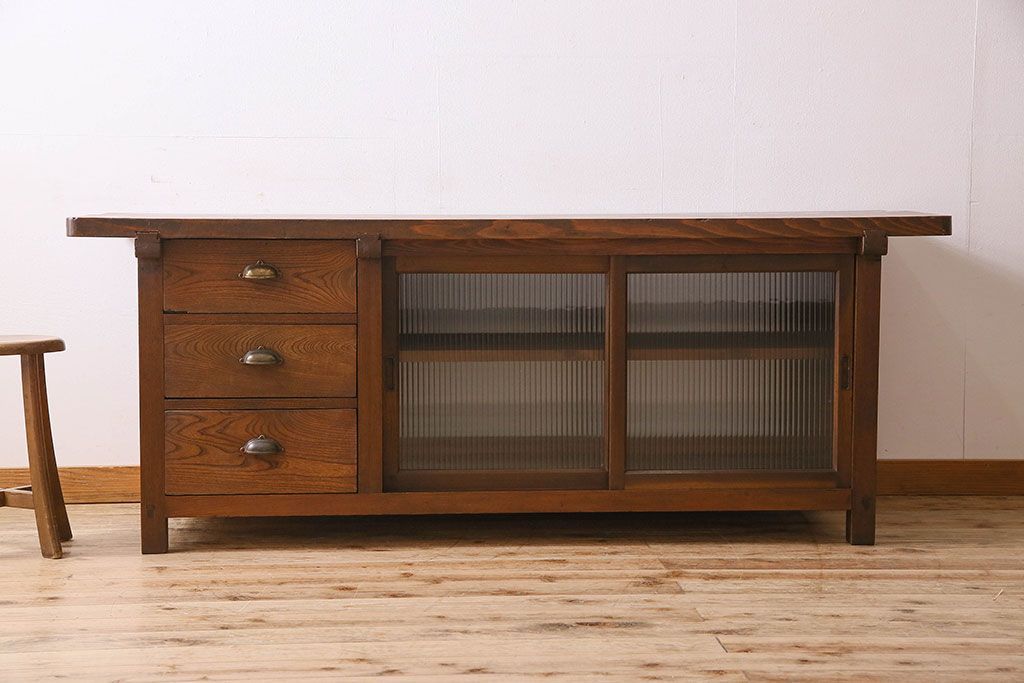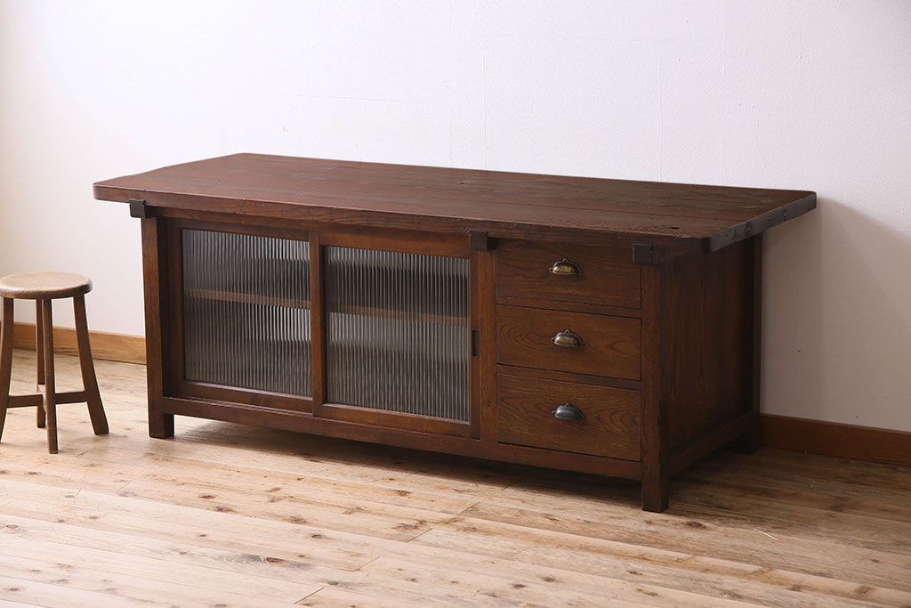 珍しい両面使い仕様!モールガラス引き戸のアンティーク作業台です。