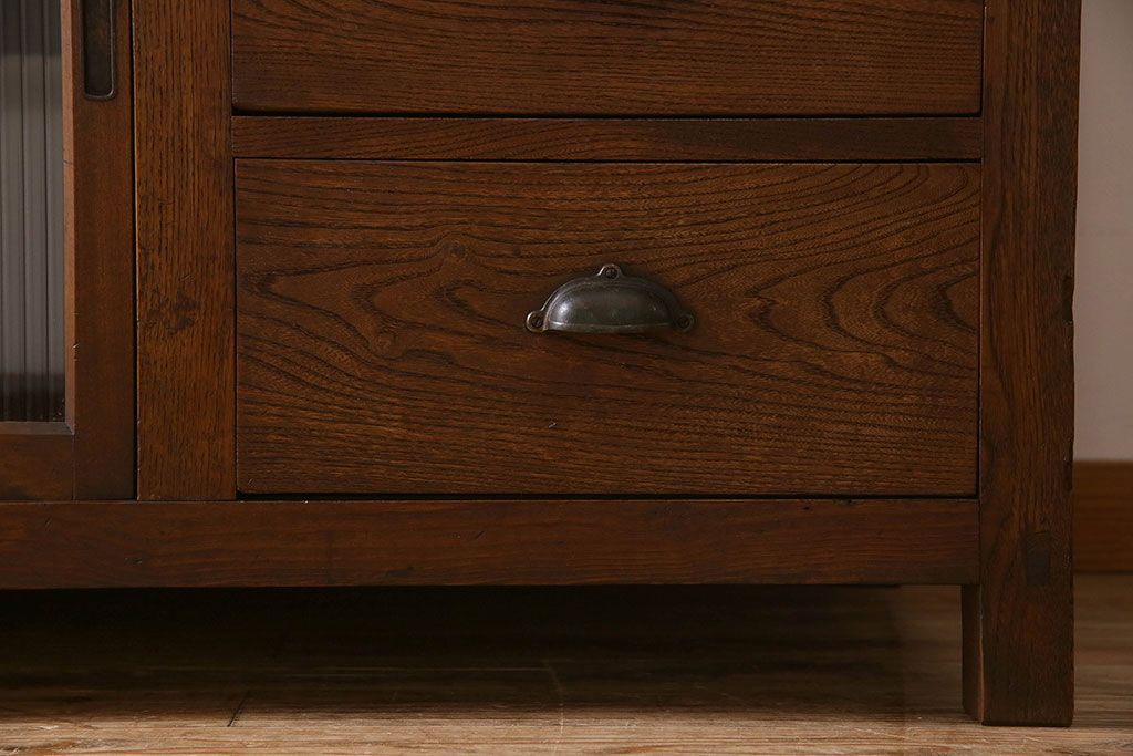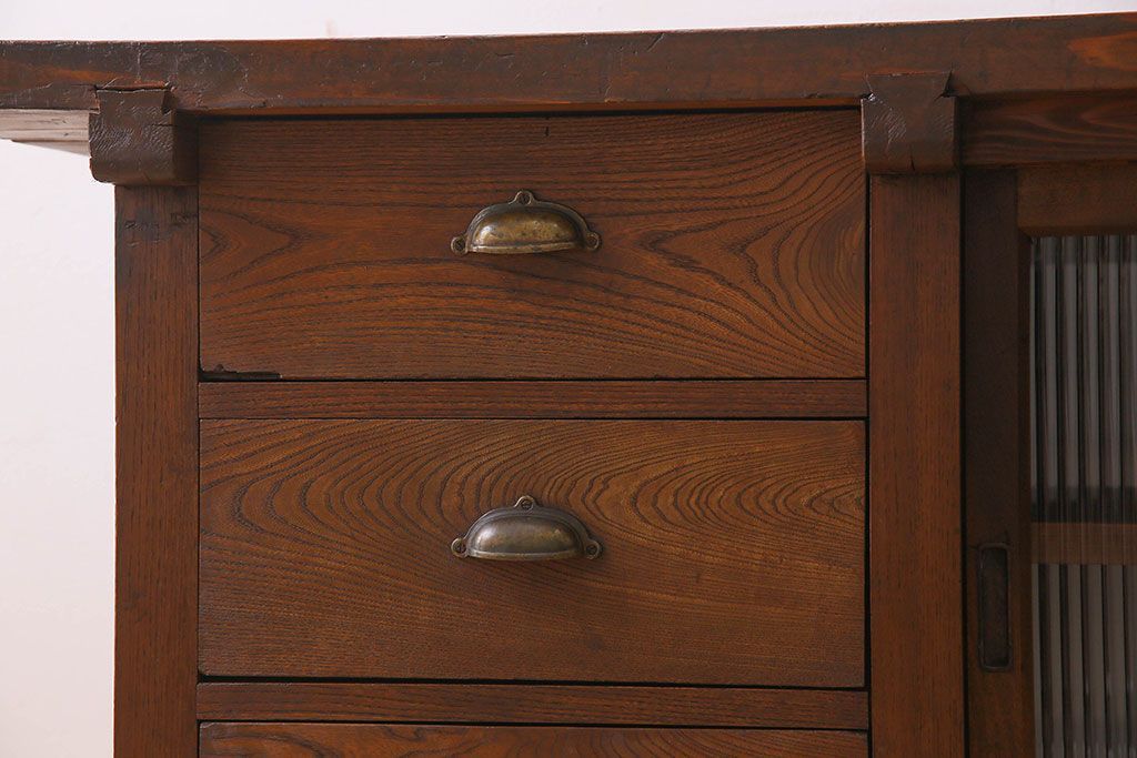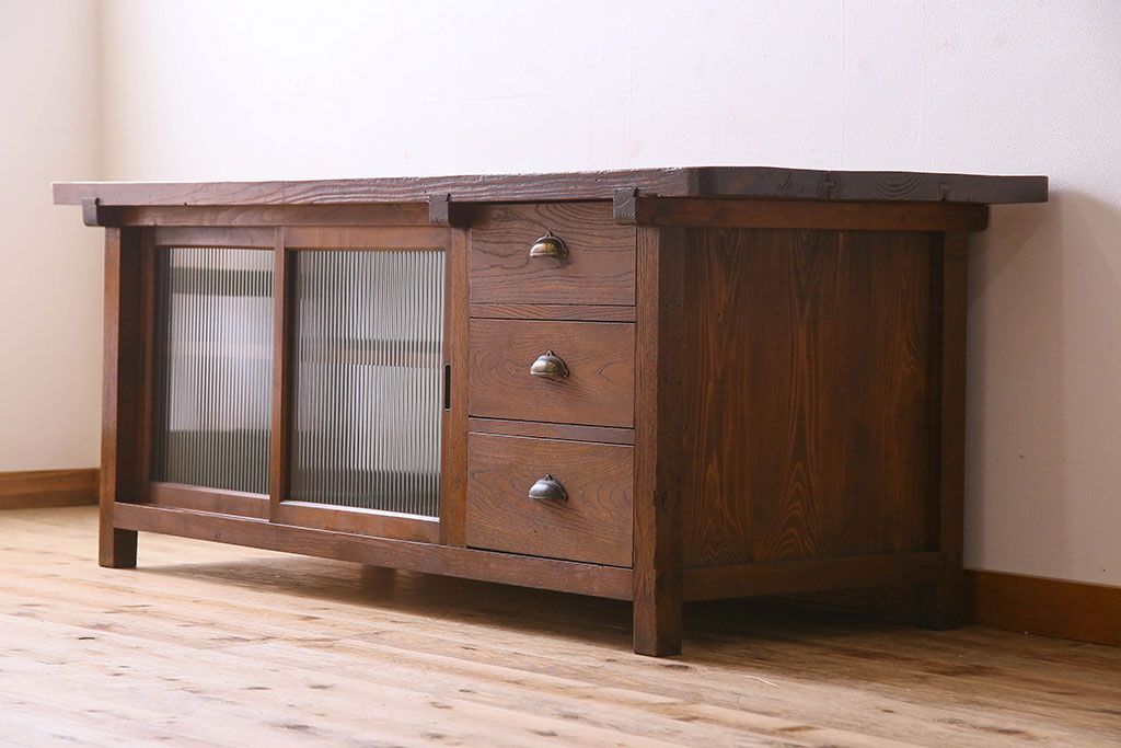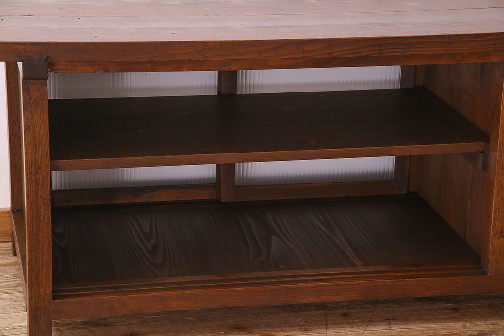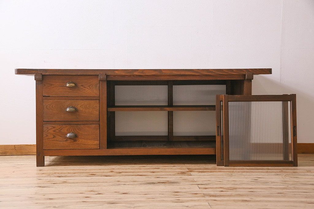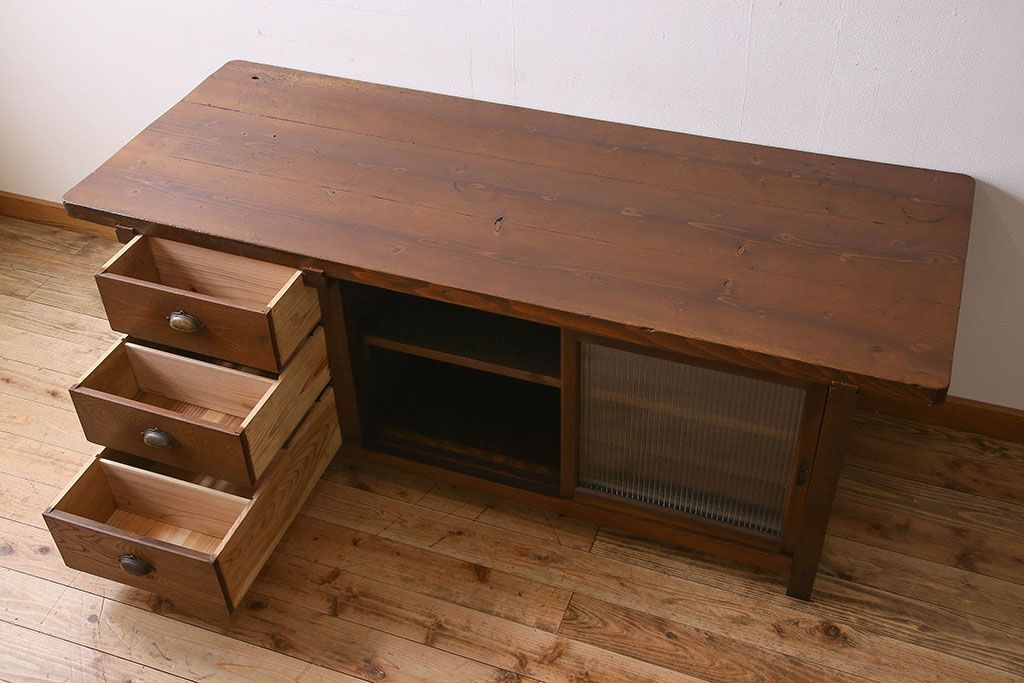 珍しい両面使い仕様!モールガラス引き戸のアンティーク作業台です。