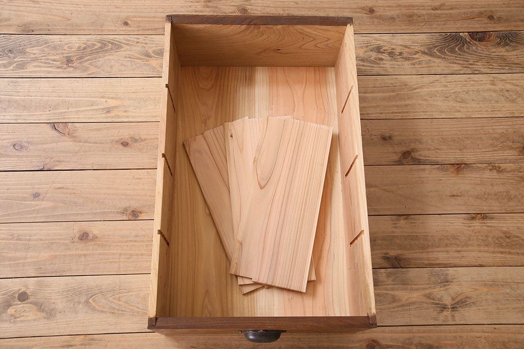 天板は松材、フレームは栗材、引き戸はカバ材で作られたお品です。