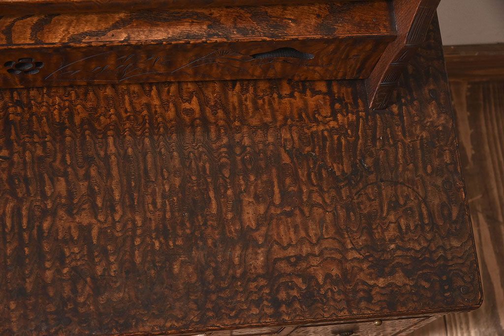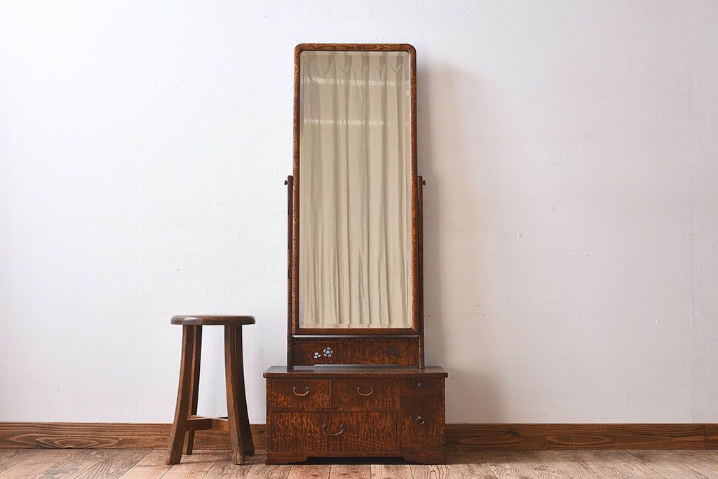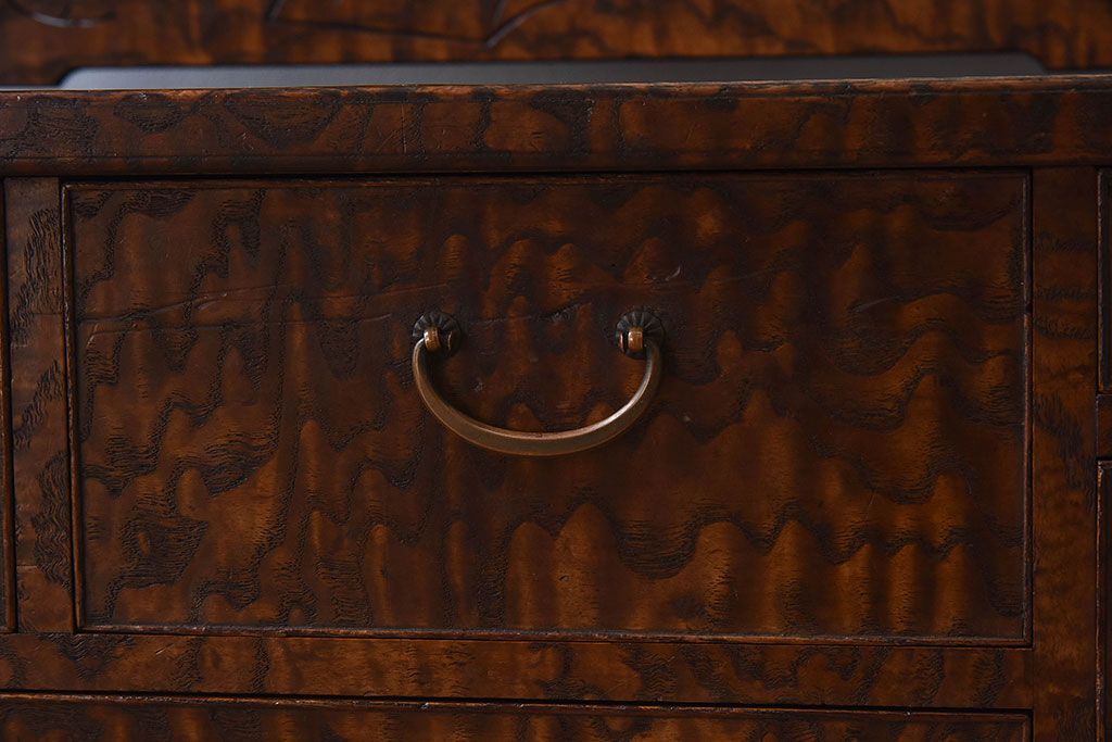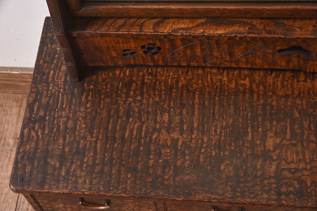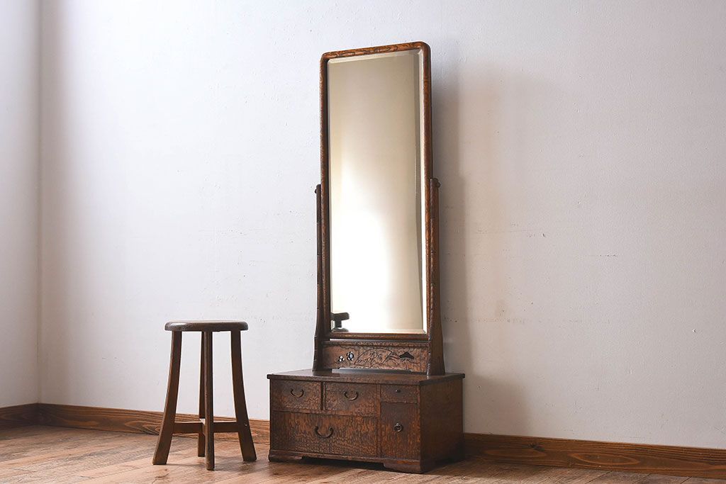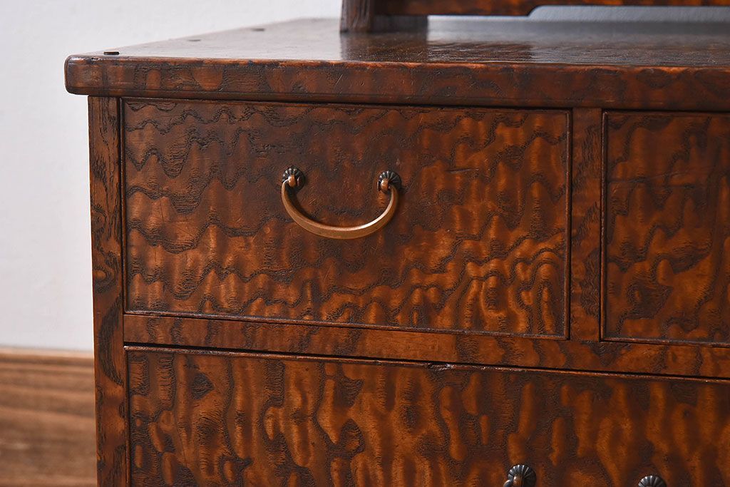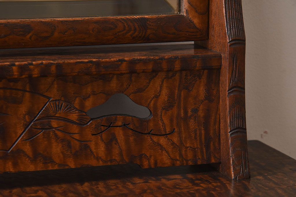 アンティーク雑貨 和製アンティーク タモ玉杢材 透かし彫りが素敵な鏡台(化粧台)