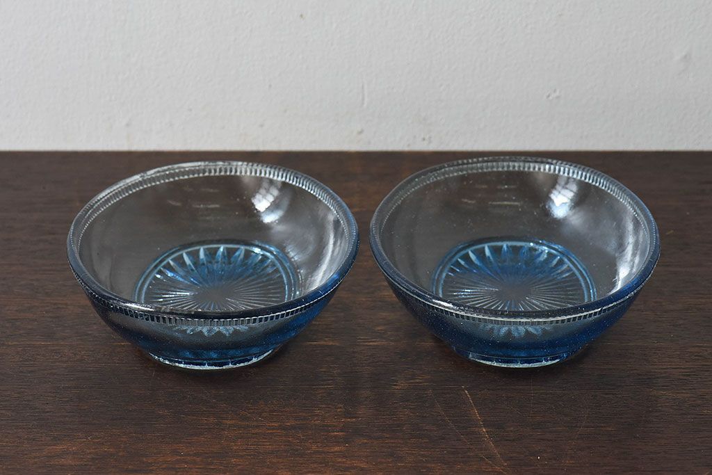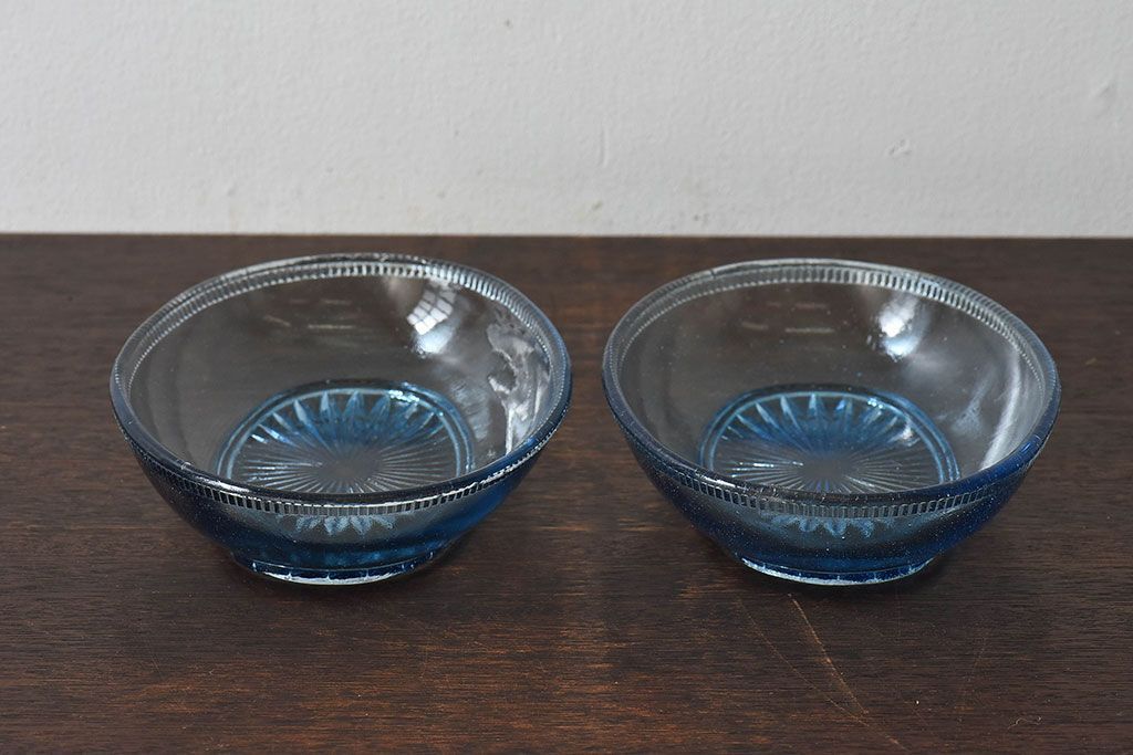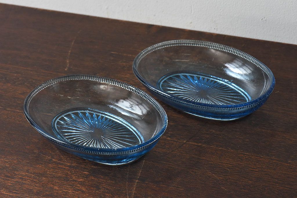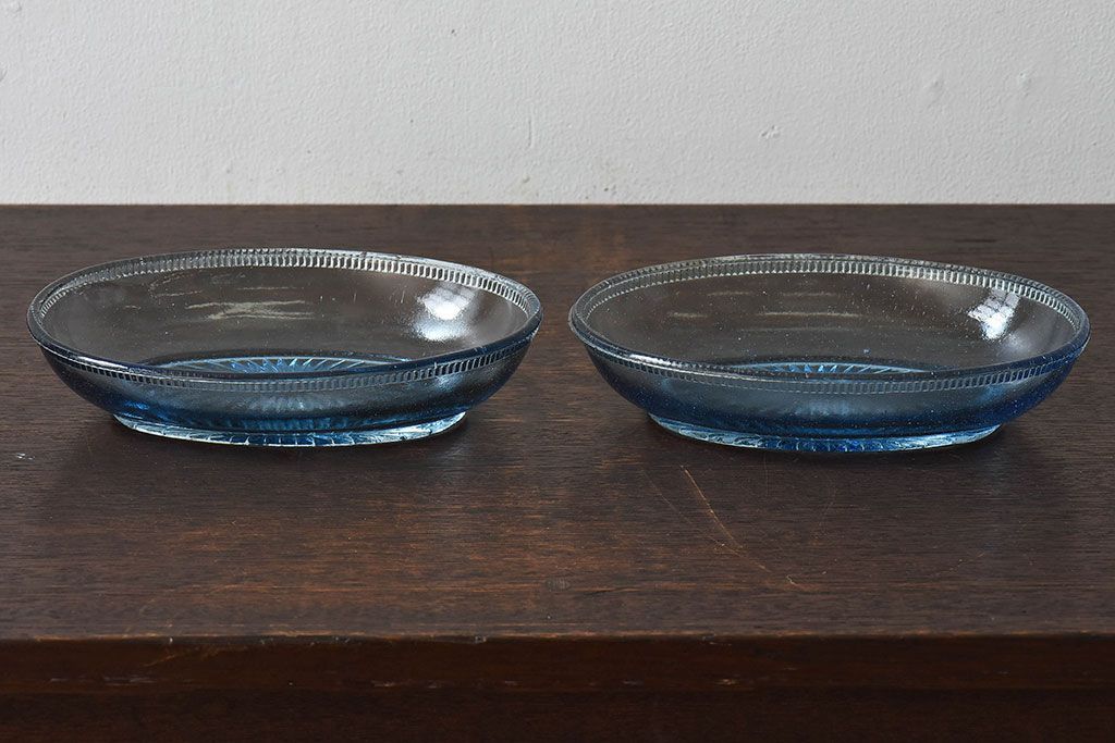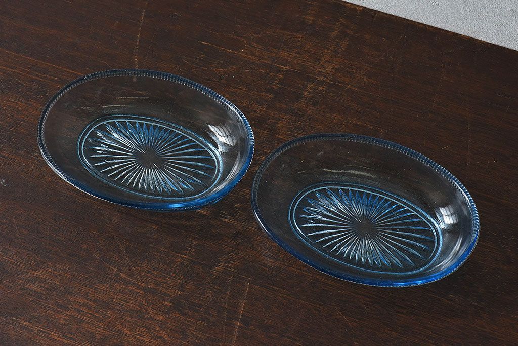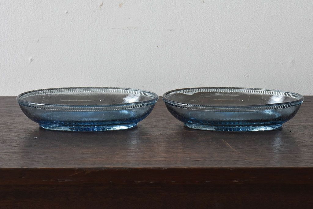 アンティーク雑貨 昭和レトロ 水色が涼しげなプレスガラス製の長皿(器)2枚セット