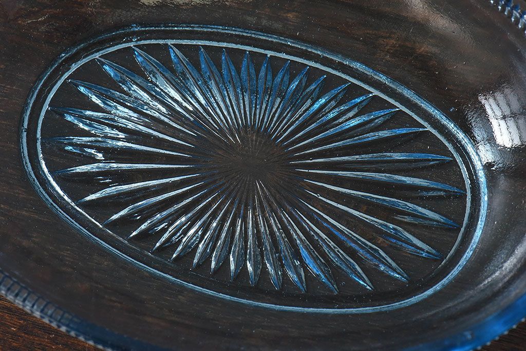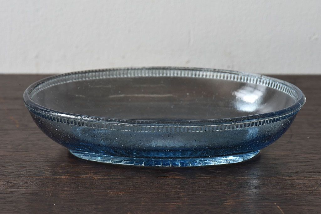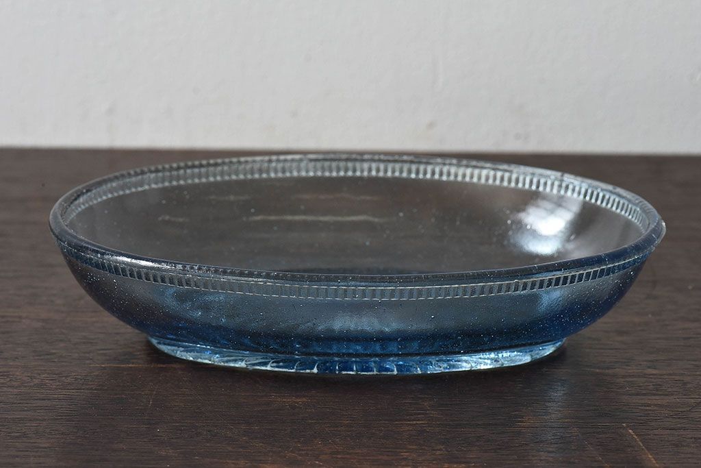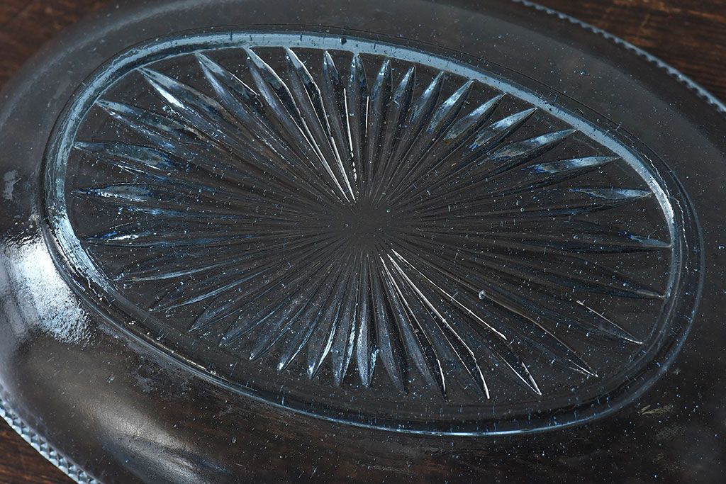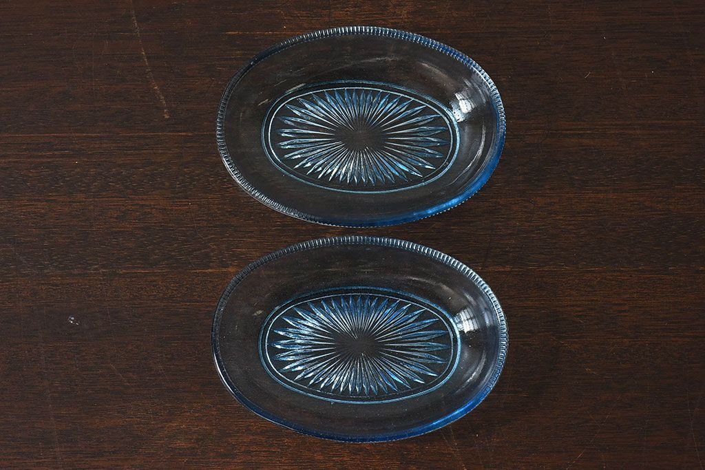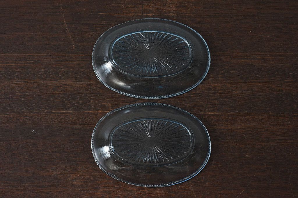 ラフジュ工房> 骨董・美術品> 骨董-ガラス食器 > アンティーク雑貨 昭和レトロ 水色が涼しげなプレスガラス製の長皿(器)2枚セット