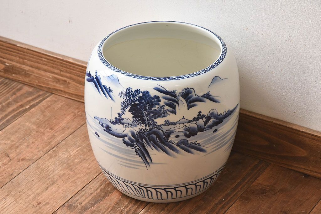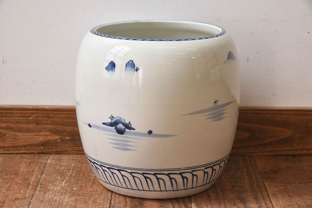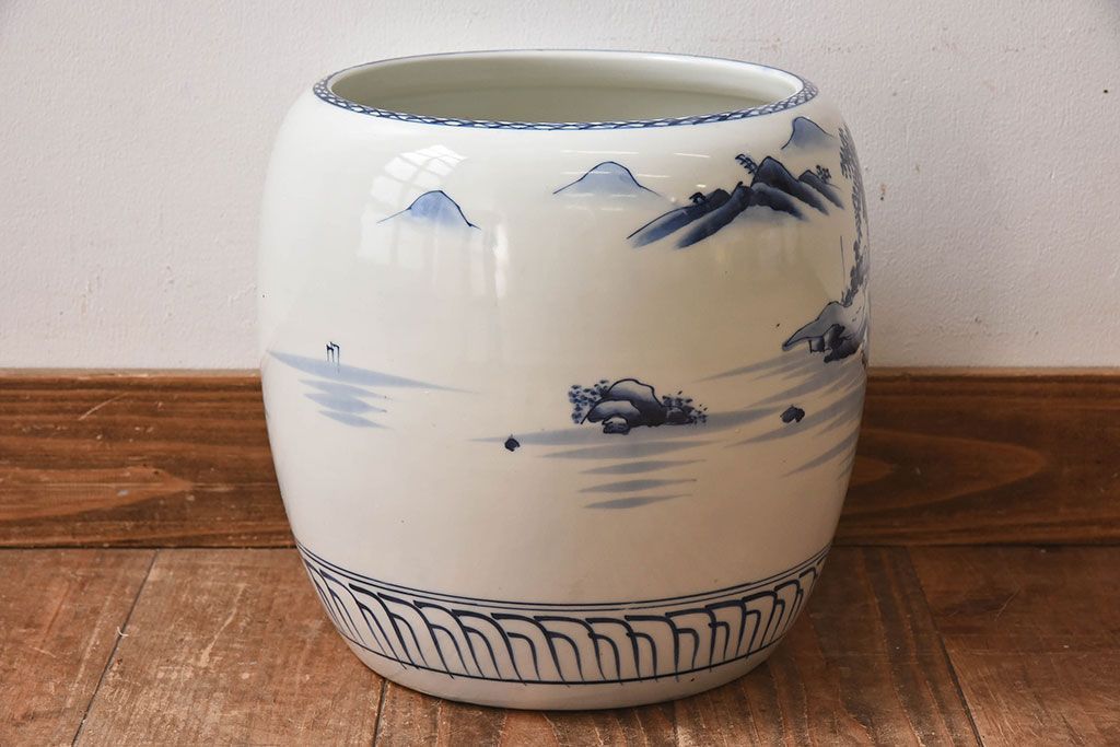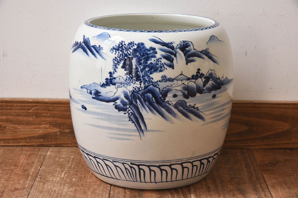 古民具・骨董 山水図で覆われたアンティーク瀬戸火鉢(鉢カバー)です。