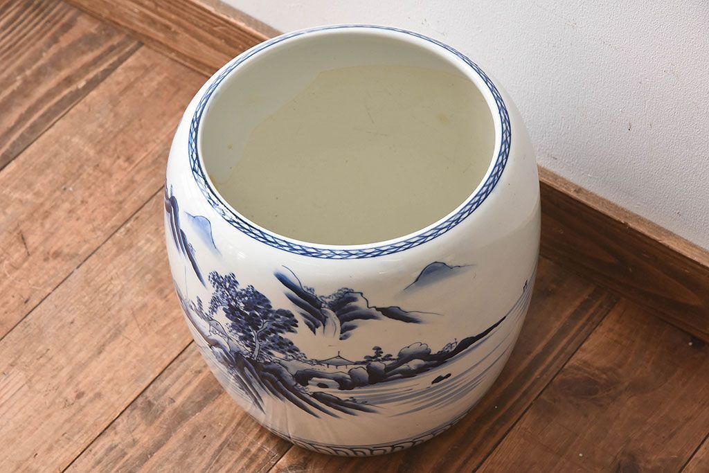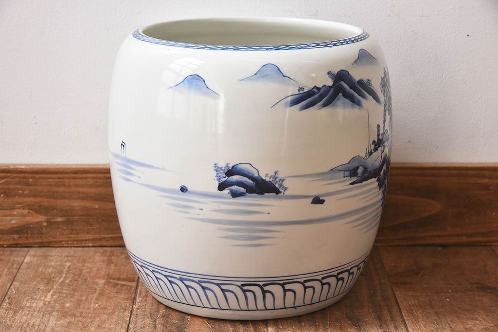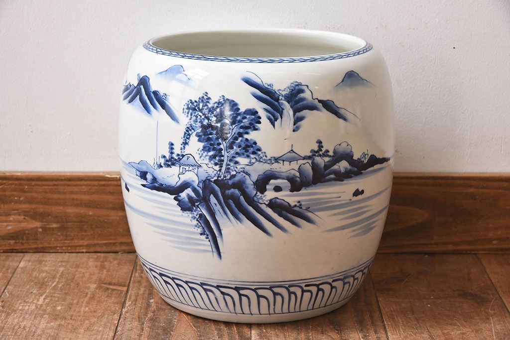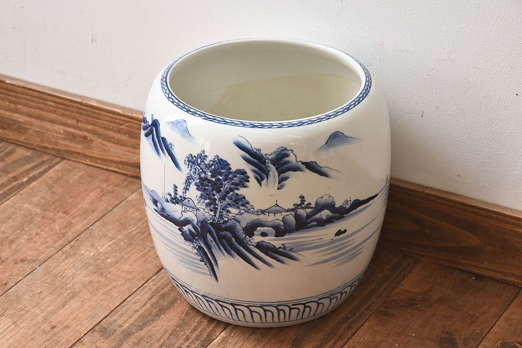 古民具・骨董 山水図で覆われたアンティーク瀬戸火鉢(鉢カバー)(2)です。