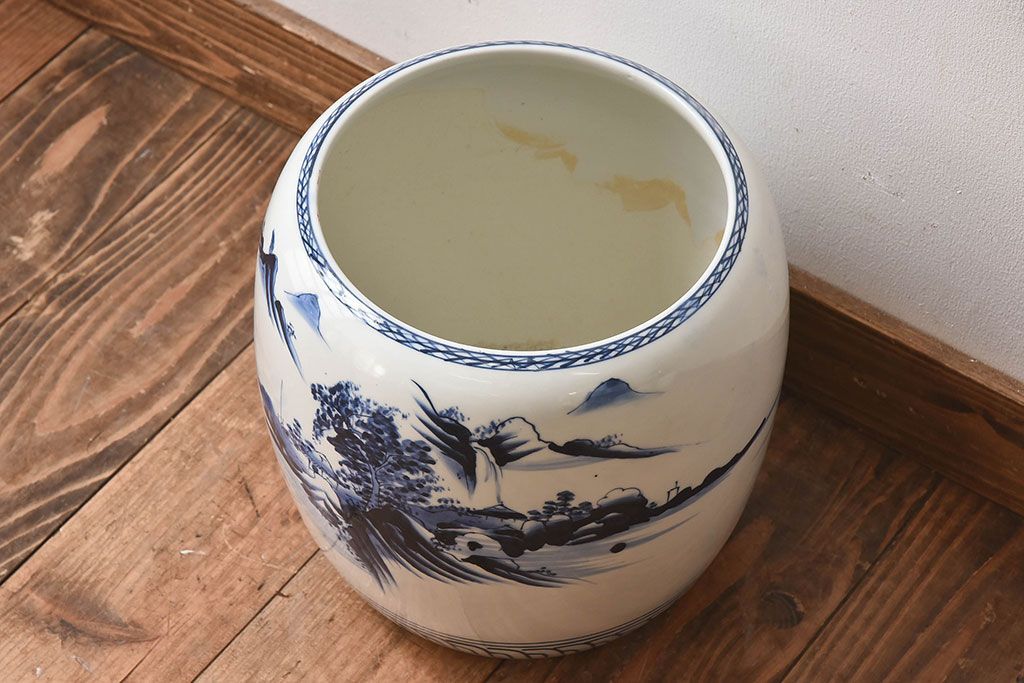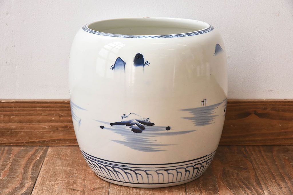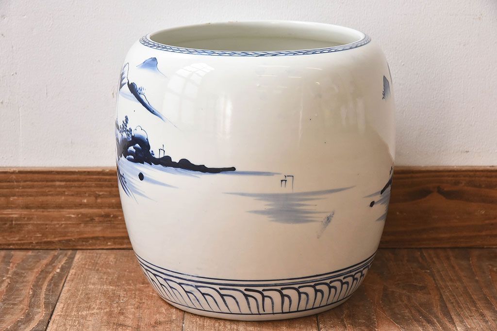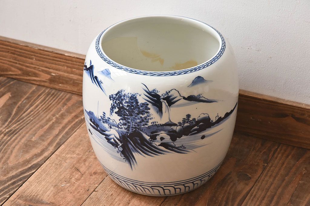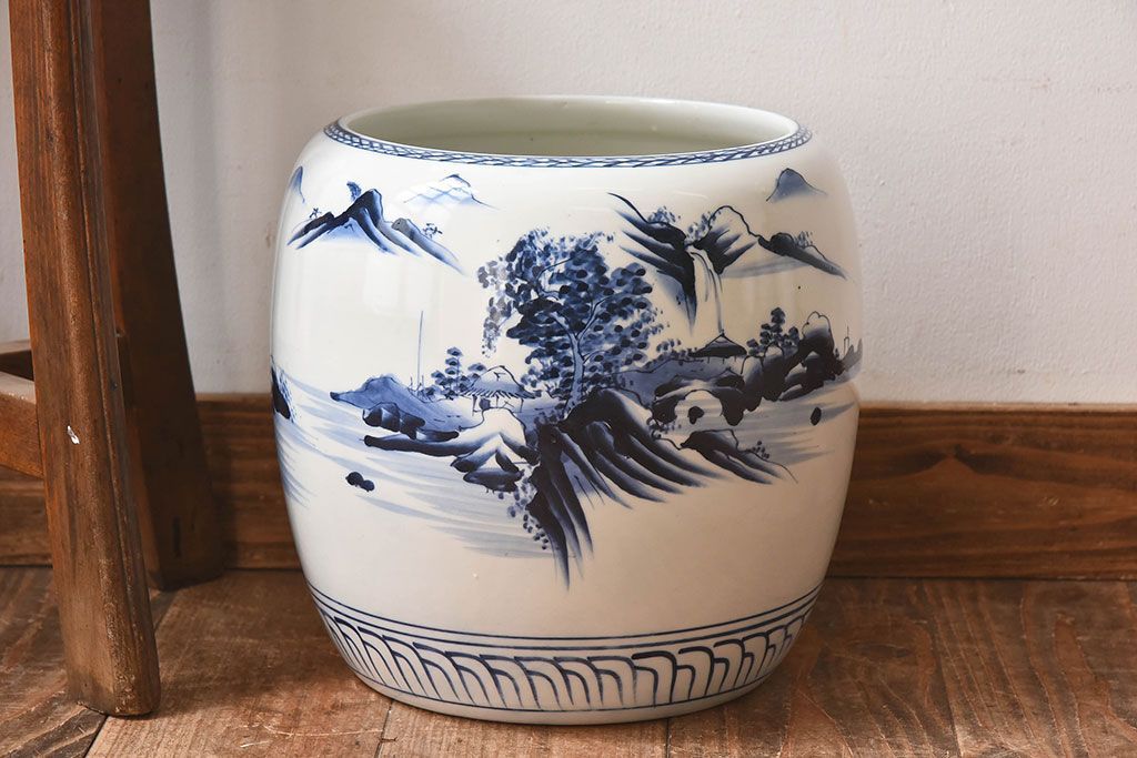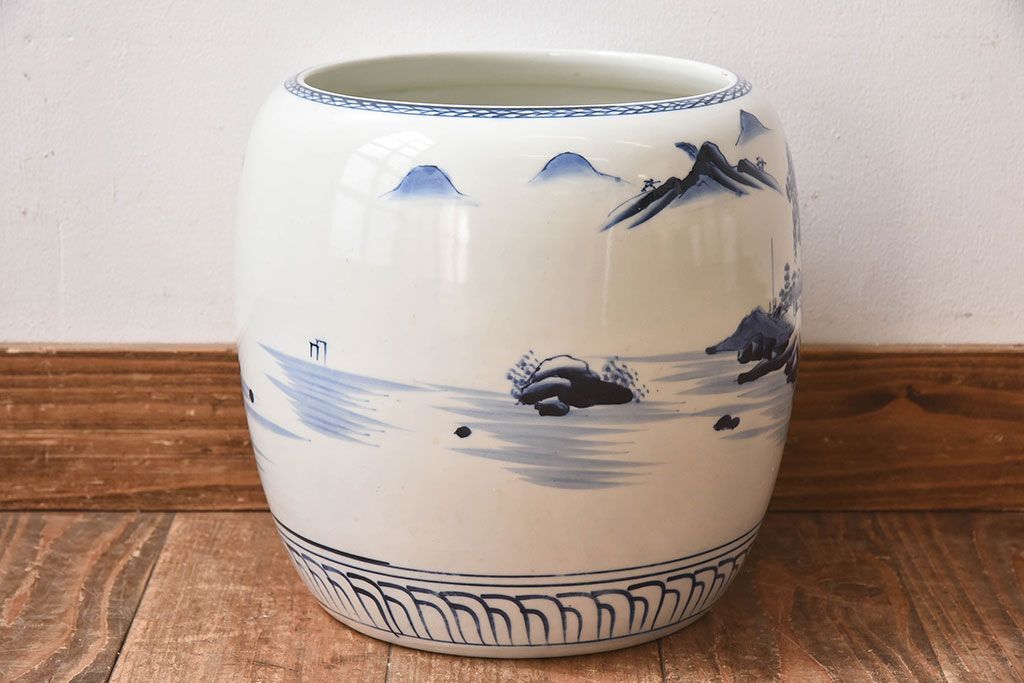 古民具・骨董 山水図で覆われたアンティーク瀬戸火鉢(鉢カバー)(3)です。