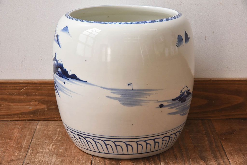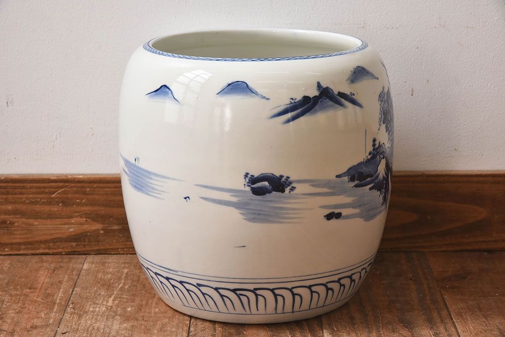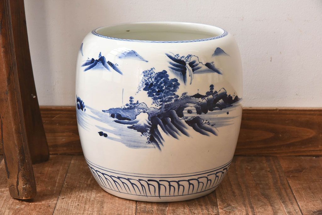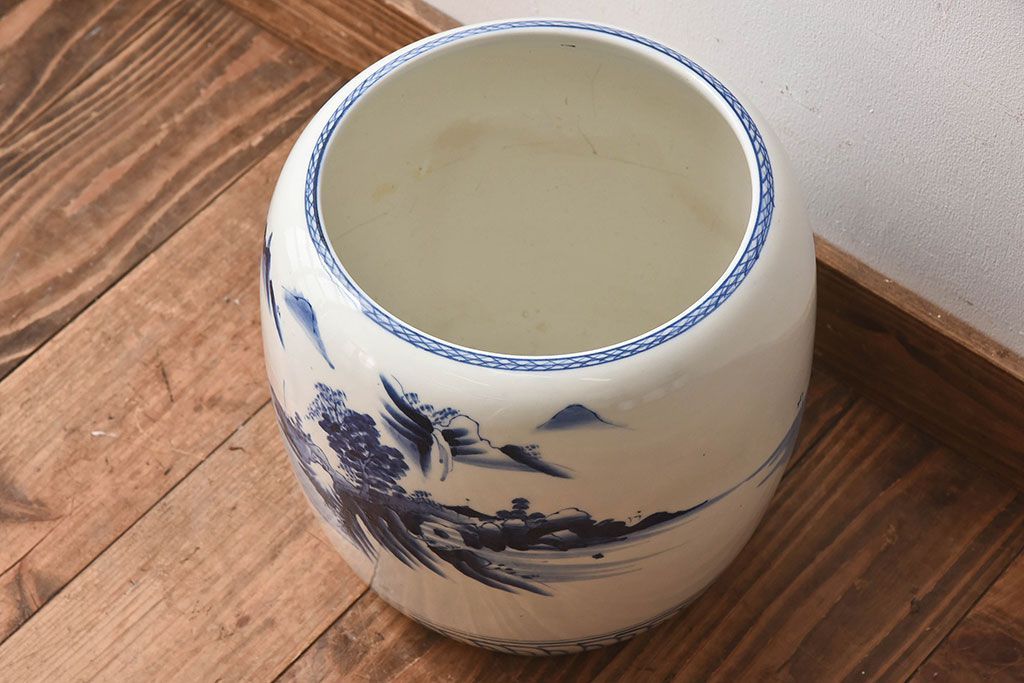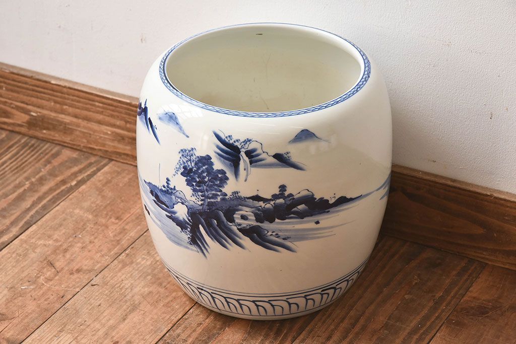 アンティーク雑貨 古民具・骨董 山水図が魅力的なアンティーク瀬戸火鉢(鉢カバー)