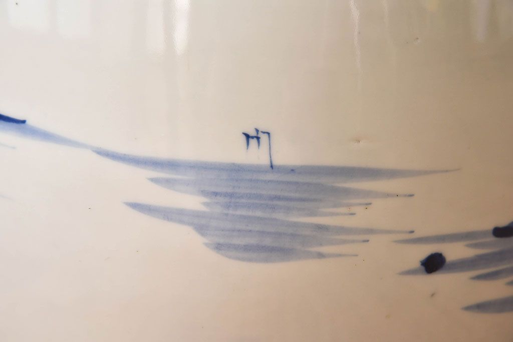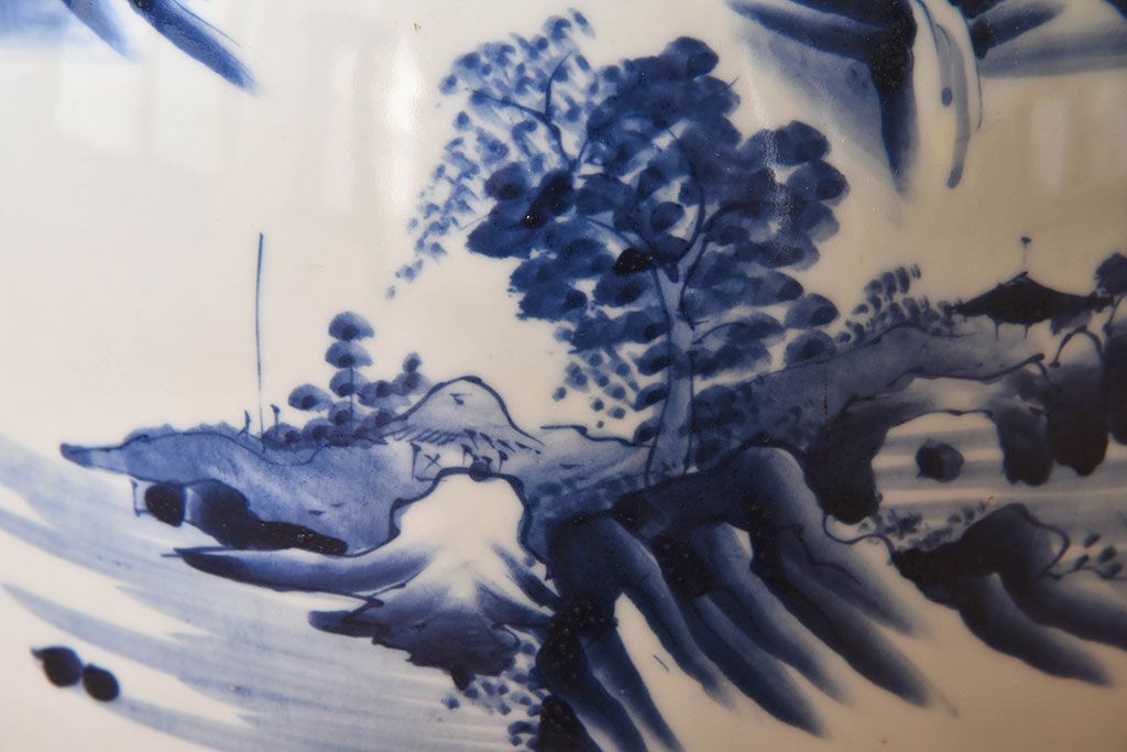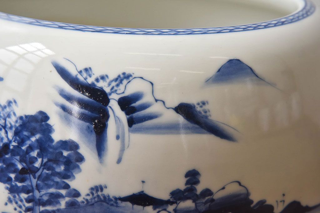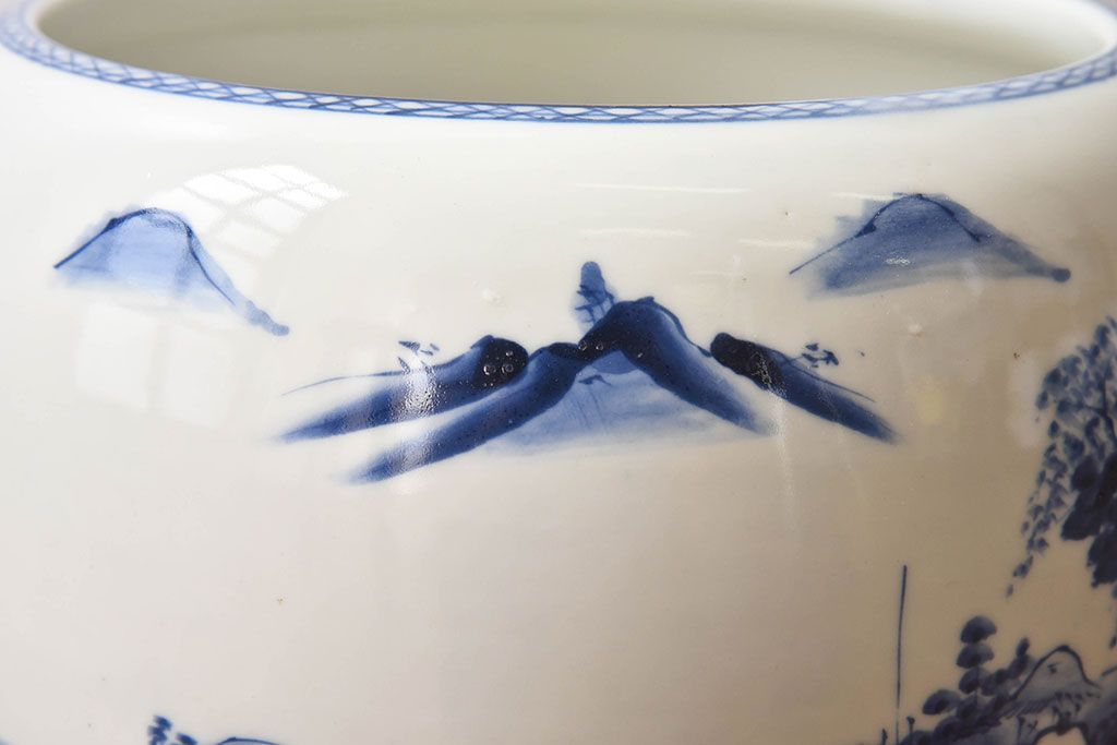 火鉢全体を覆う山水図の柄が魅力的な、
