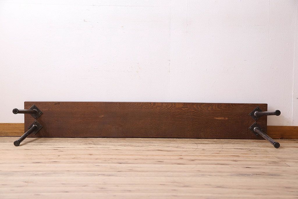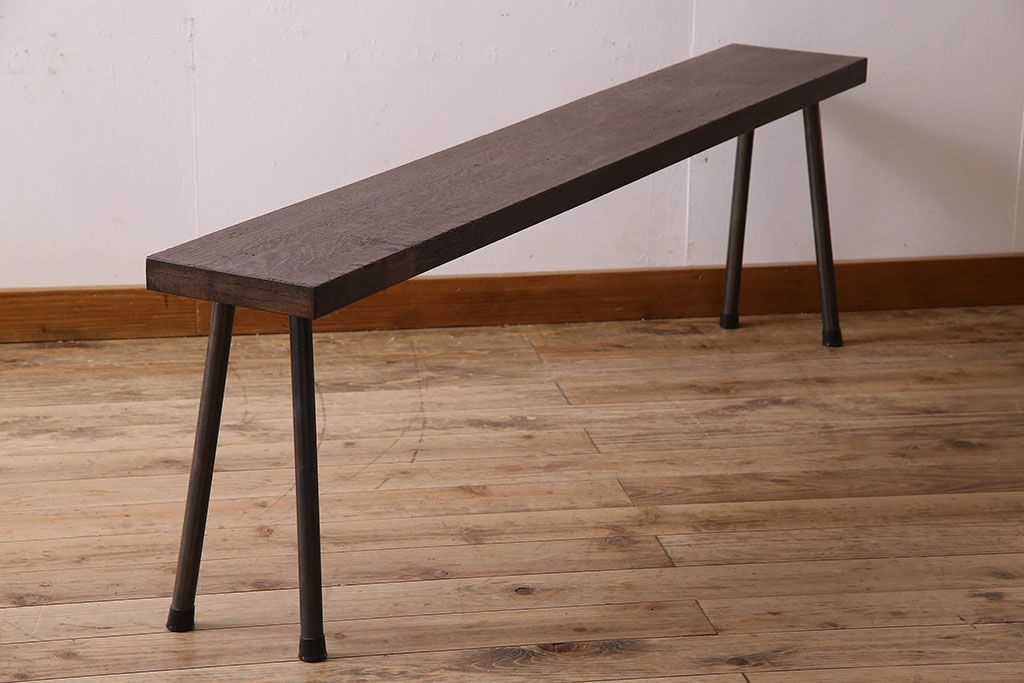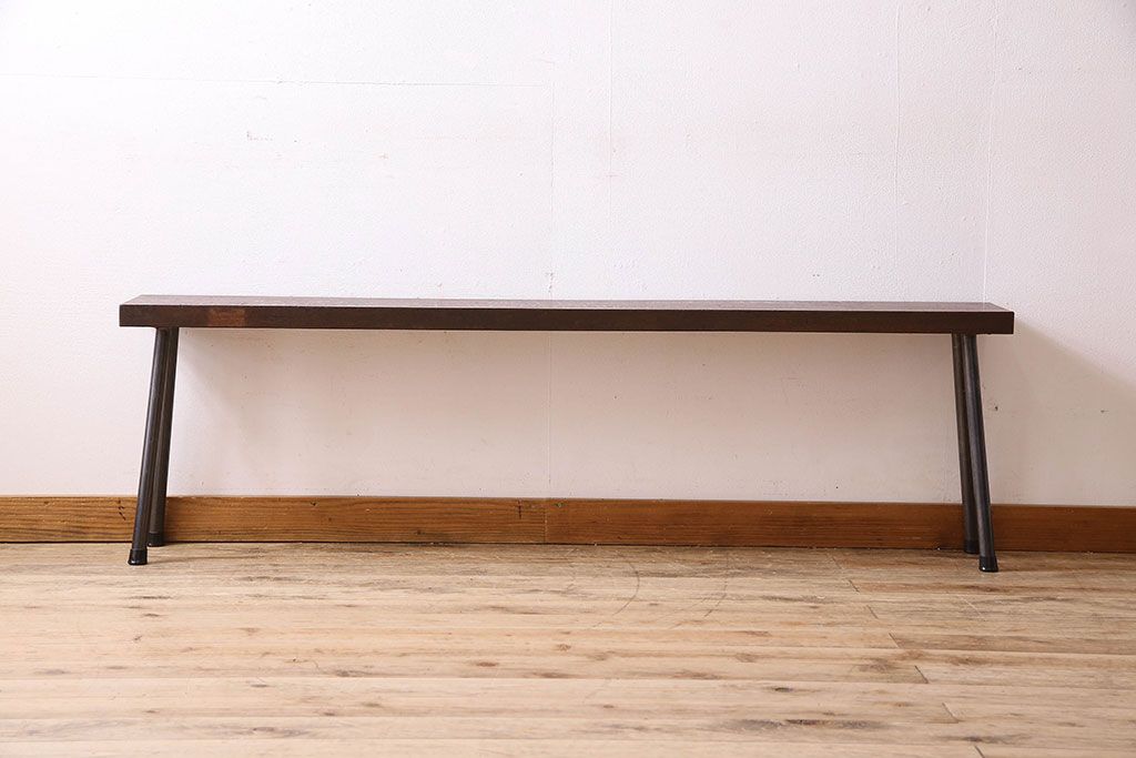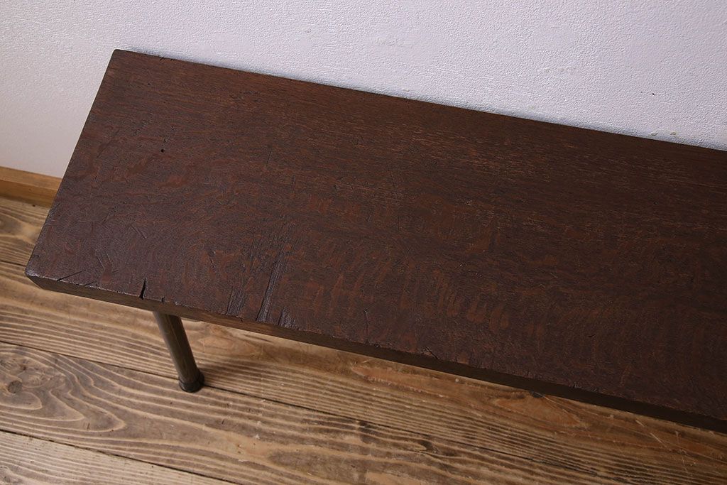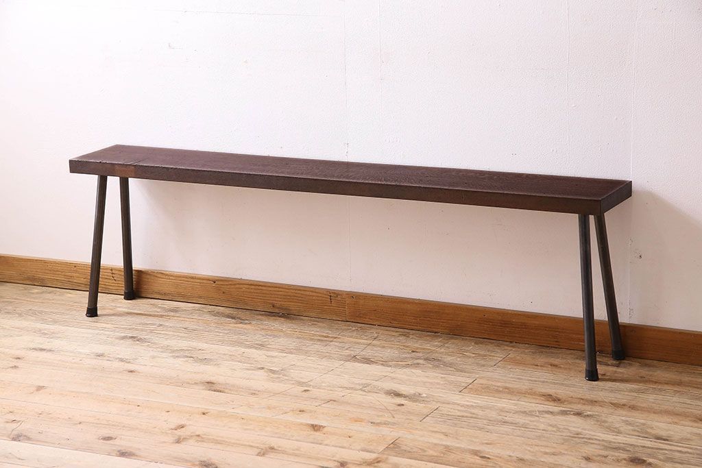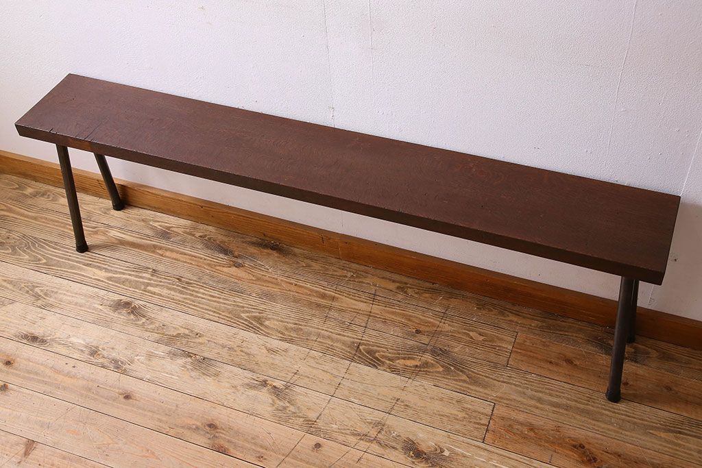 レトロ家具 昭和レトロ ナラ材一枚板 古材の質感が味わい深い鉄脚ベンチ(長椅子、アイアンベンチ)(1)