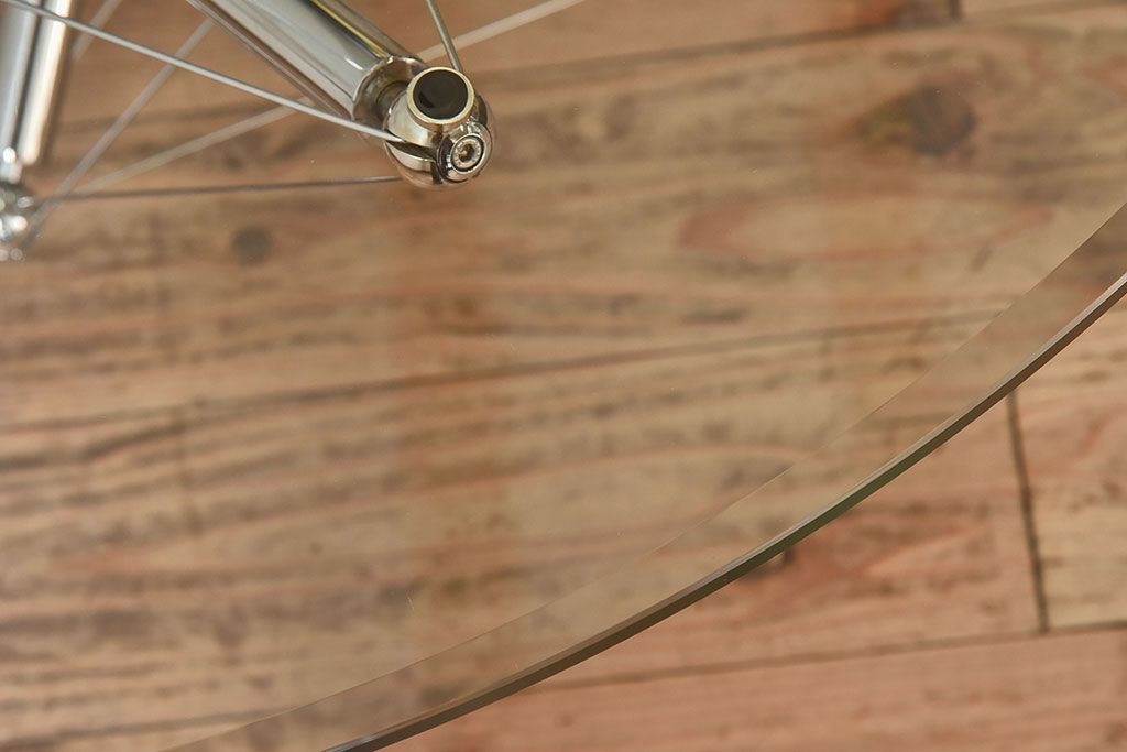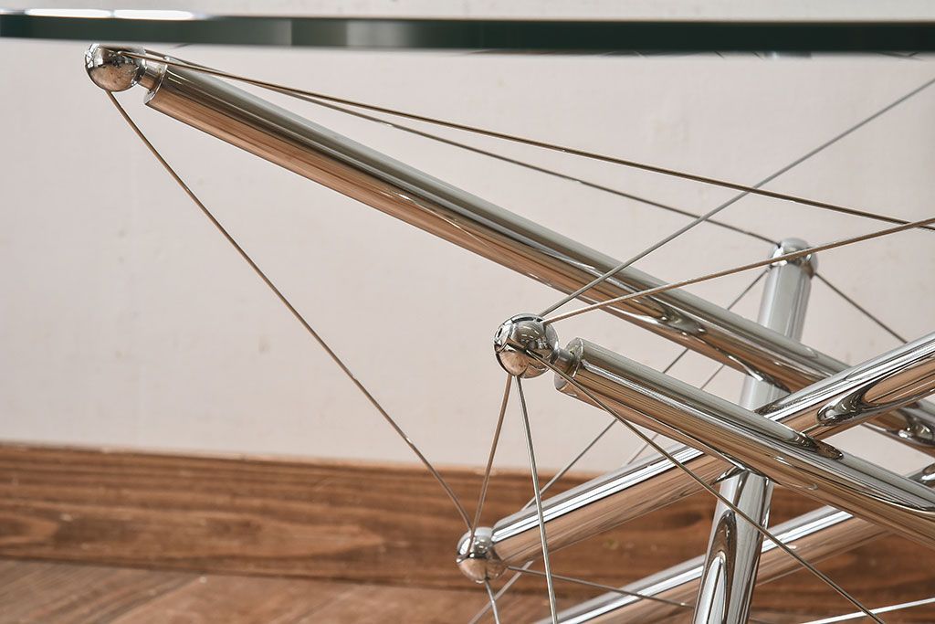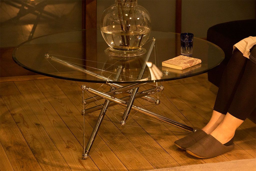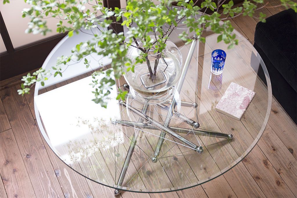 脚の不思議な造形が特徴的で、ガラス天板がデザイン性をより際立たせています。