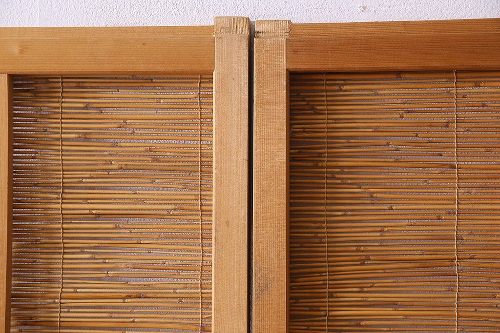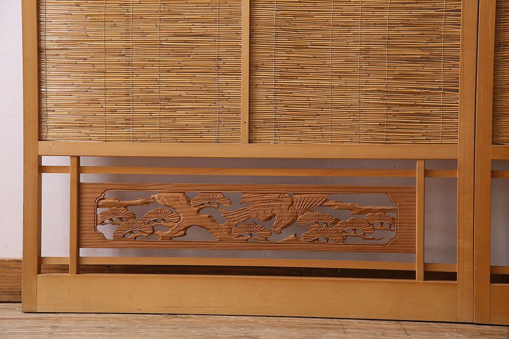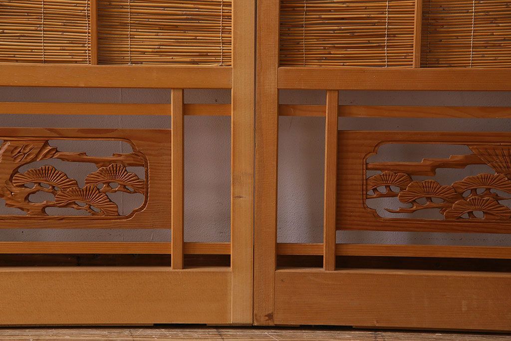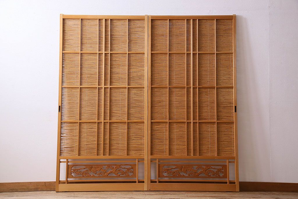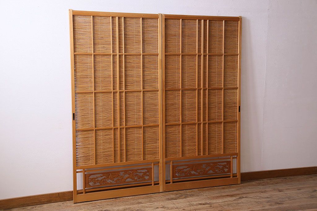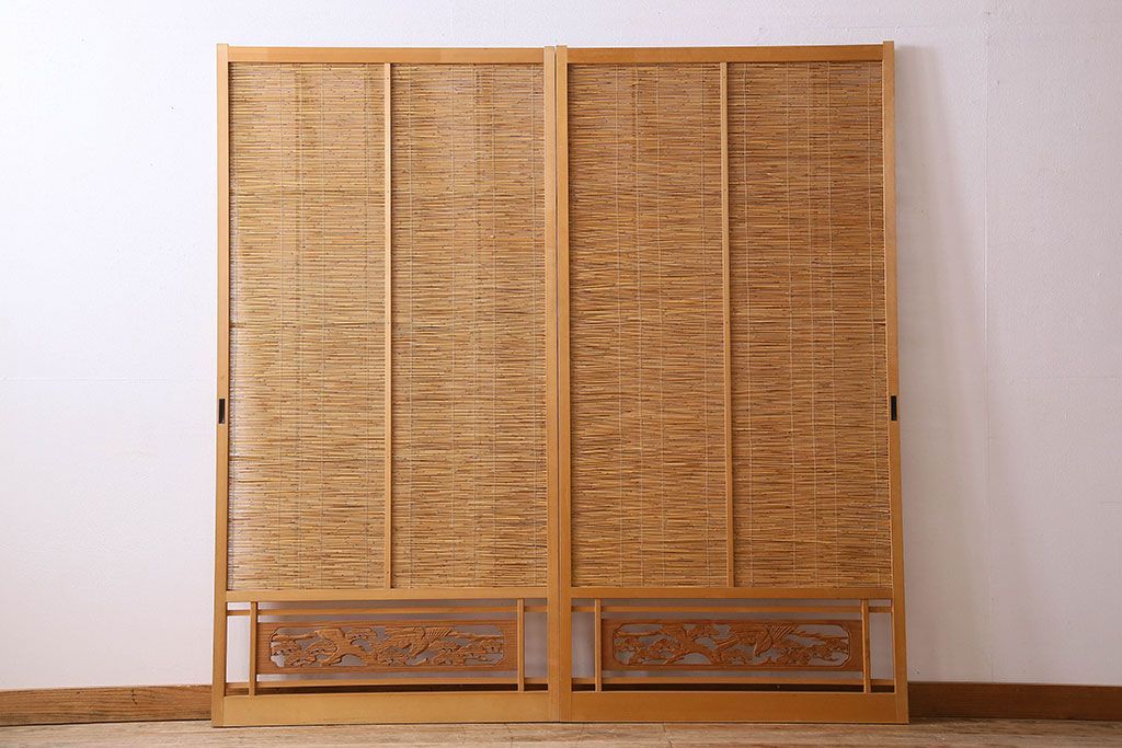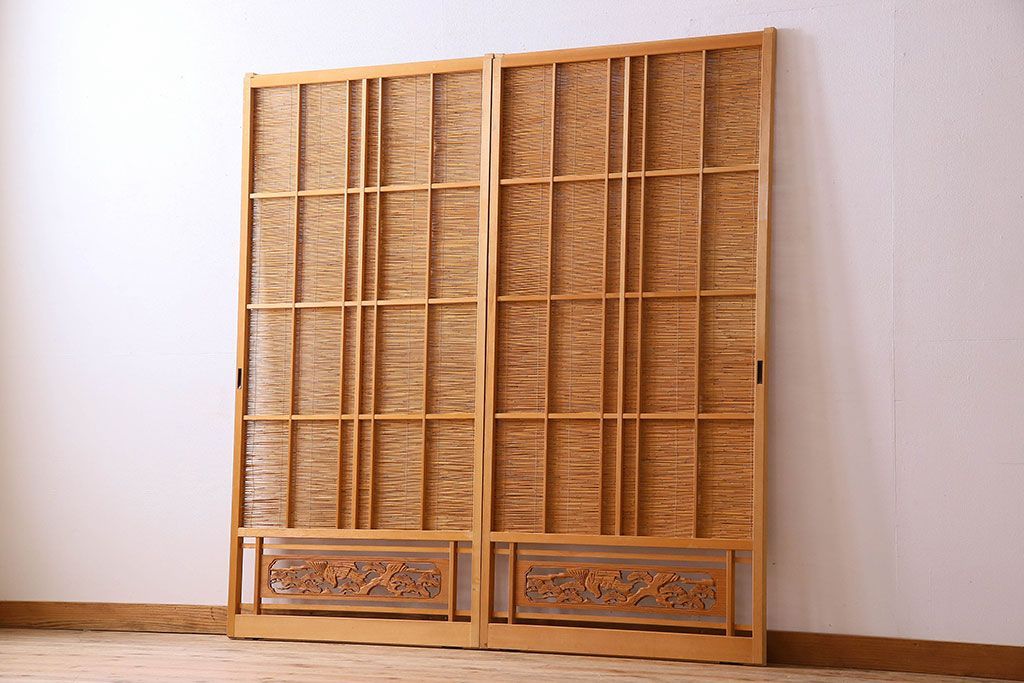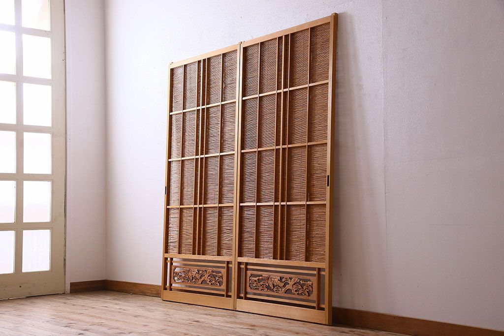 古民具・骨董 彫刻入り 風情あるアンティーク御簾戸(簾戸、簀戸、葭戸、夏障子、夏戸、葦戸)2枚セット
