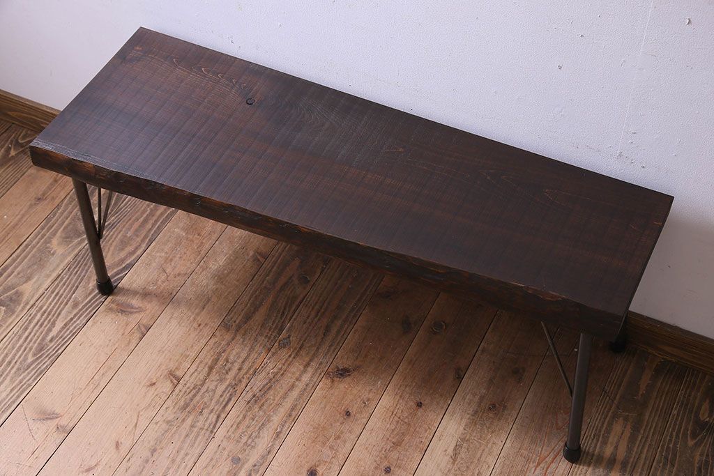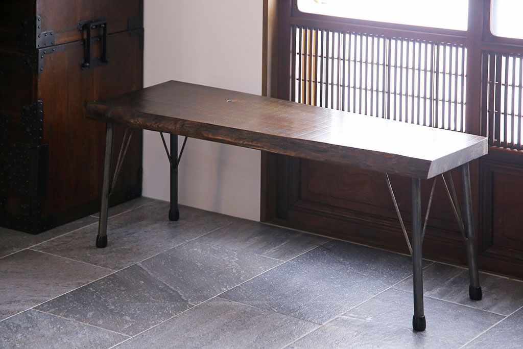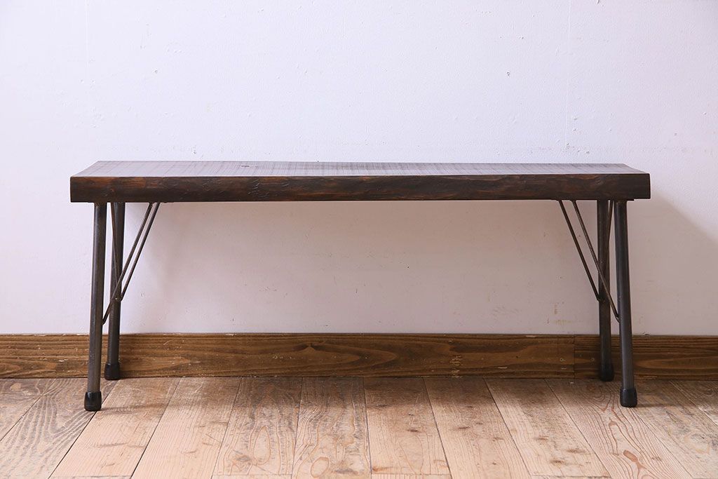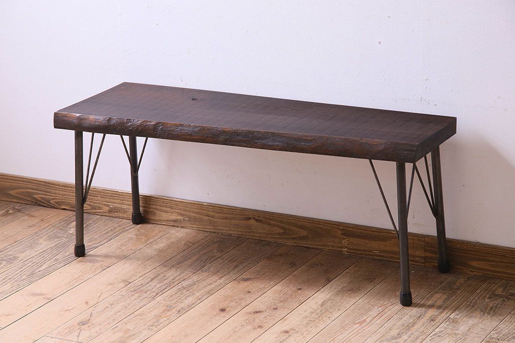椅子・ベンチ> ベンチ > レトロ家具 昭和レトロ 天板一枚板 古い檜材の鉄脚ローテーブル(アイアンテーブル、鉄脚ベンチ、アイアンベンチ)