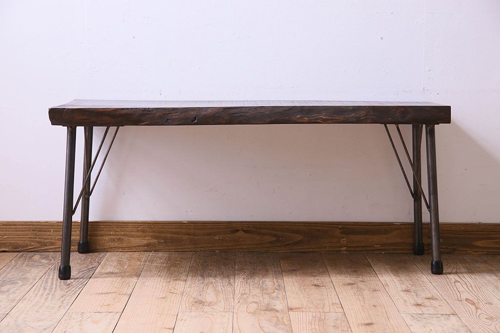 レトロ家具 昭和レトロ 天板一枚板 古い檜材の鉄脚ローテーブル(アイアンテーブル、鉄脚ベンチ、アイアンベンチ)(1)