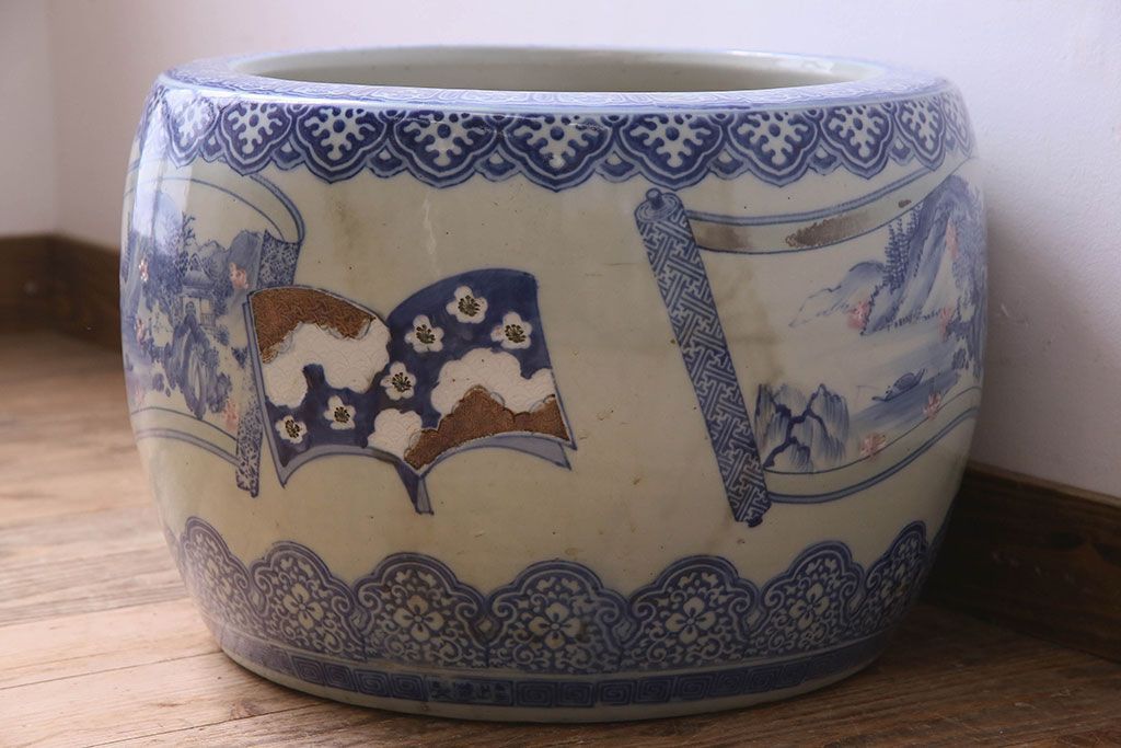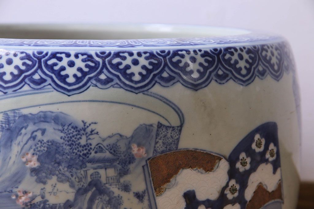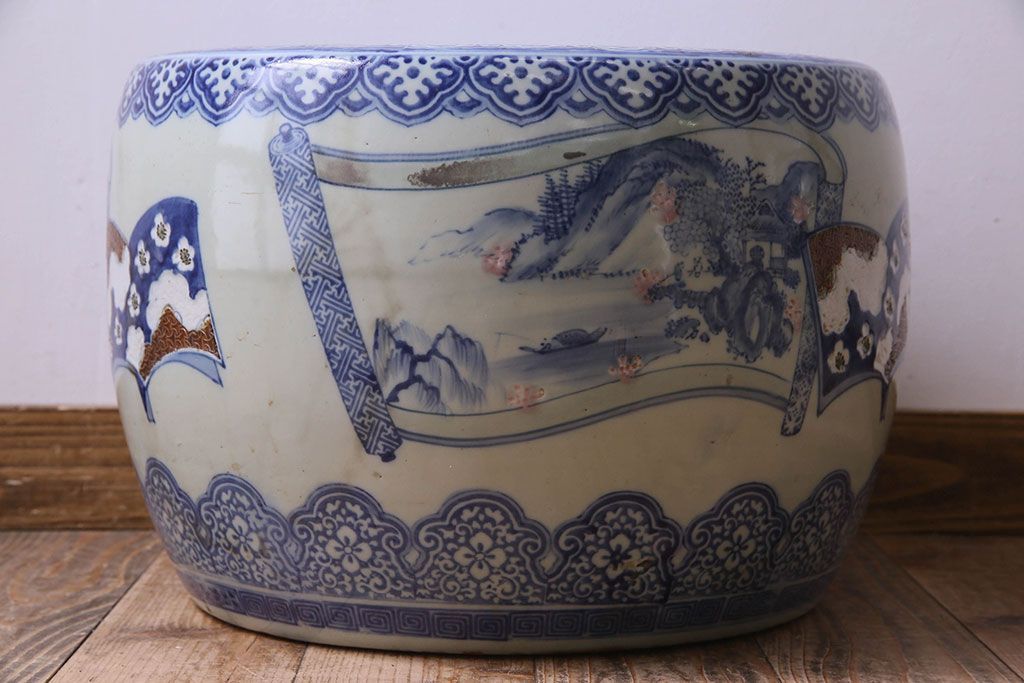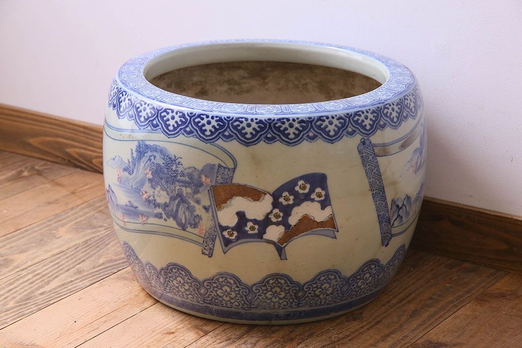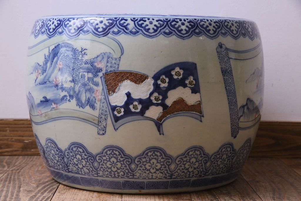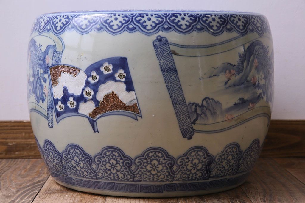 アンティーク雑貨 古民具・骨董 絵巻や和本の図柄入り 染付 瀬戸火鉢(鉢カバー)
