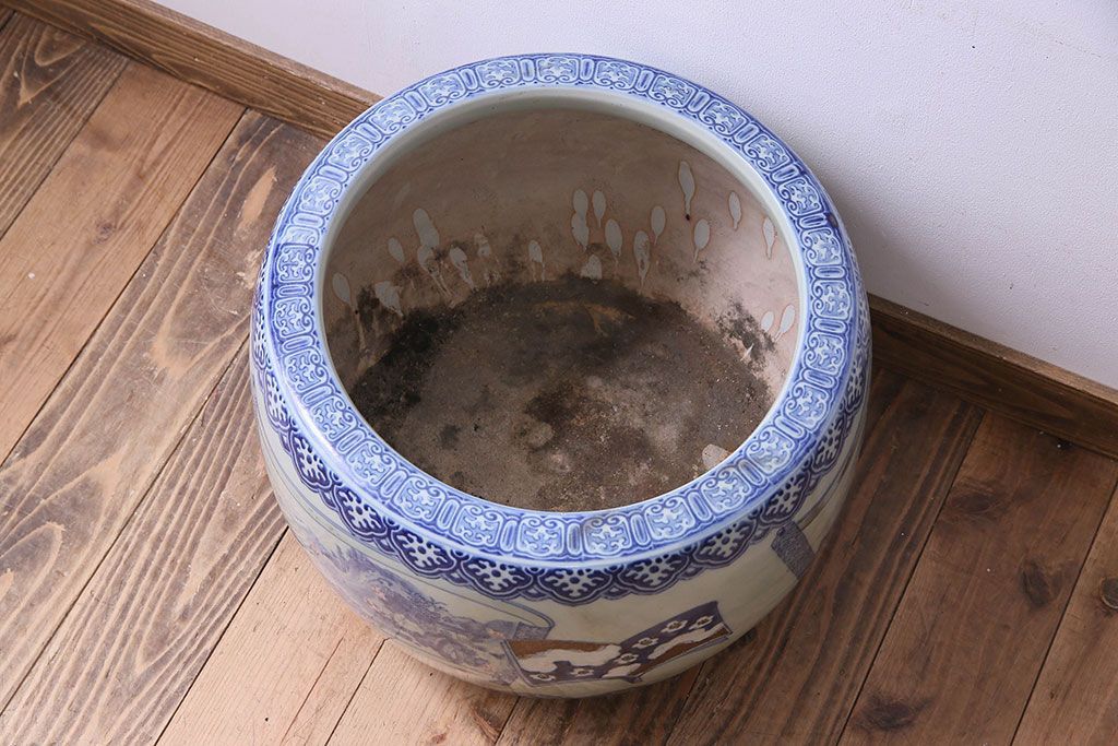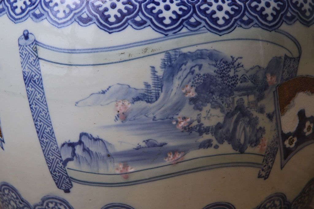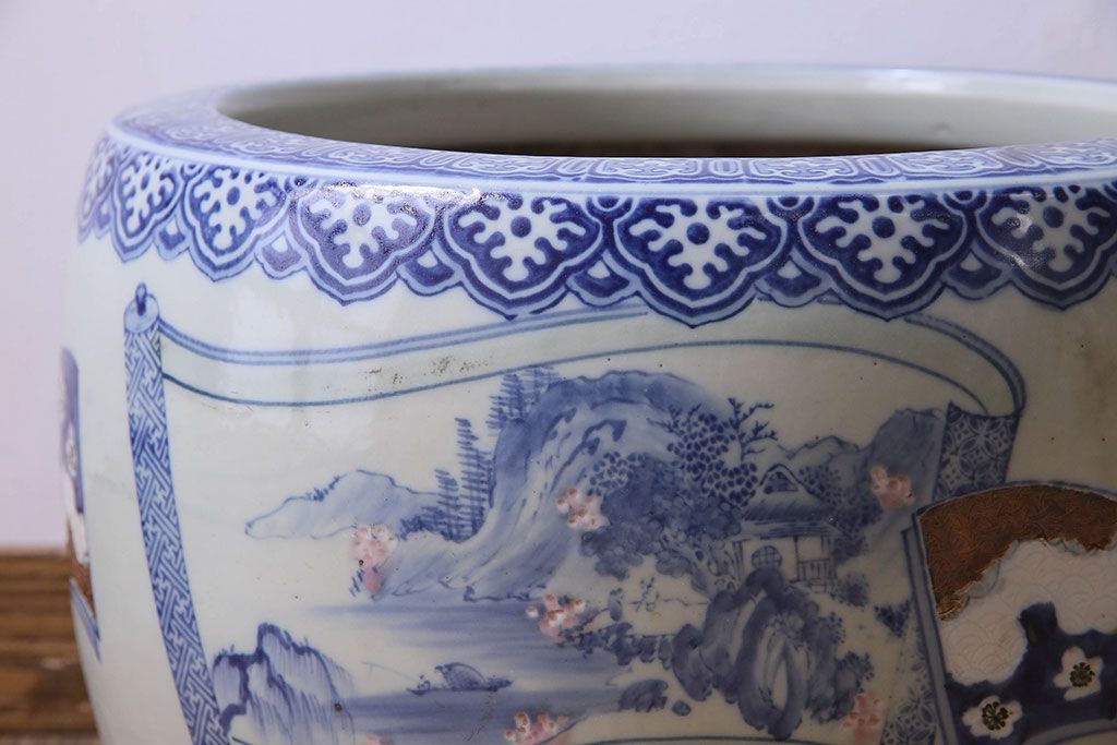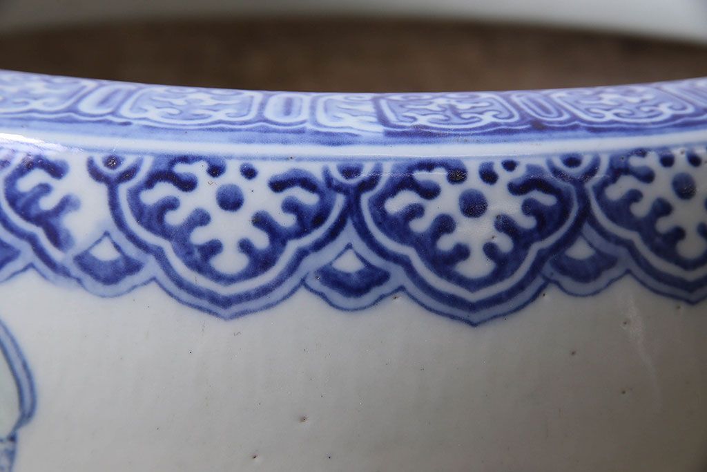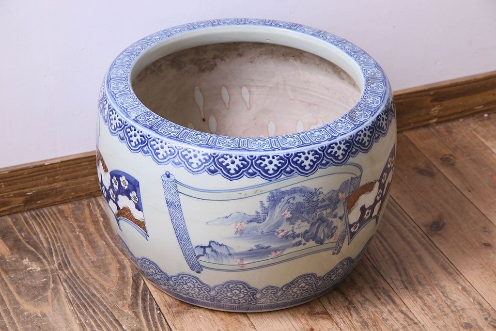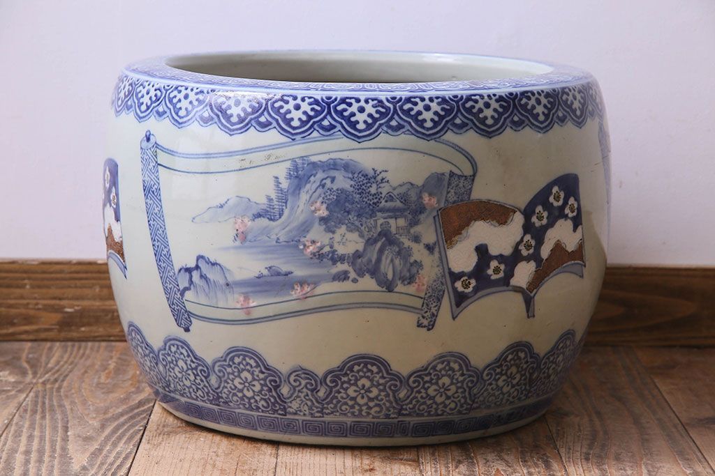 アンティーク雑貨 古民具・骨董 絵巻や和本の図柄入り 染付 瀬戸火鉢(鉢カバー)