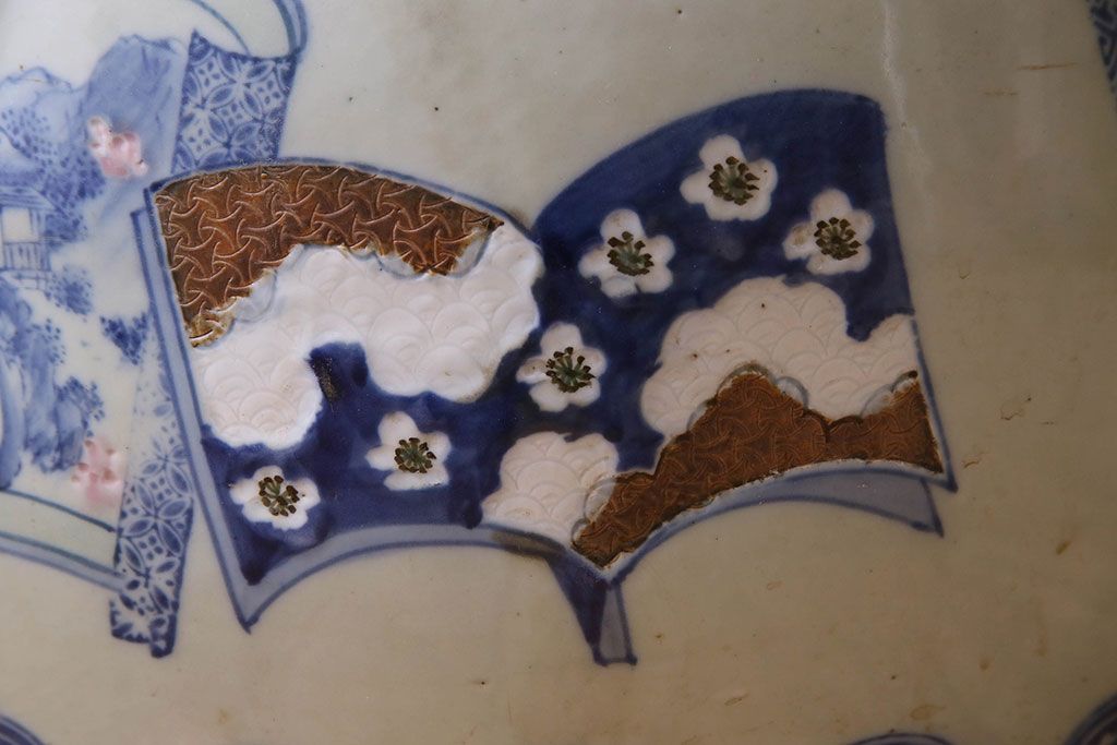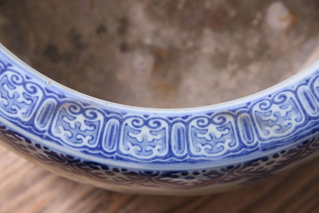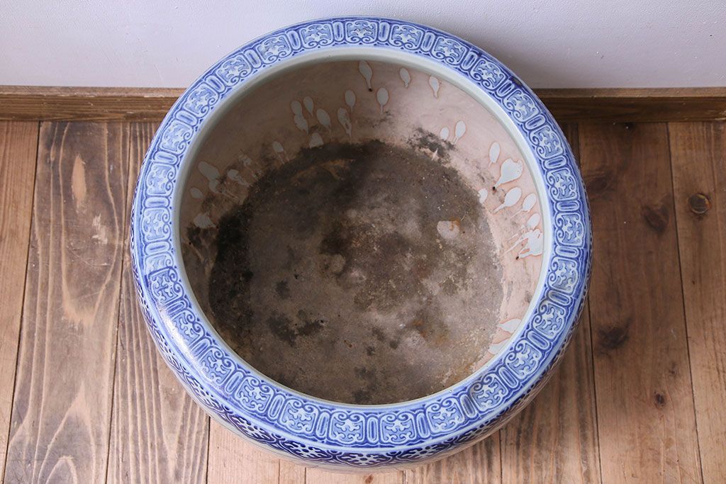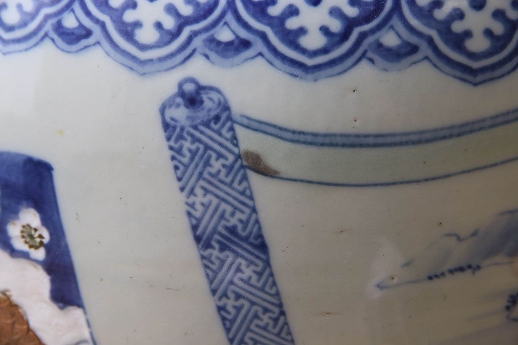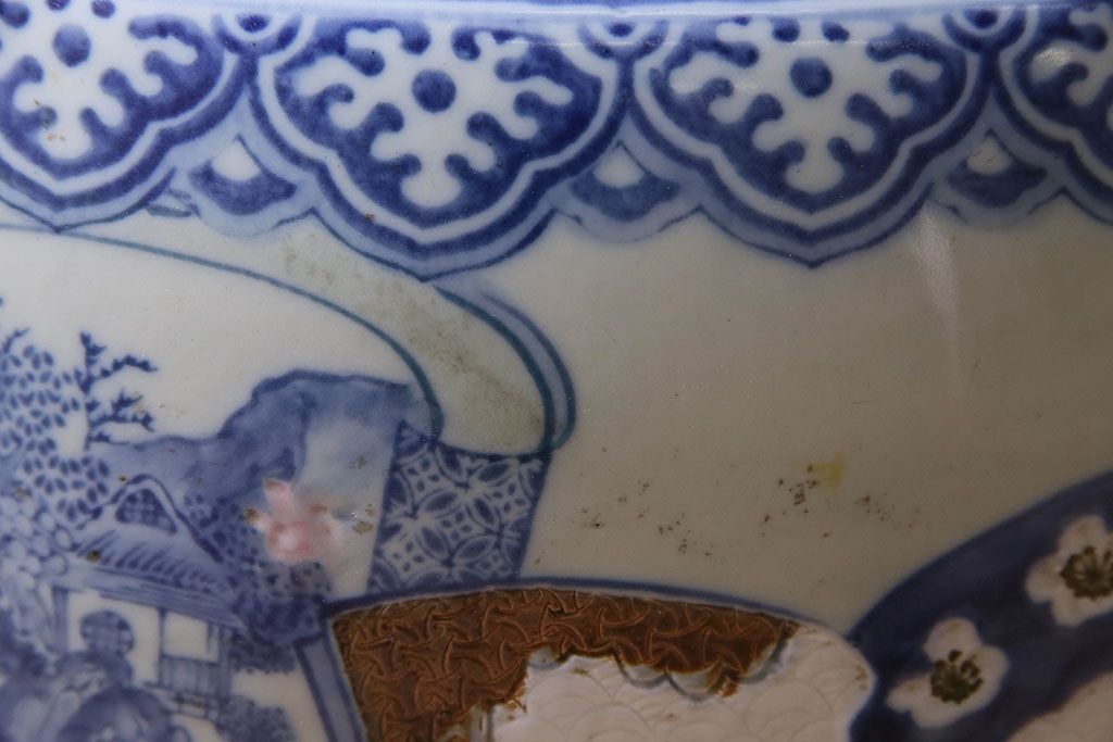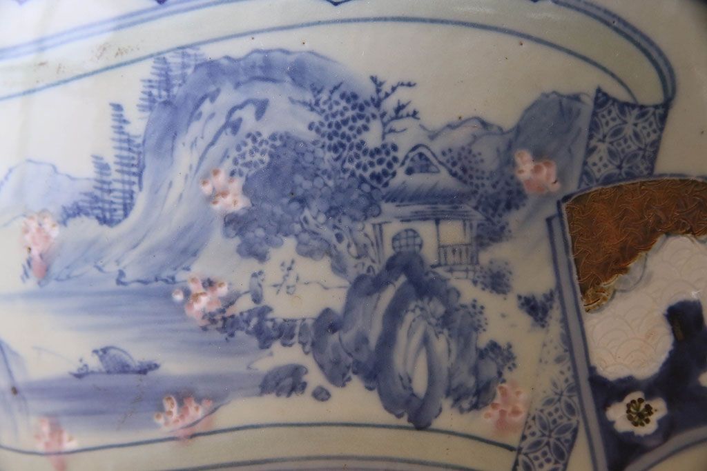 アンティーク雑貨 古民具・骨董 絵巻や和本の図柄入り 染付 瀬戸火鉢(鉢カバー)