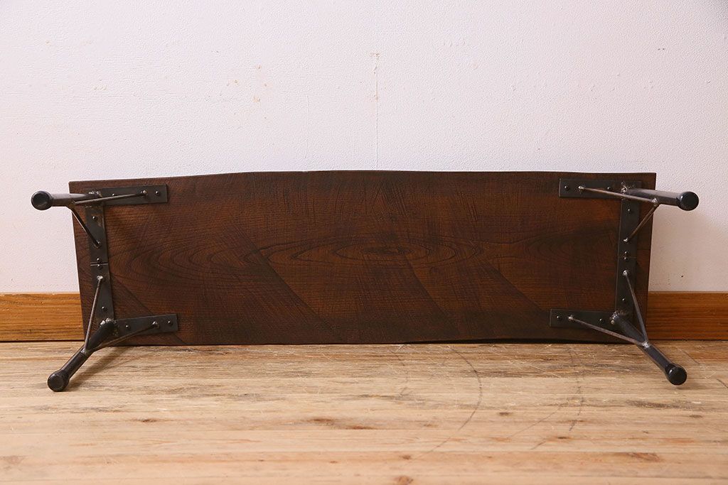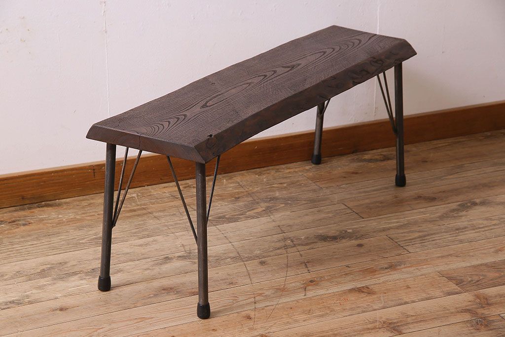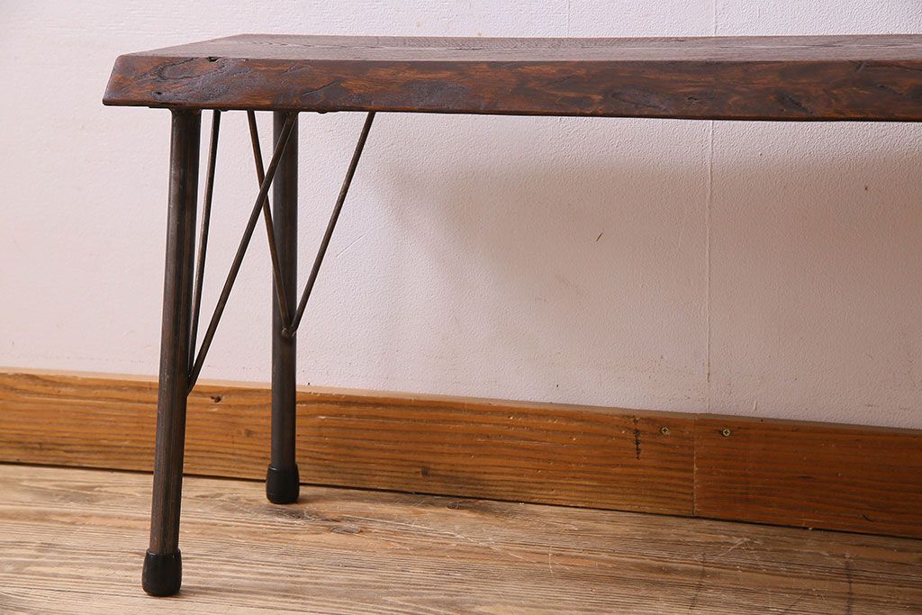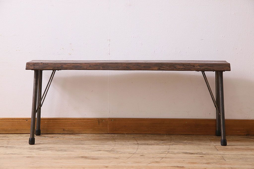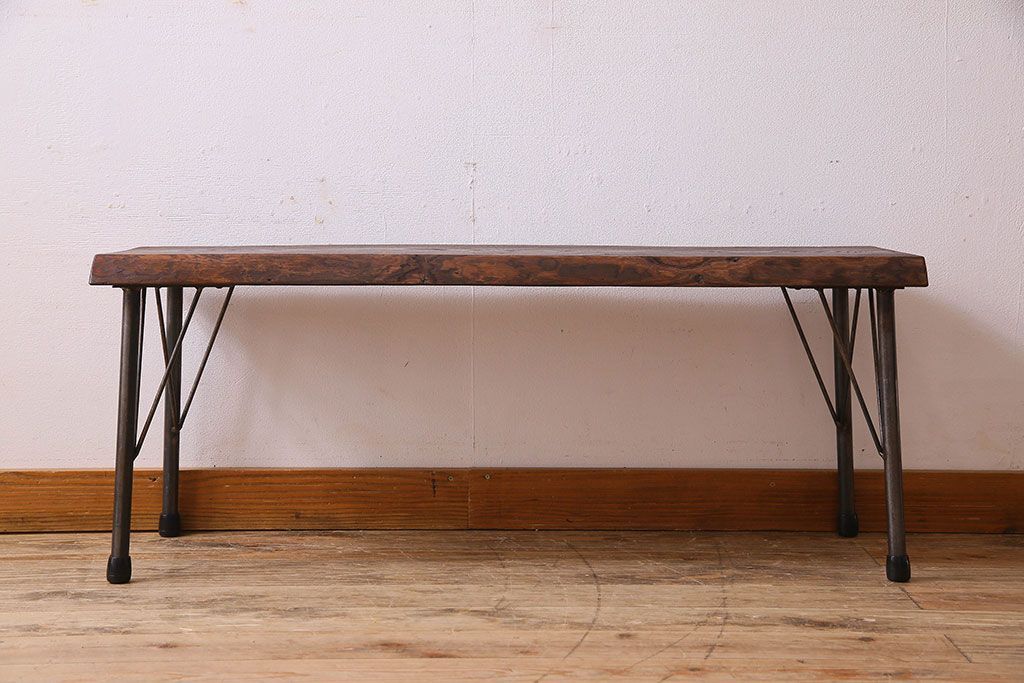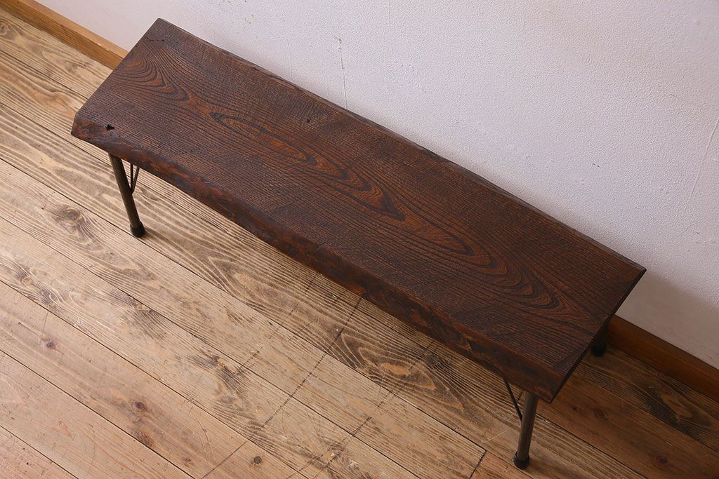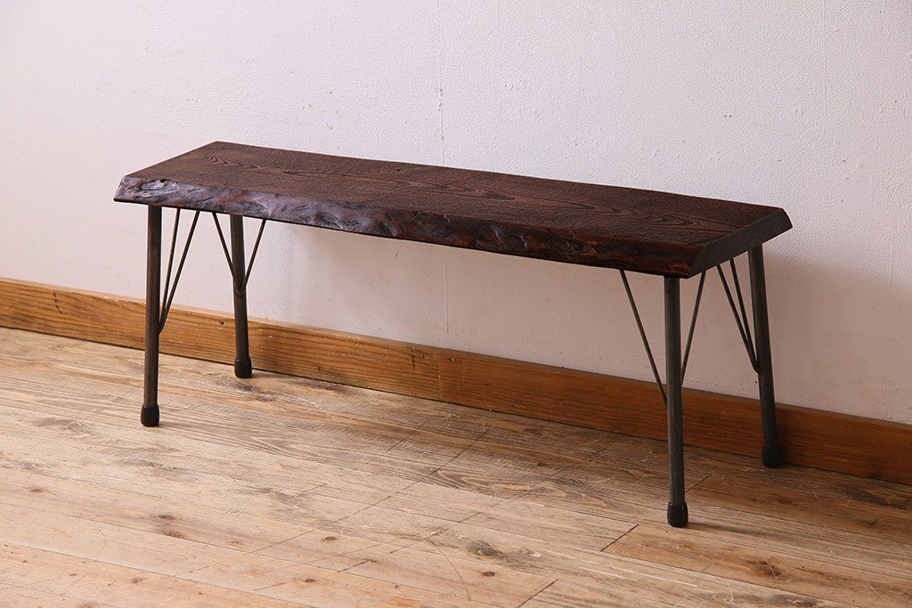 ラフジュ工房> オープンラック・シェルフ> ディスプレイラック > アンティーク家具 和製アンティーク 耳付き天板 古い欅材一枚板の鉄脚ベンチ(アイアンベンチ、長椅子、ローテーブル)