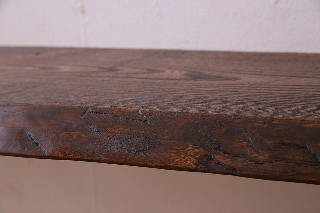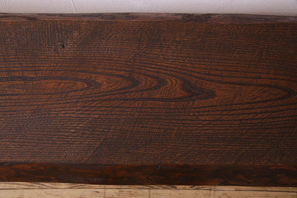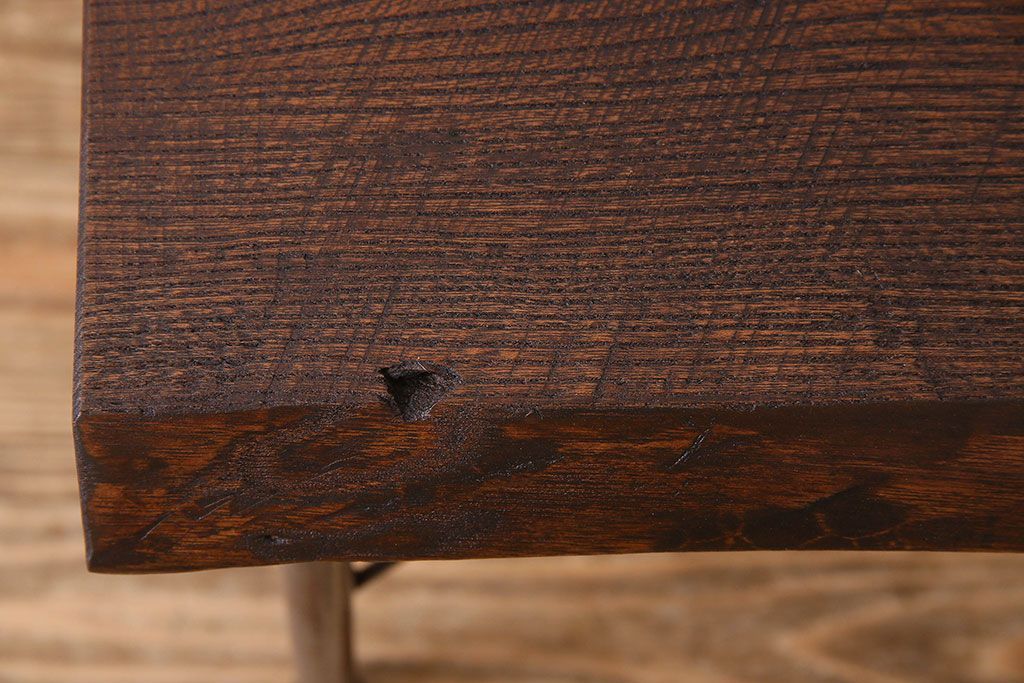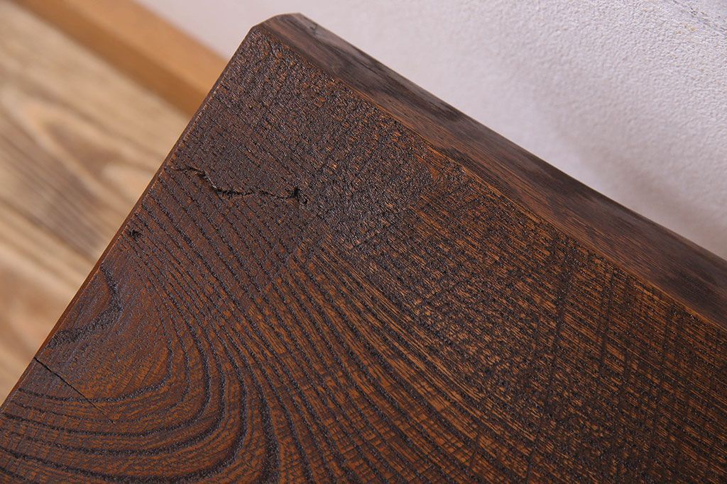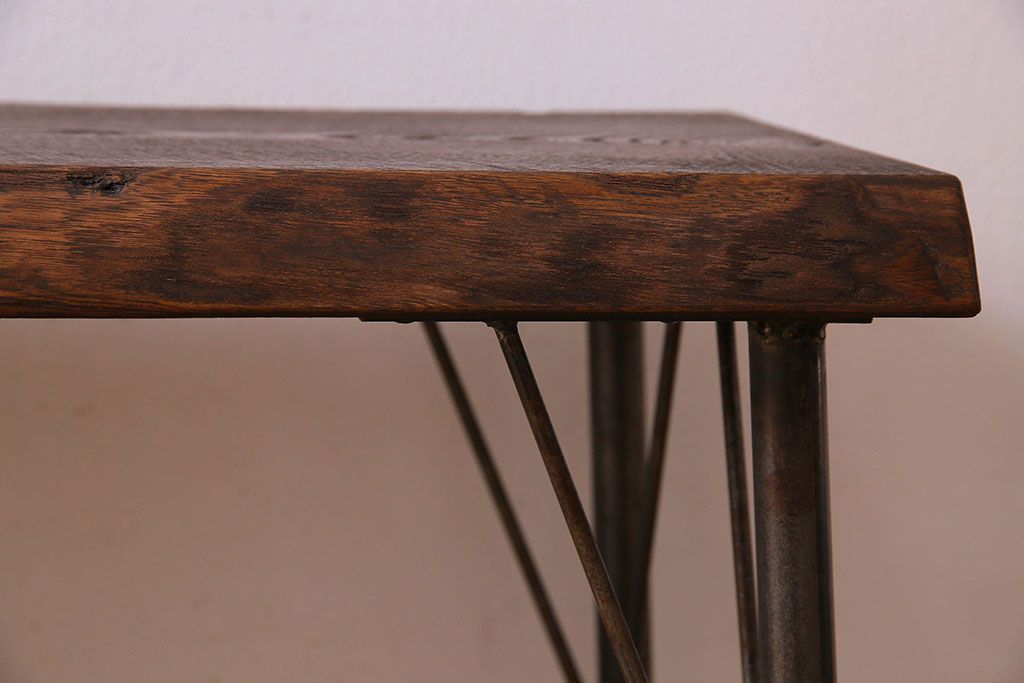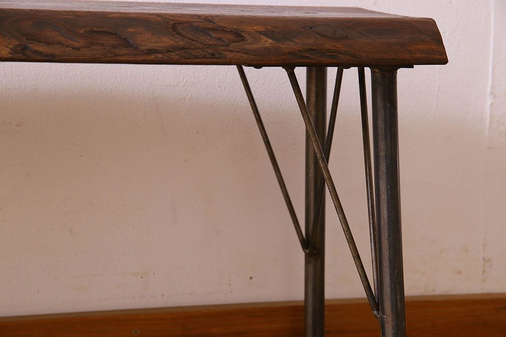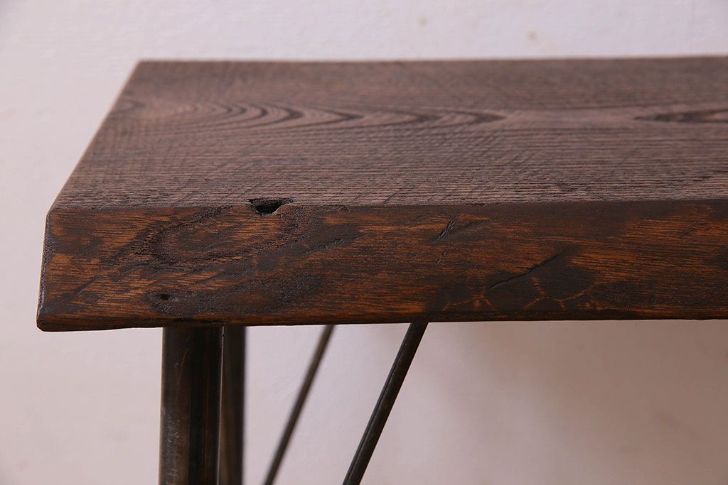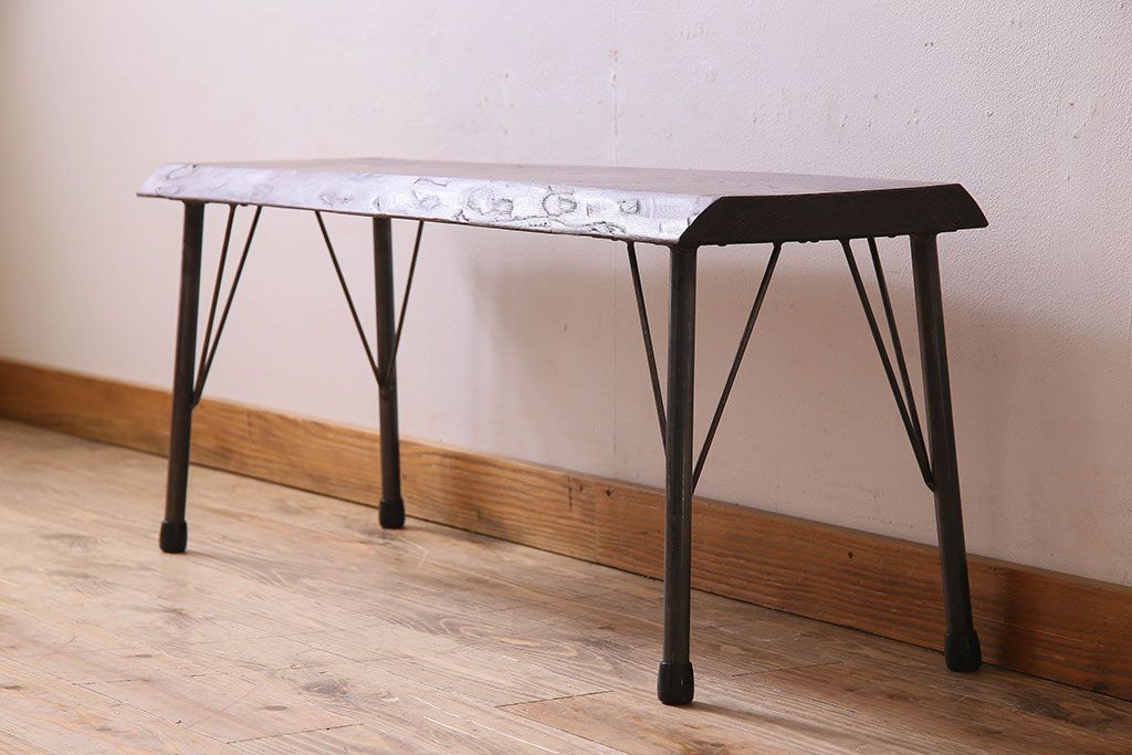 ラフジュ工房> オープンラック・シェルフ> ディスプレイラック > アンティーク家具 和製アンティーク 耳付き天板 古い欅材一枚板の鉄脚ベンチ(アイアンベンチ、長椅子、ローテーブル)
