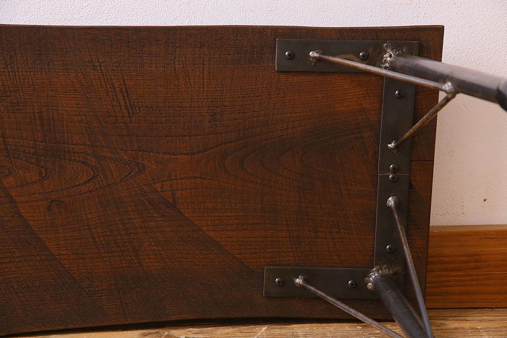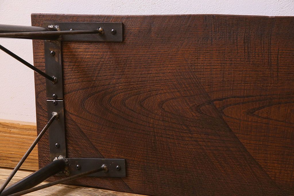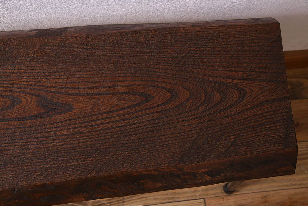 アンティーク家具 和製アンティーク 耳付き天板 古い欅材一枚板の鉄脚ベンチ(アイアンベンチ、長椅子、ローテーブル)
