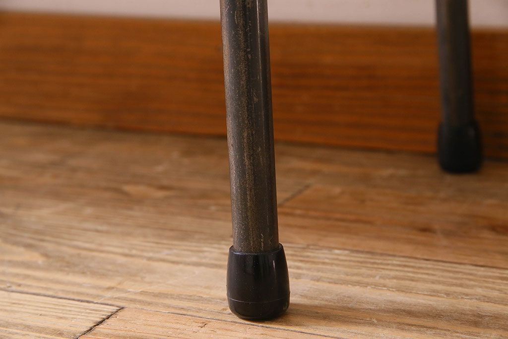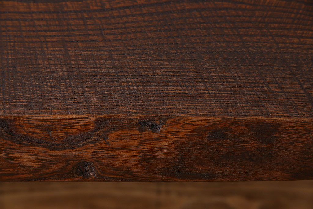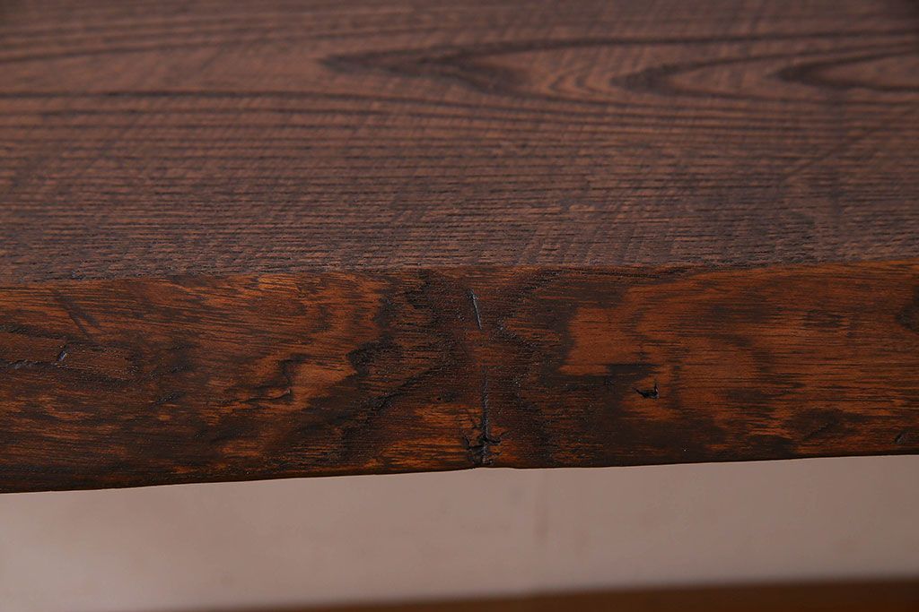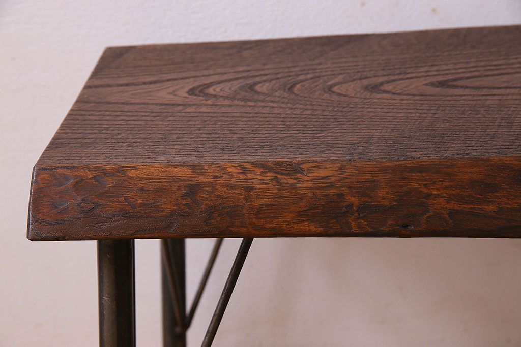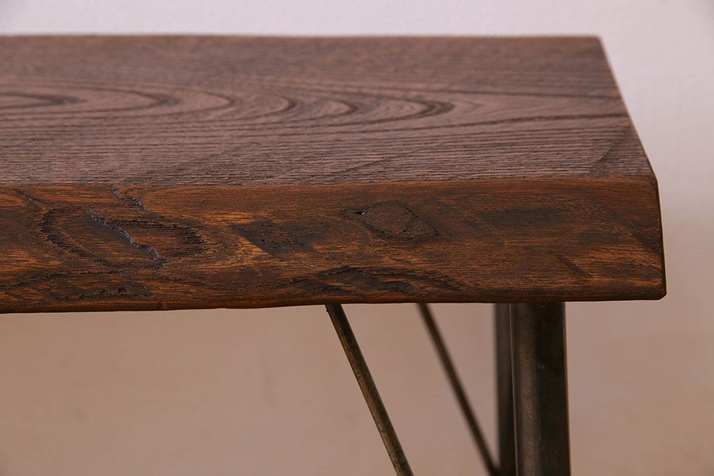 ラフジュ工房> 椅子・ベンチ> ダイニングチェア > アンティーク家具 和製アンティーク 耳付き天板 古い欅材一枚板の鉄脚ベンチ(アイアンベンチ、長椅子、ローテーブル)