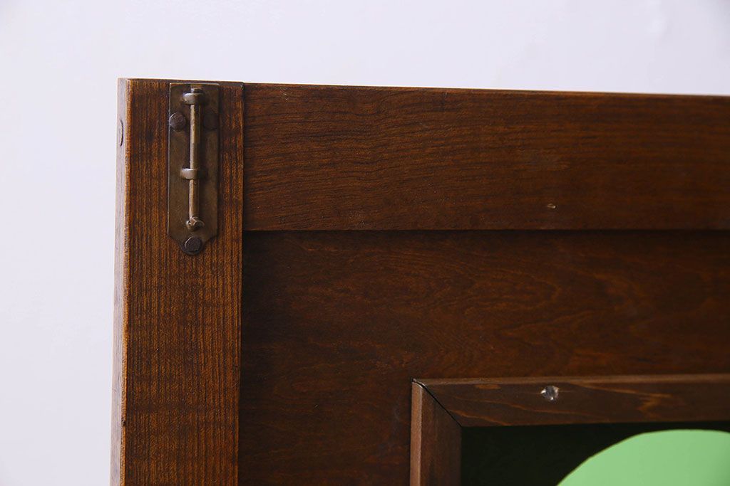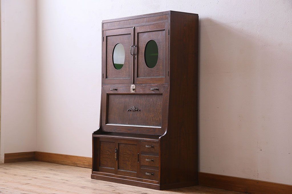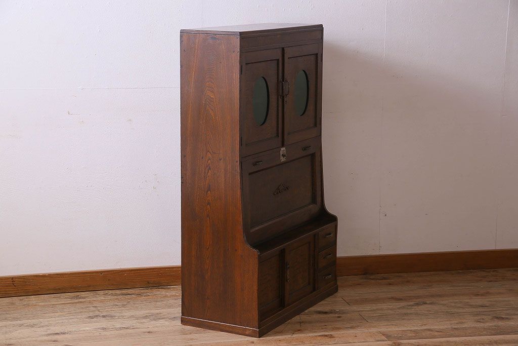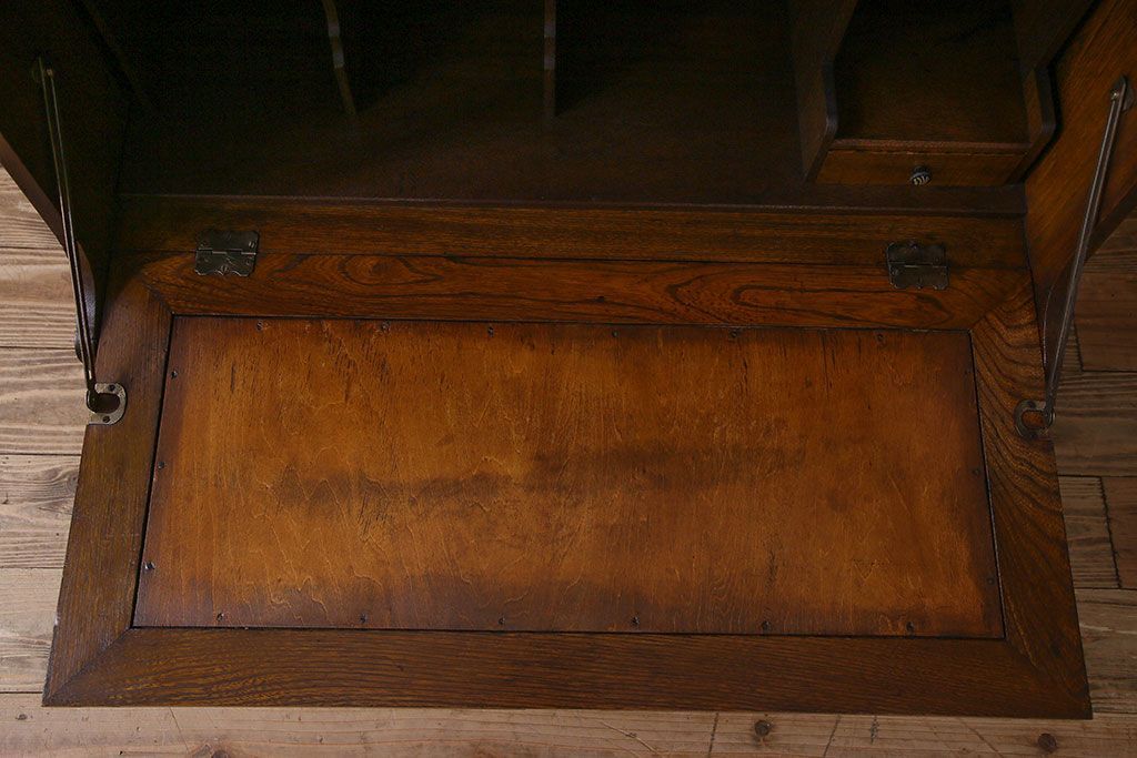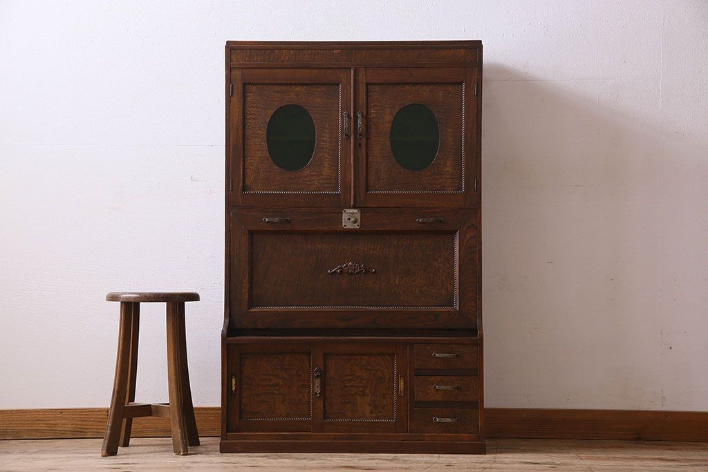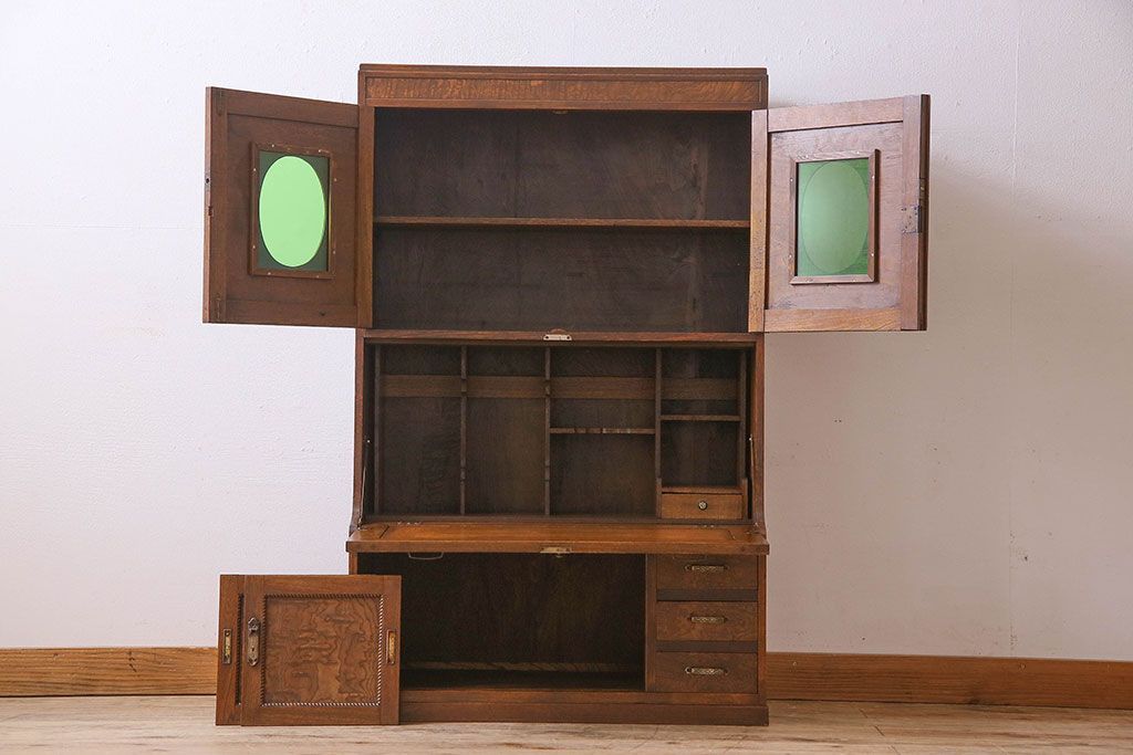 ラフジュ工房> キャビネット・戸棚> 本箱 > アンティーク家具 和製アンティーク タモ材 色ガラス入り!上質なデザインのライティングビューロー(机、在宅ワーク、在宅用デスク、収納棚)