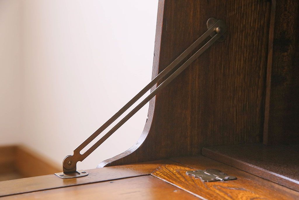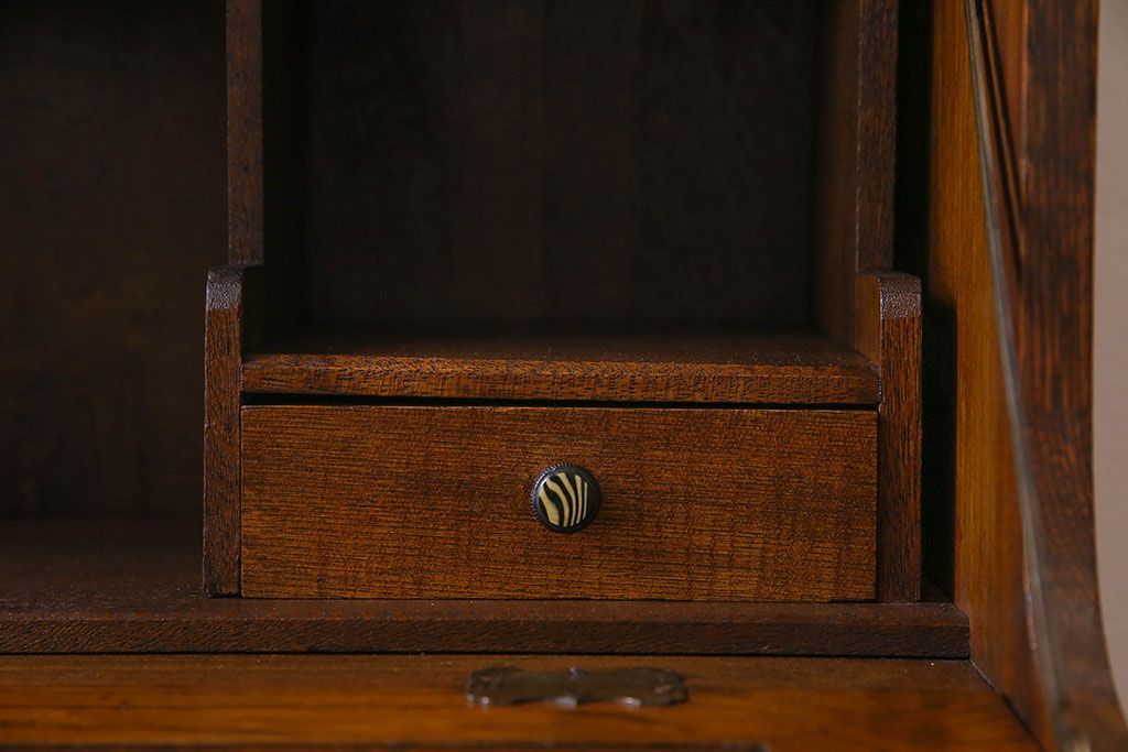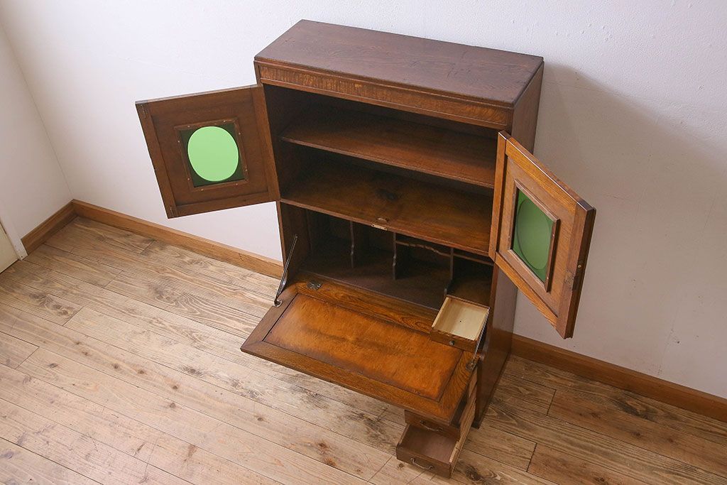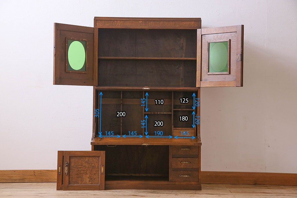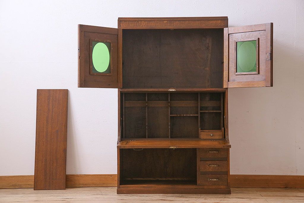 ラフジュ工房> デスク> ライティングビューロー・簿記机 > アンティーク家具 和製アンティーク タモ材 色ガラス入り!上質なデザインのライティングビューロー(机、在宅ワーク、在宅用デスク、収納棚)