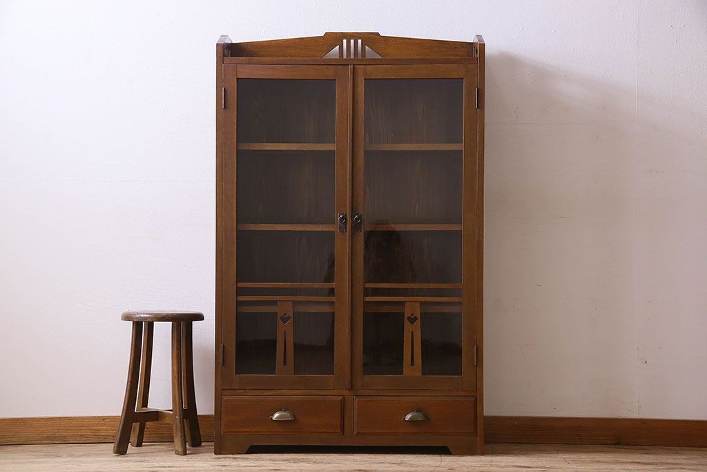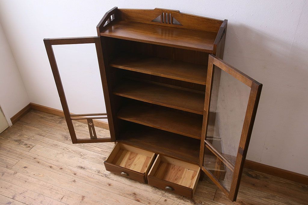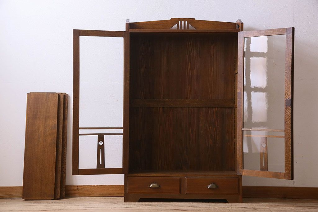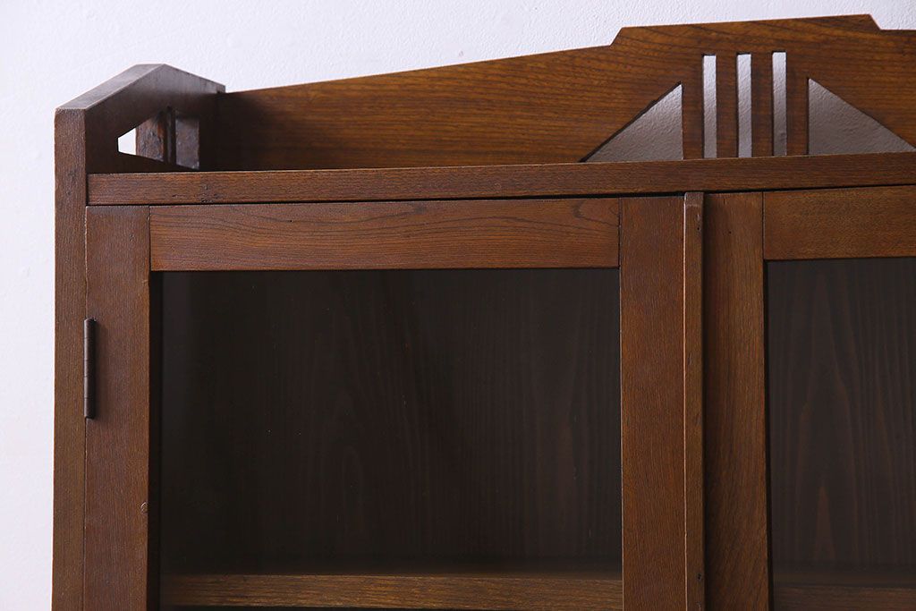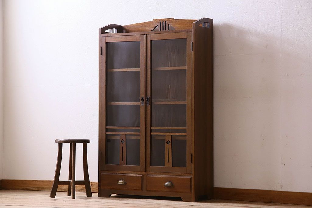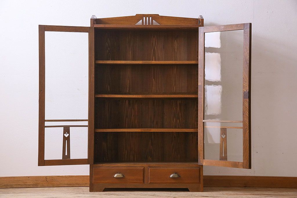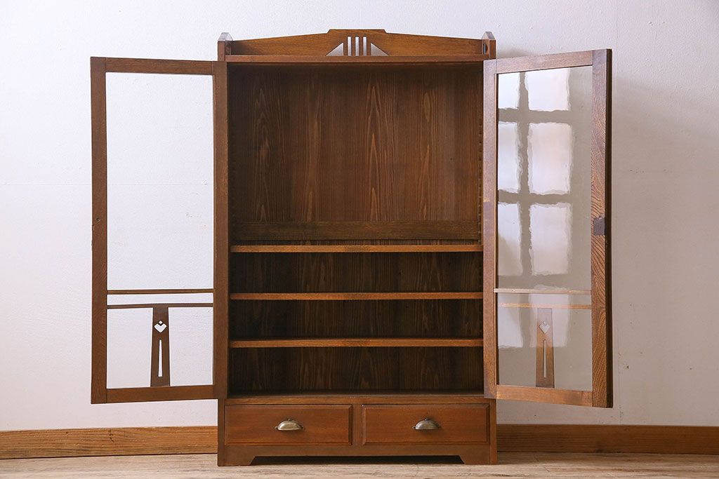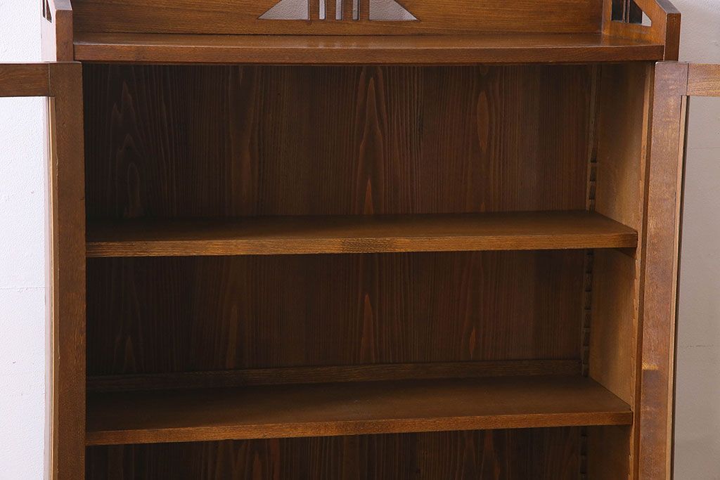 ラフジュ工房> キャビネット・戸棚> 食器棚・カップボード > アンティーク家具 大正ロマン 美しい透かし彫り入りの大振りな本箱(ブックケース、食器棚)