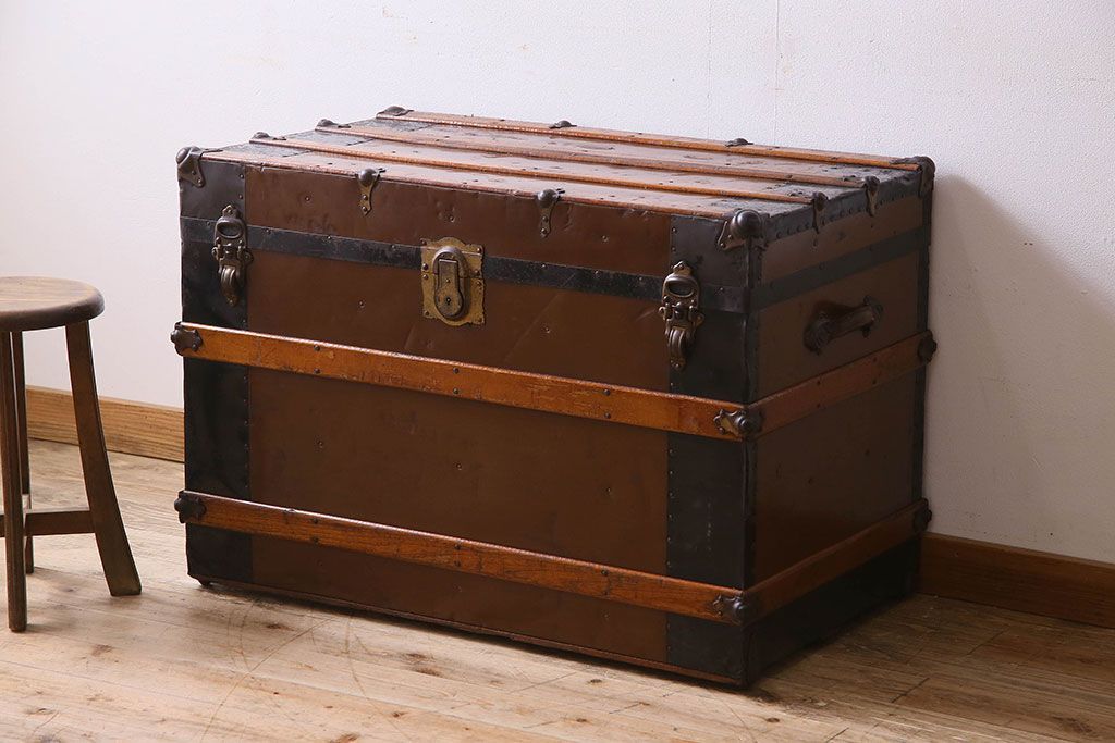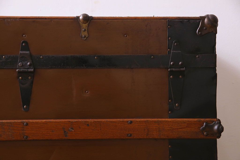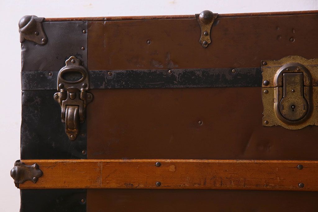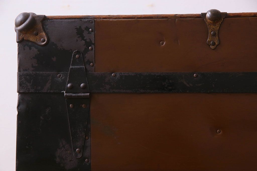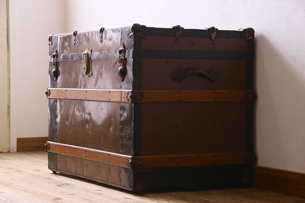 - インパクトのある、ブリキウッドトランク。ブリキ板に装飾が付いたタイプで、シャビーな雰囲気と収納力を兼ね備えた、たのもしいトランクです。