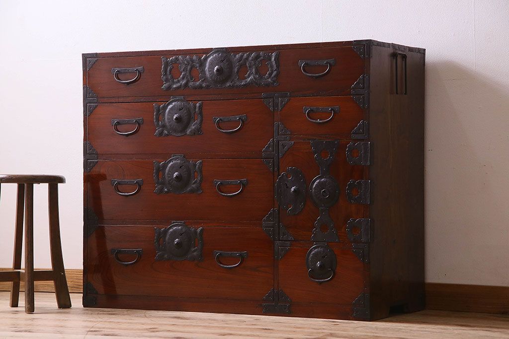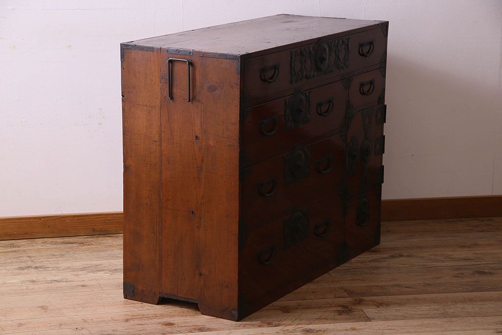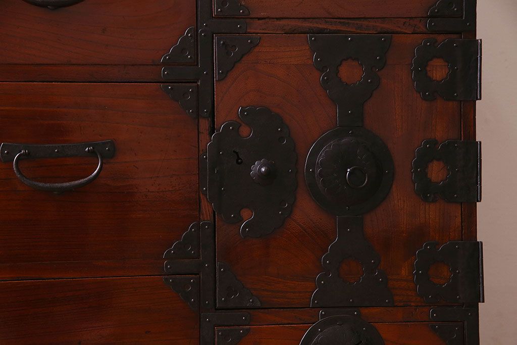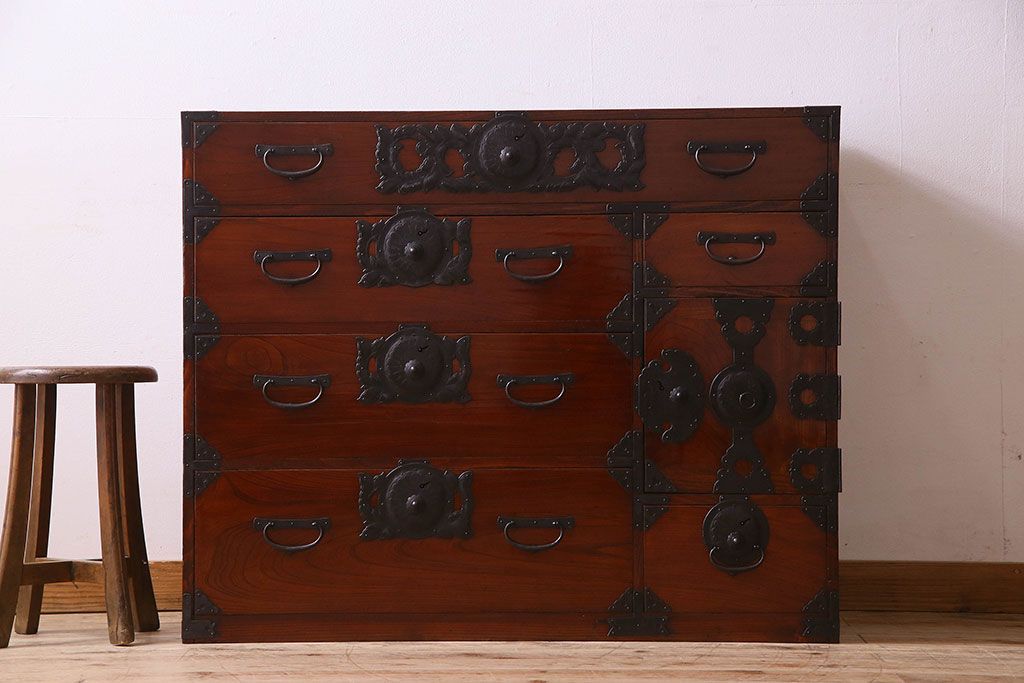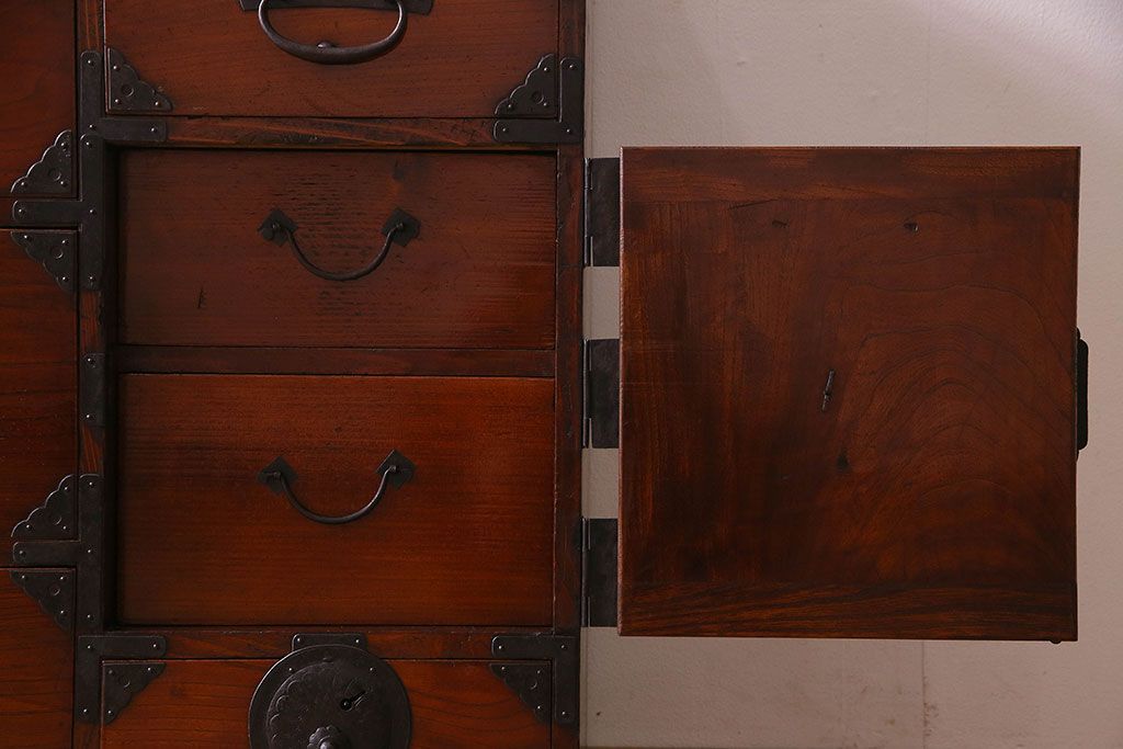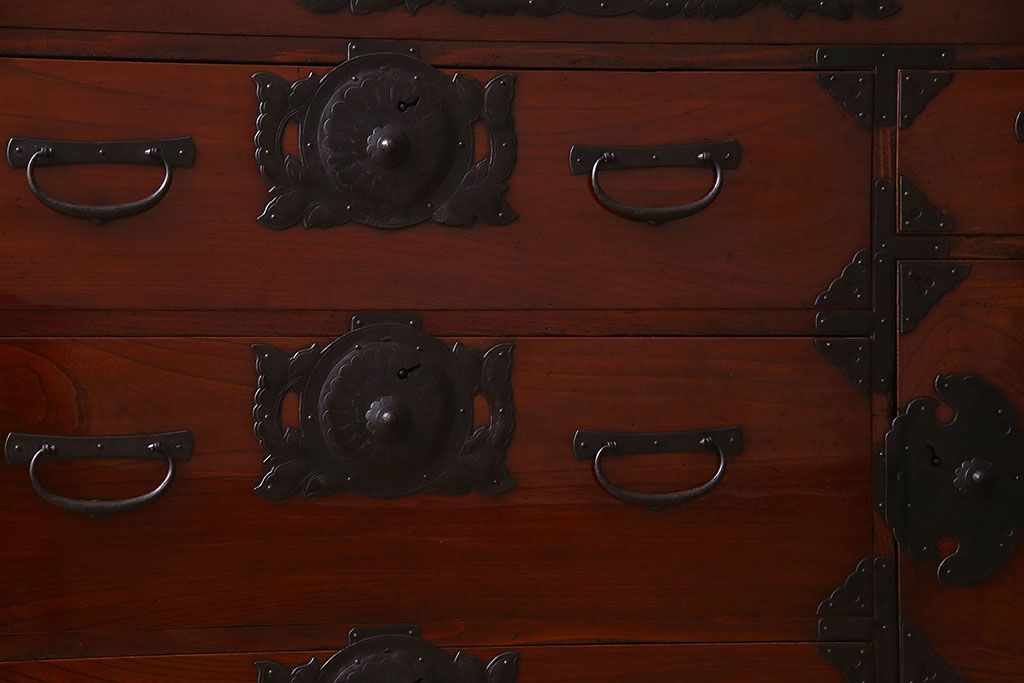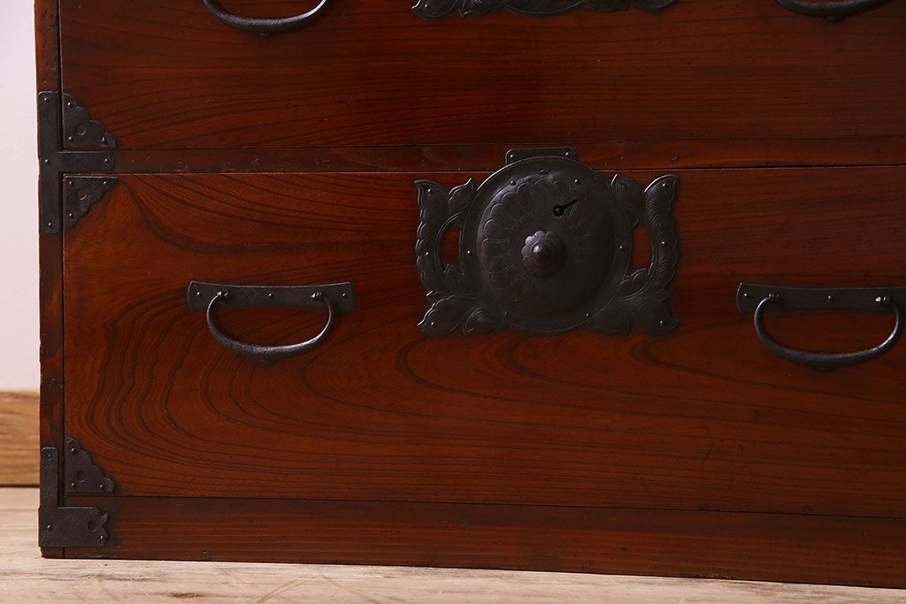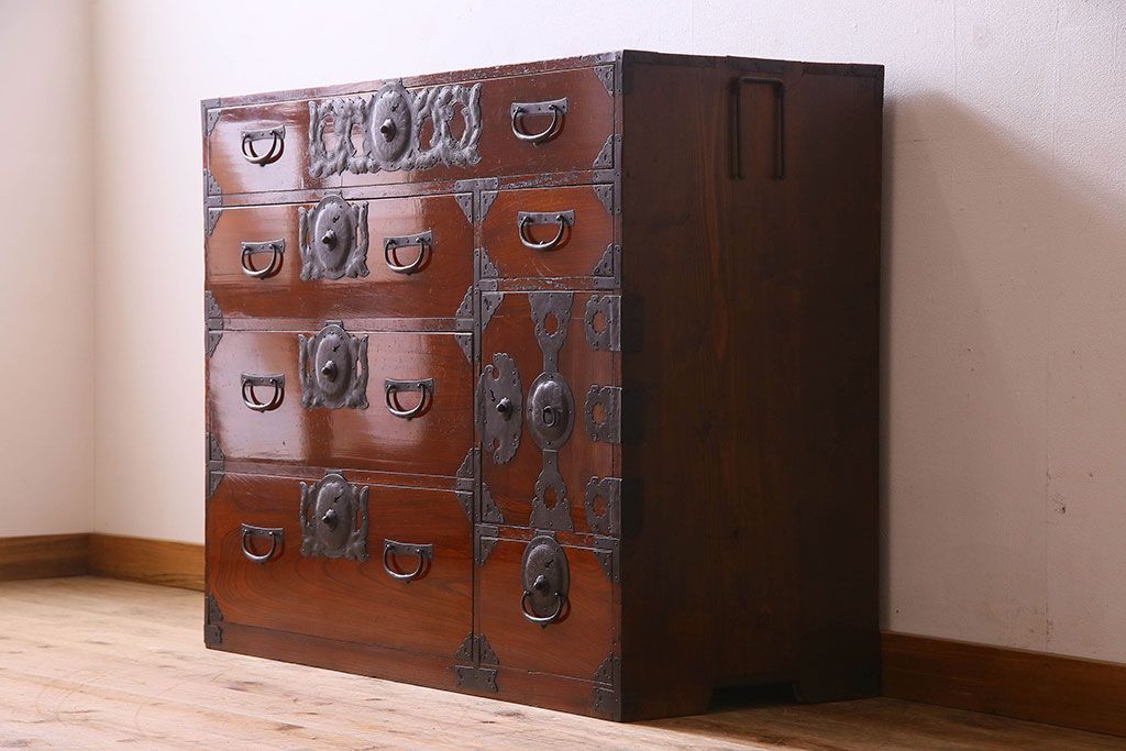 アンティーク家具 和製アンティーク 漆塗り 前面ケヤキ材の仙台箪笥(衣装箪笥、引き出し)
