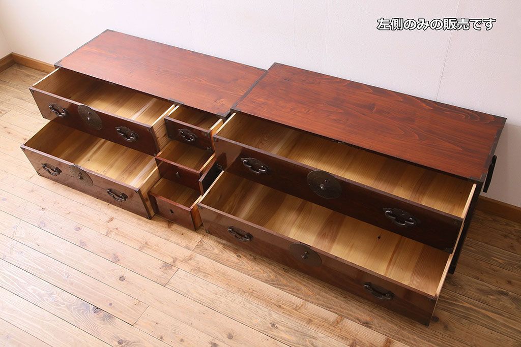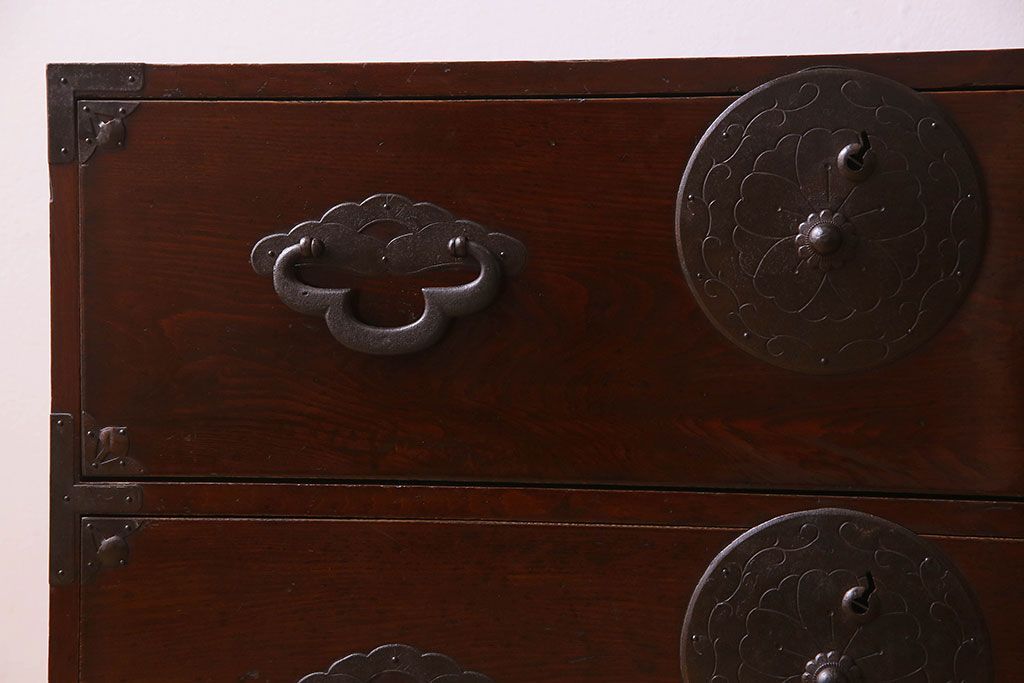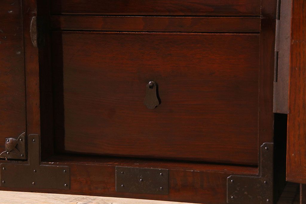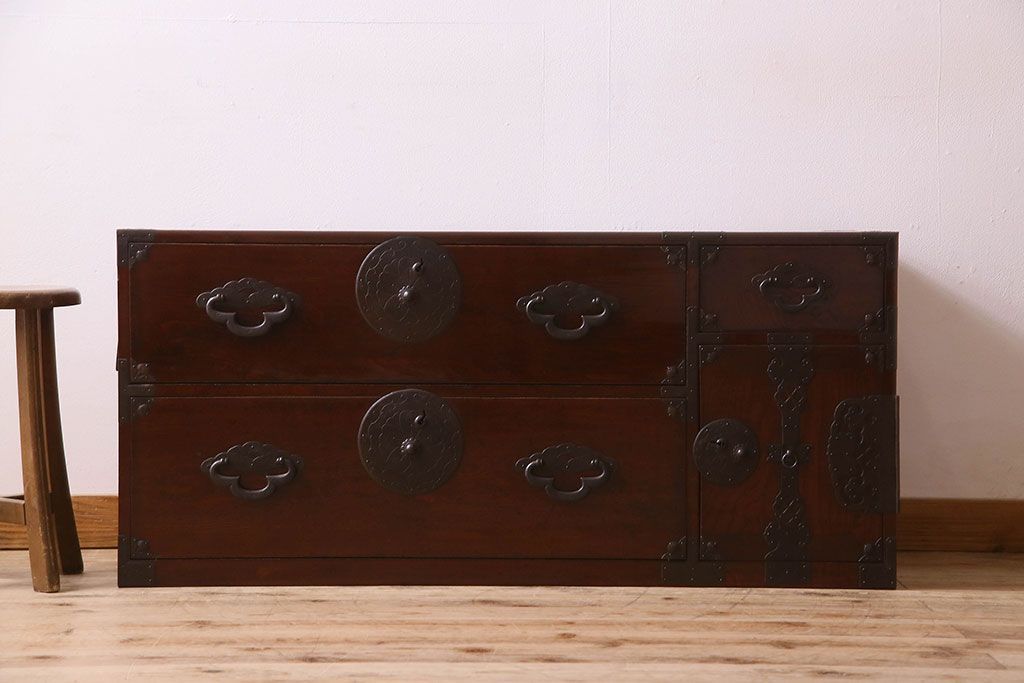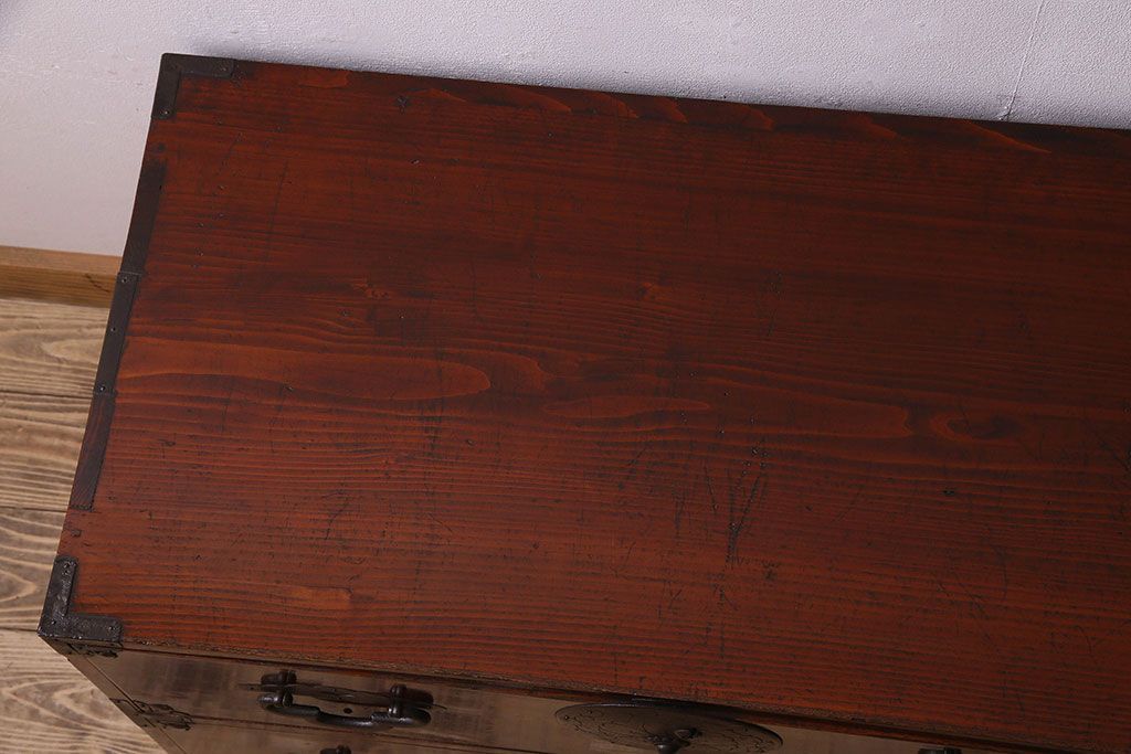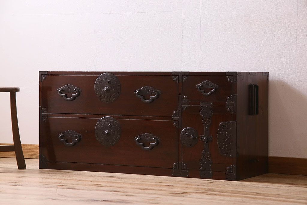 アンティーク家具 R-3 古民具・骨董 前面栗材!漆塗りが美しい時代箪笥ローボード・上段(米沢箪笥、衣装箪笥、引き出し、テレビボード)
