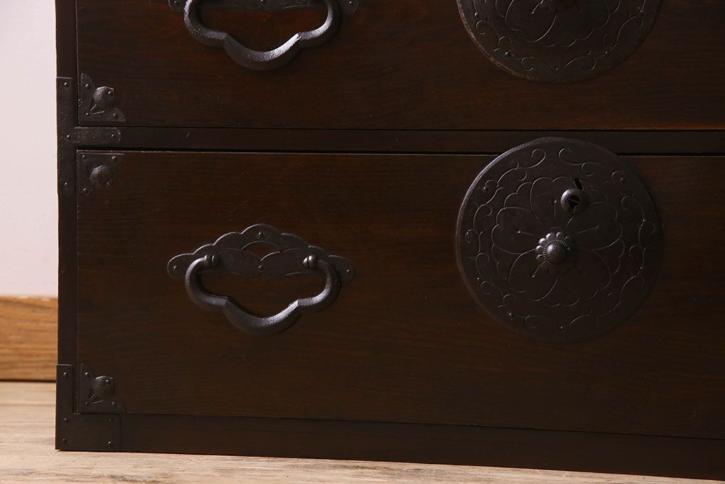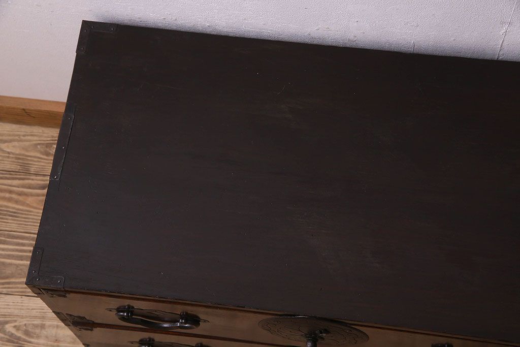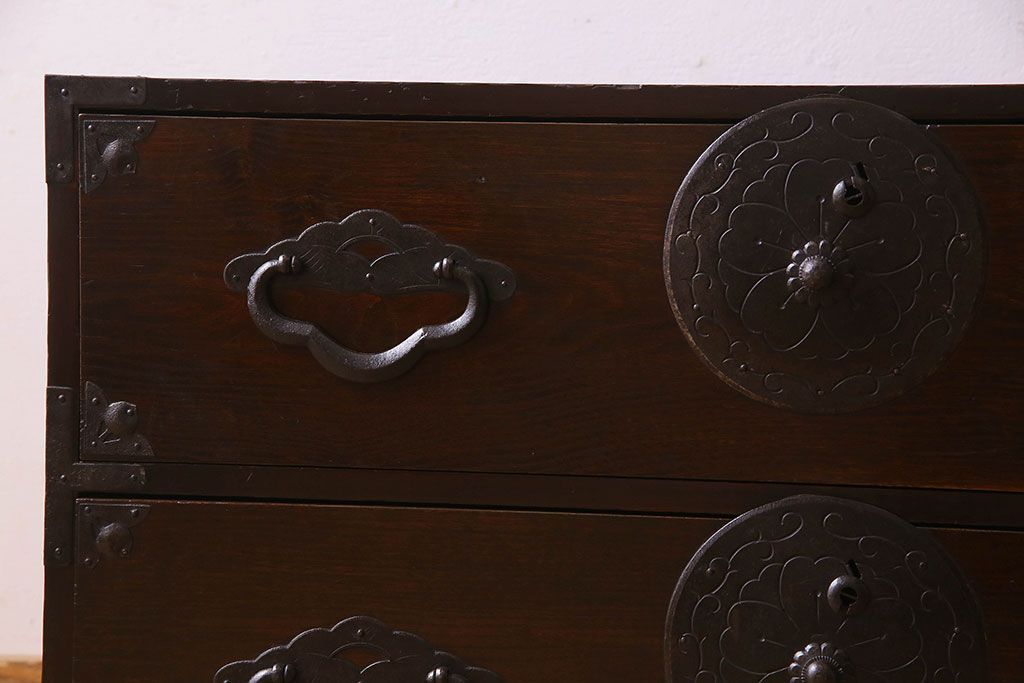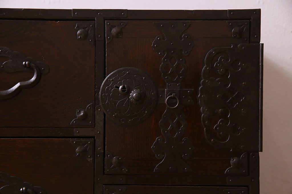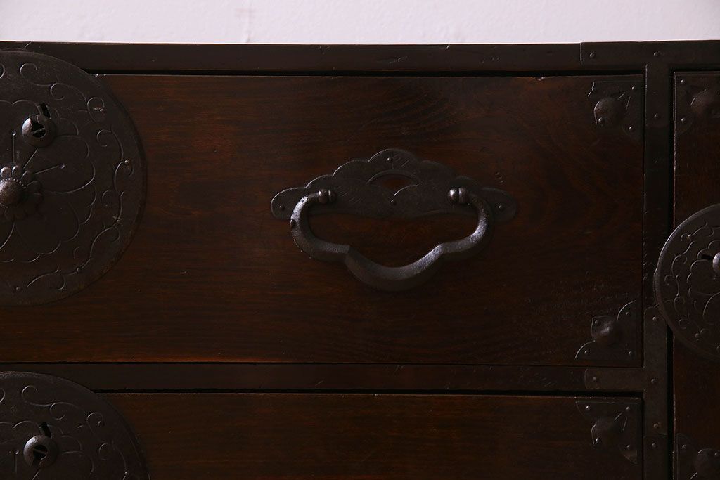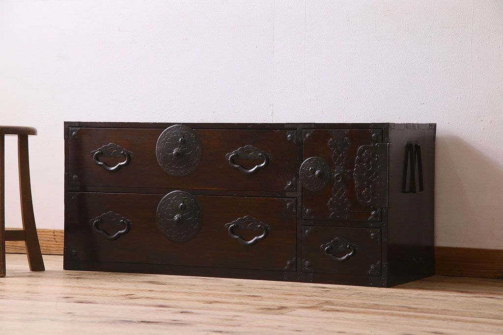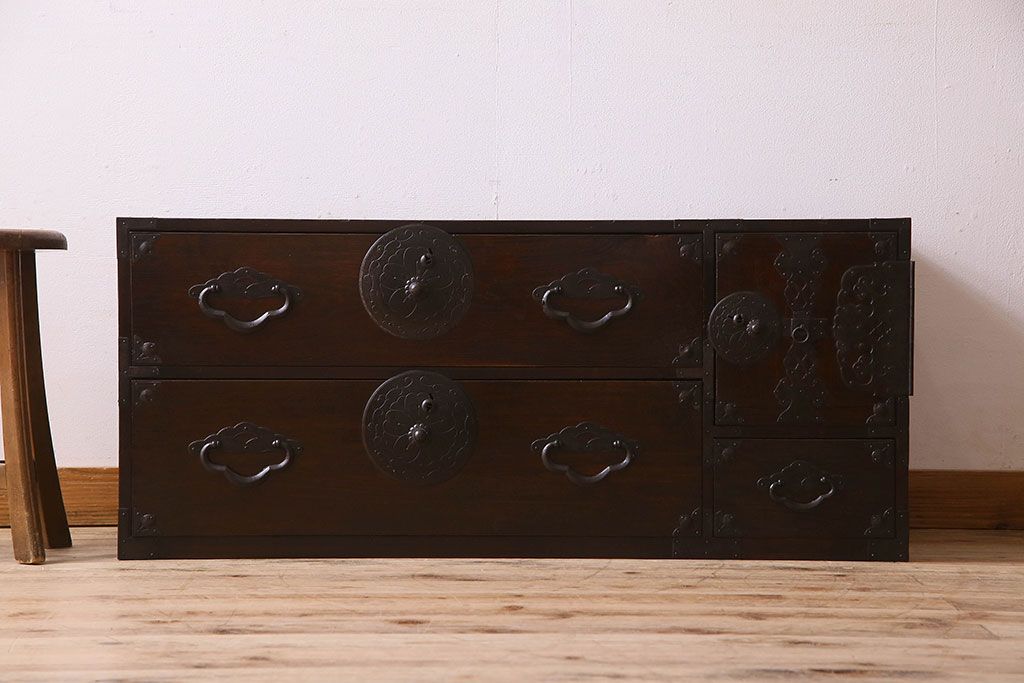 アンティーク家具 R-1 古民具・骨董 前面栗材の米沢箪笥・上段(衣装箪笥、ローボード、テレビボード)(1)
