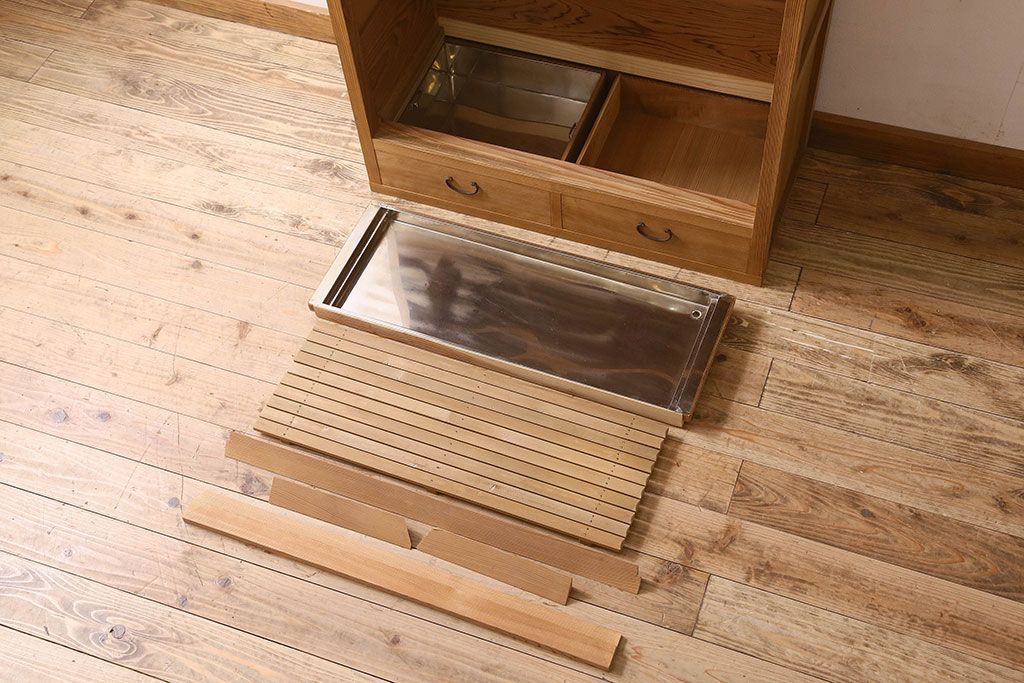 ラフジュ工房> キャビネット・戸棚> 食器棚・カップボード > アンティーク家具 和モダン 1970年頃 明るい木肌が印象的な茶水屋(置き水屋、戸棚、収納棚)