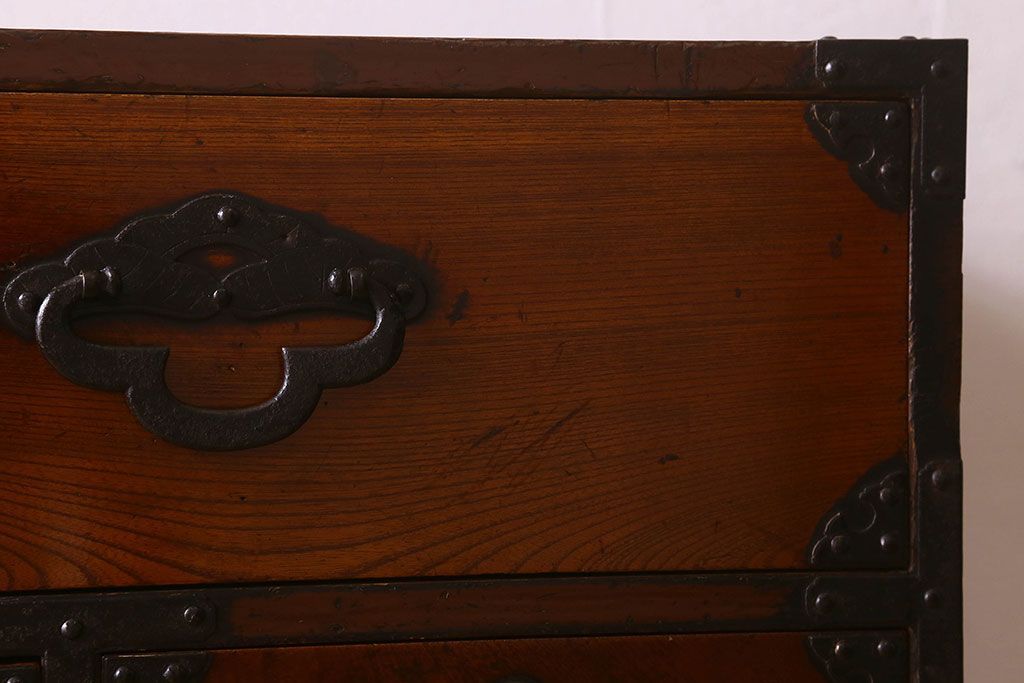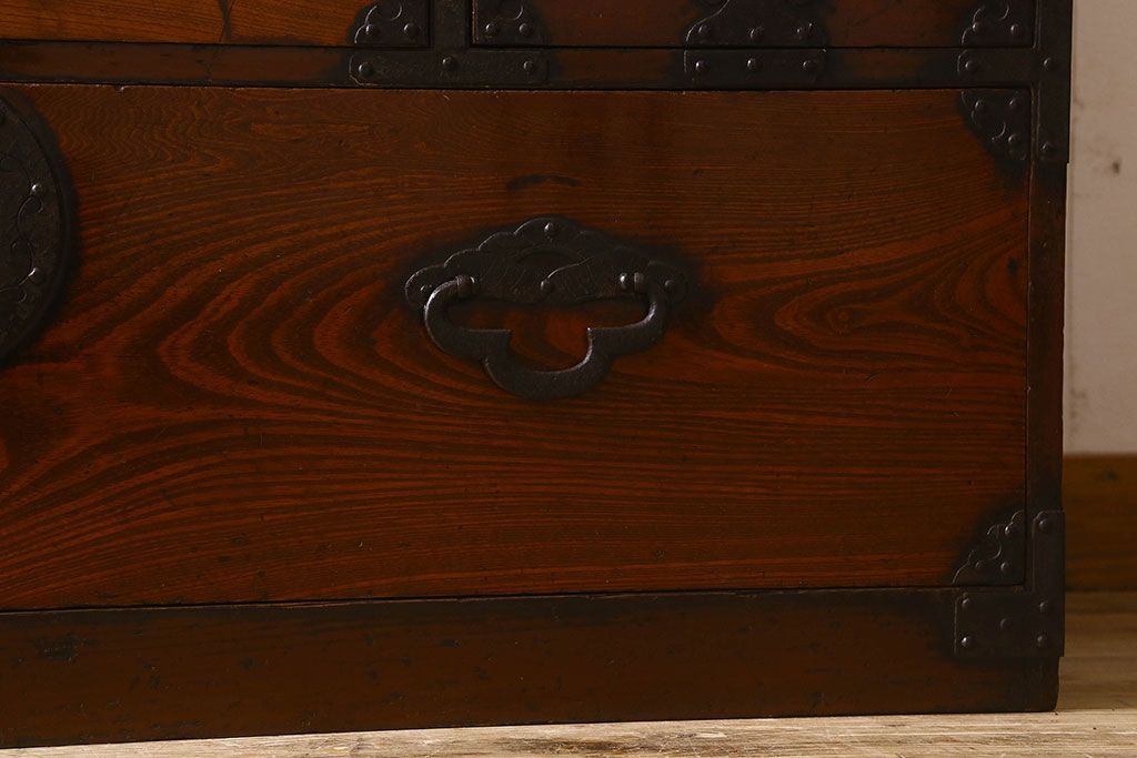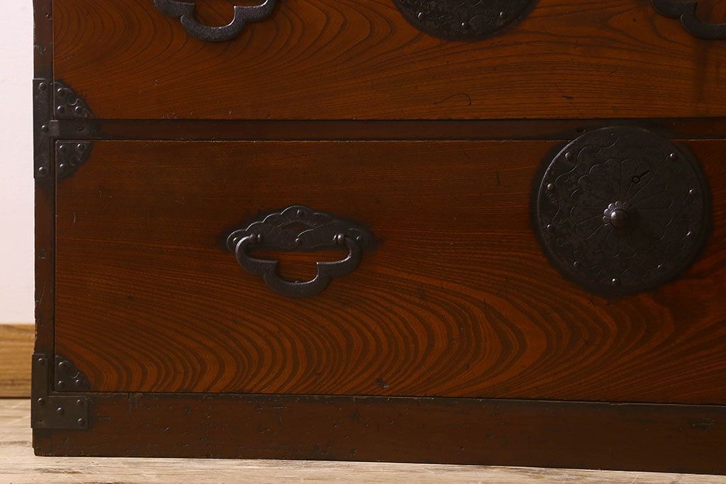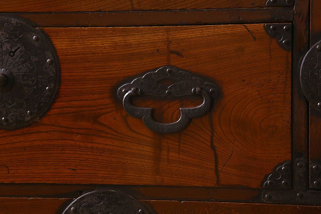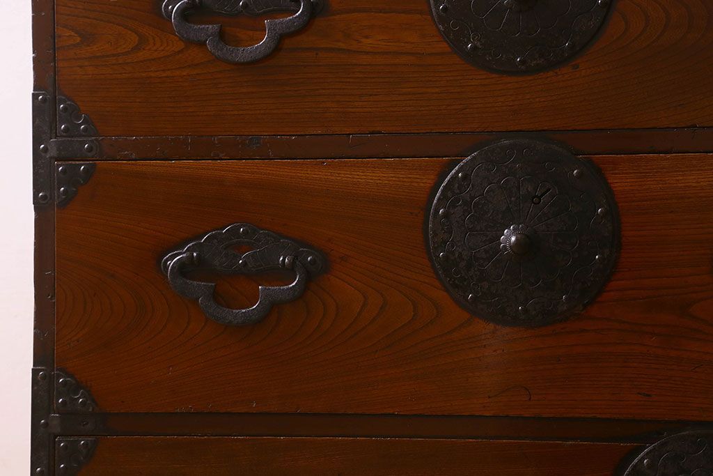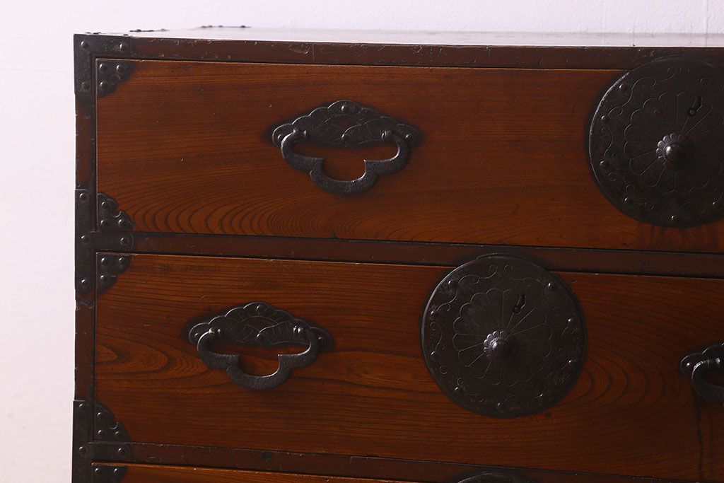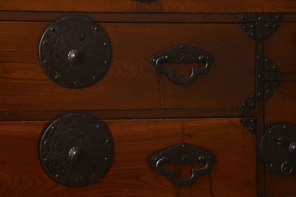 アンティーク家具 和製アンティーク 前面欅材 漆塗り 菊の描かれた金具が和の空間を引きたてる米沢箪笥(衣装箪笥、引き出し)