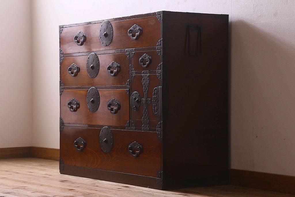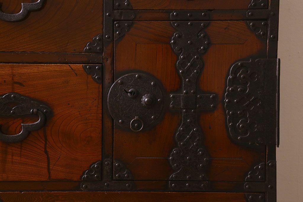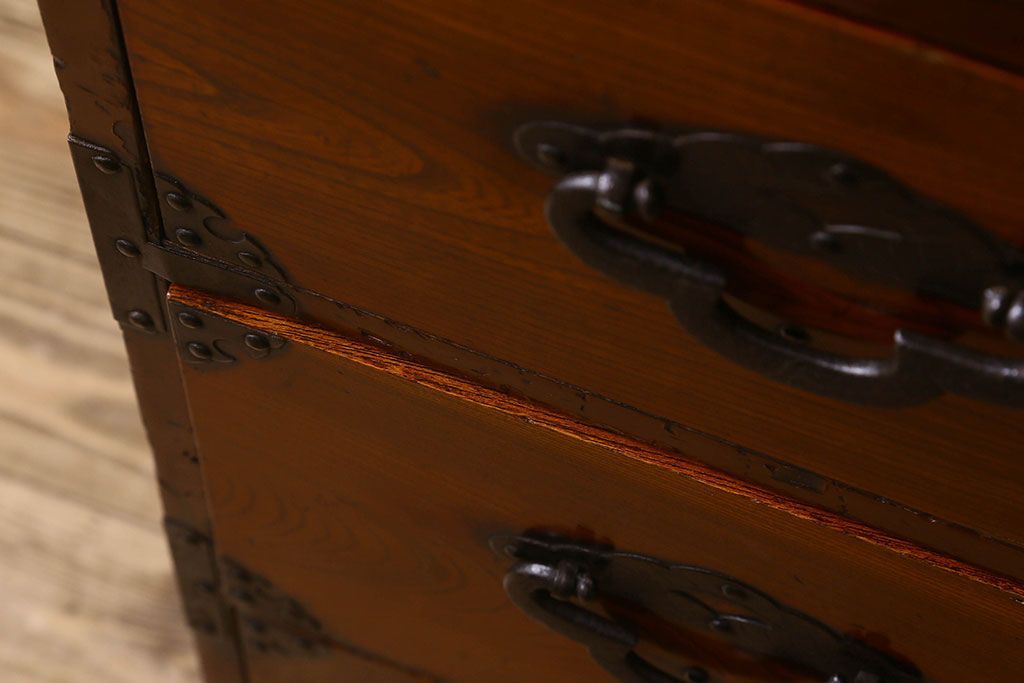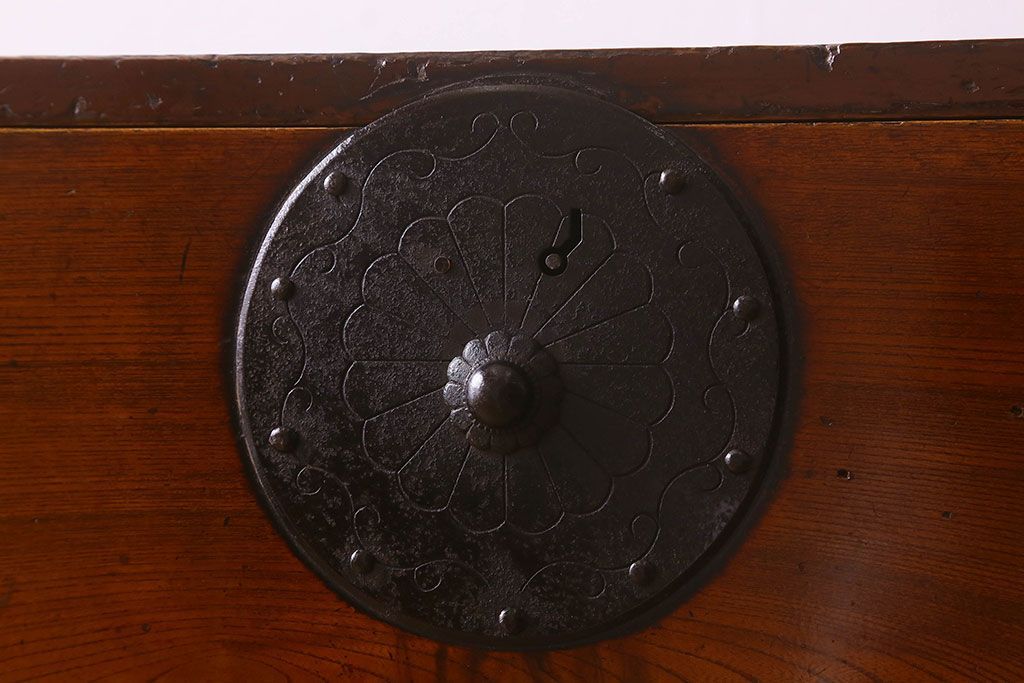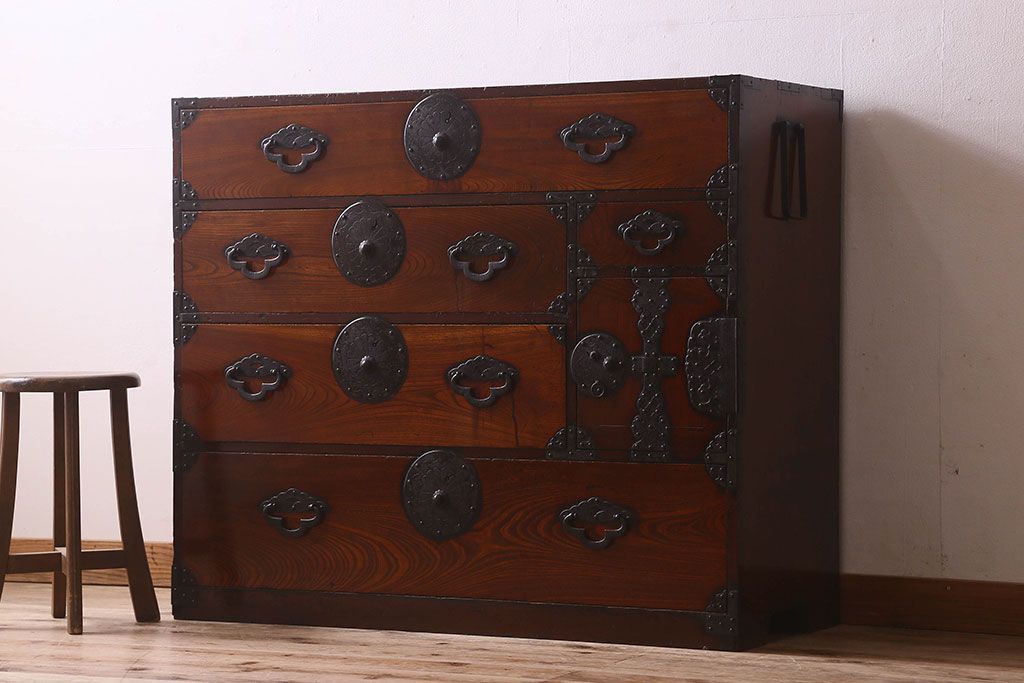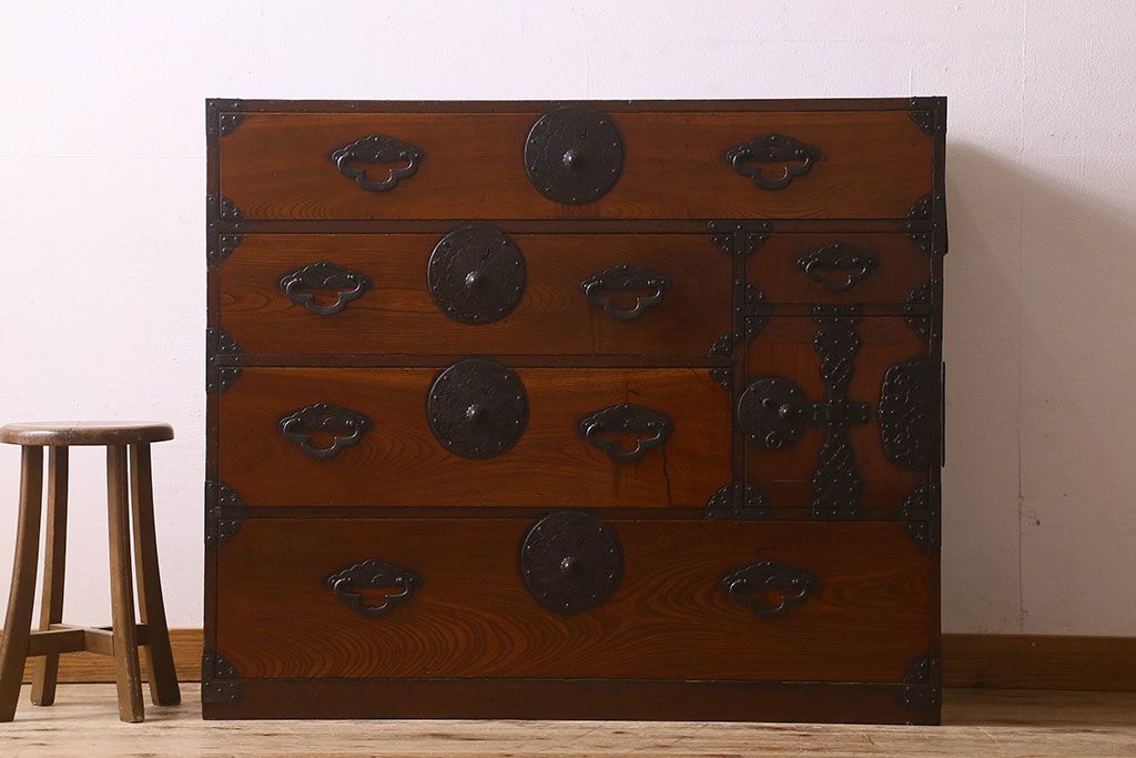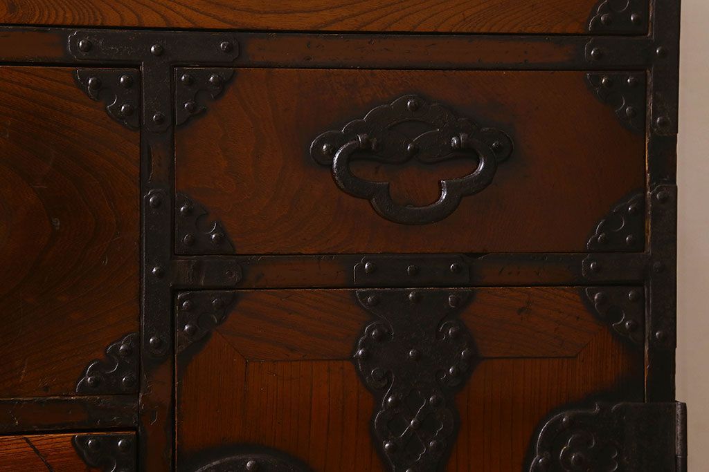 アンティーク家具 和製アンティーク 前面欅材 漆塗り 菊の描かれた金具が和の空間を引きたてる米沢箪笥(衣装箪笥、引き出し)