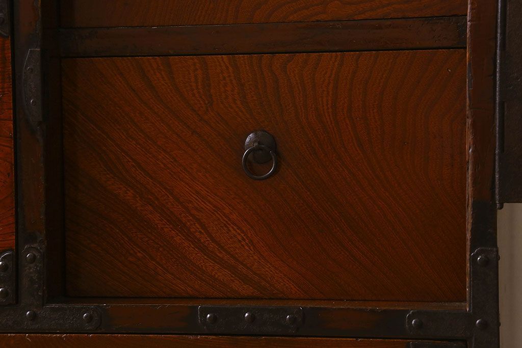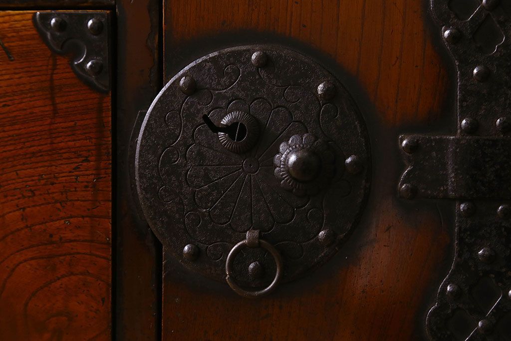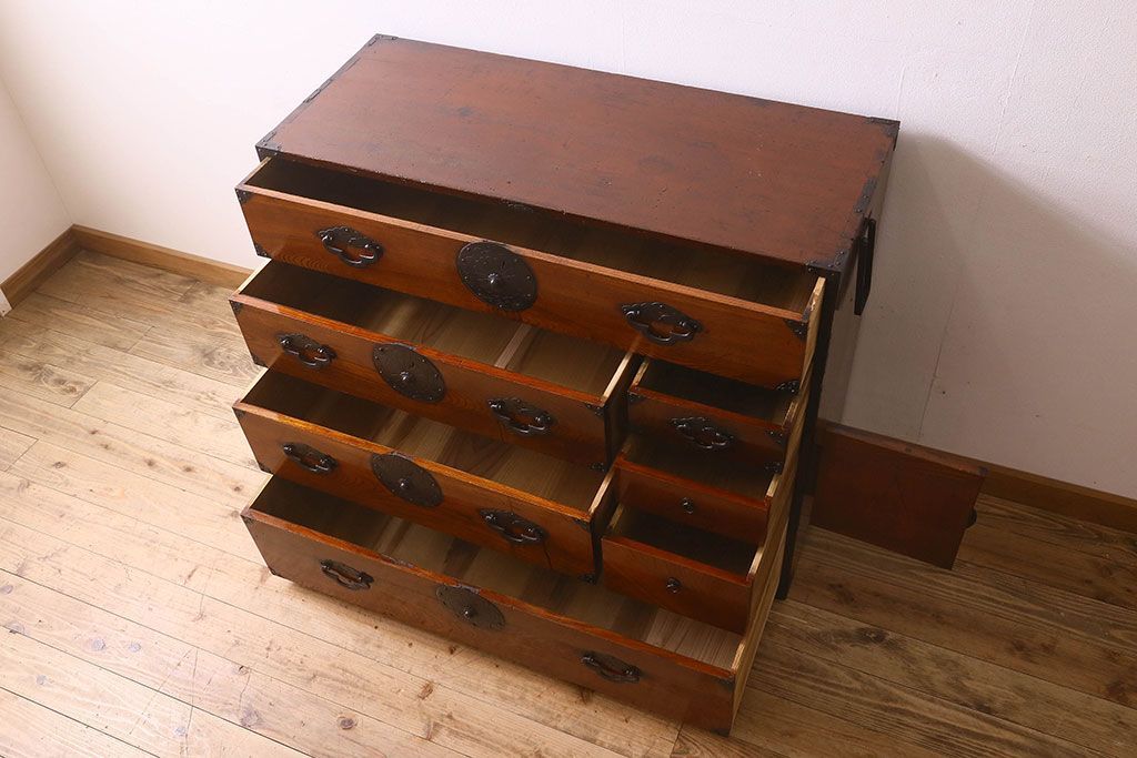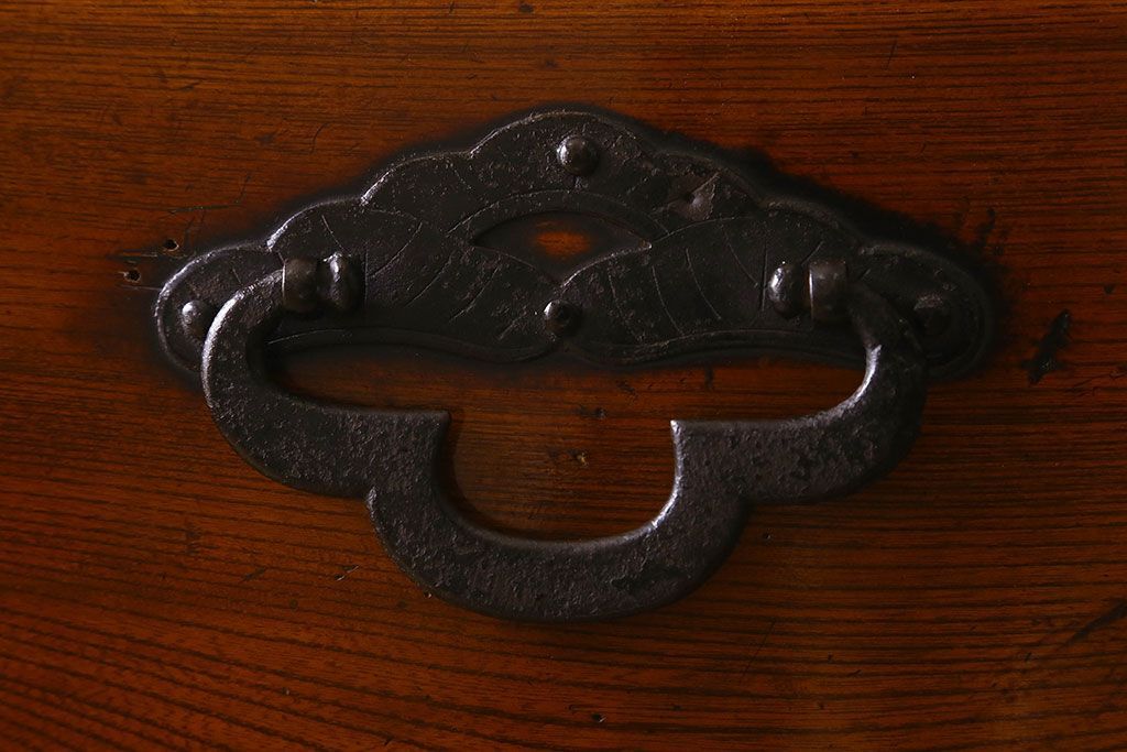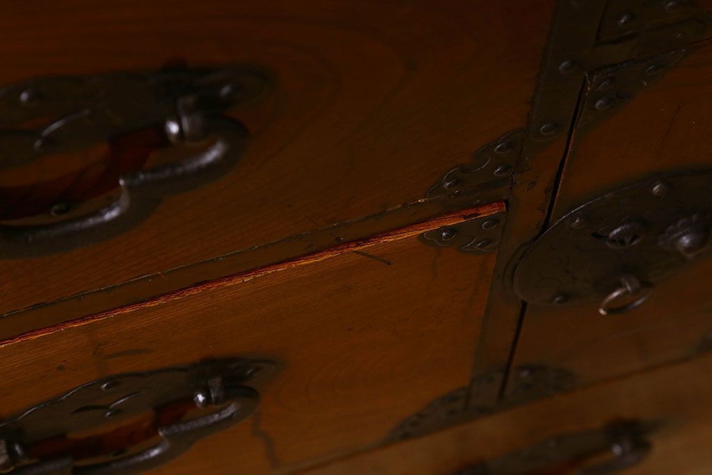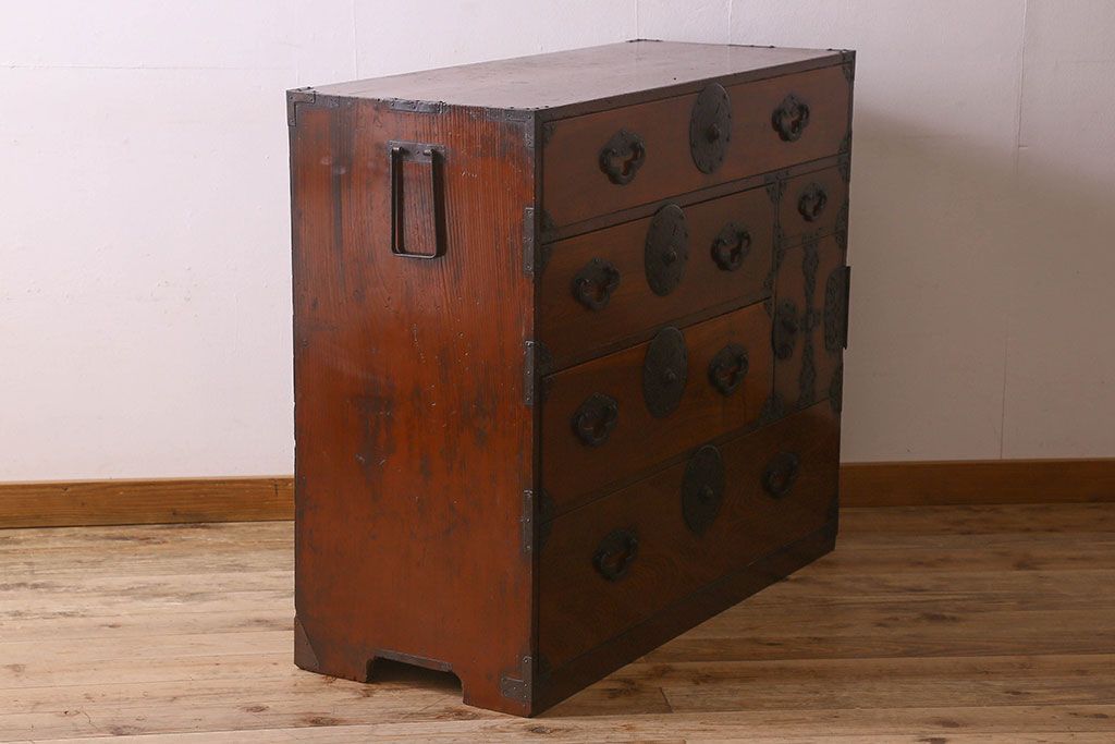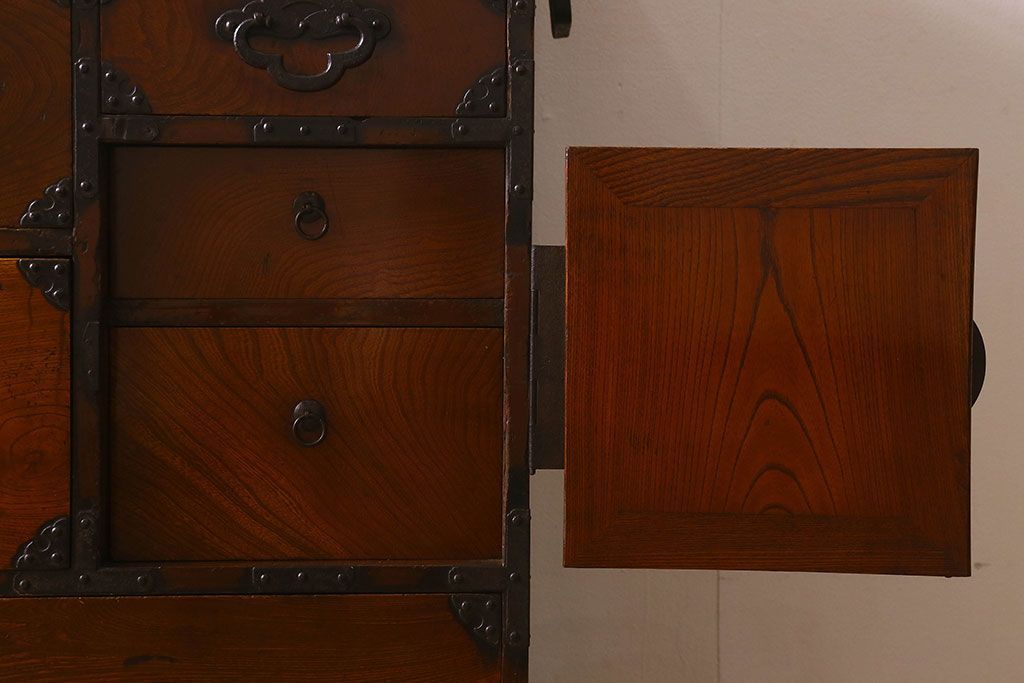 アンティーク家具 和製アンティーク 前面欅材 漆塗り 菊の描かれた金具が和の空間を引きたてる米沢箪笥(衣装箪笥、引き出し)