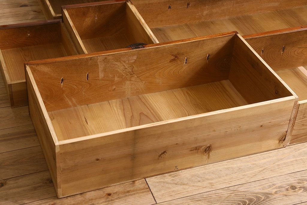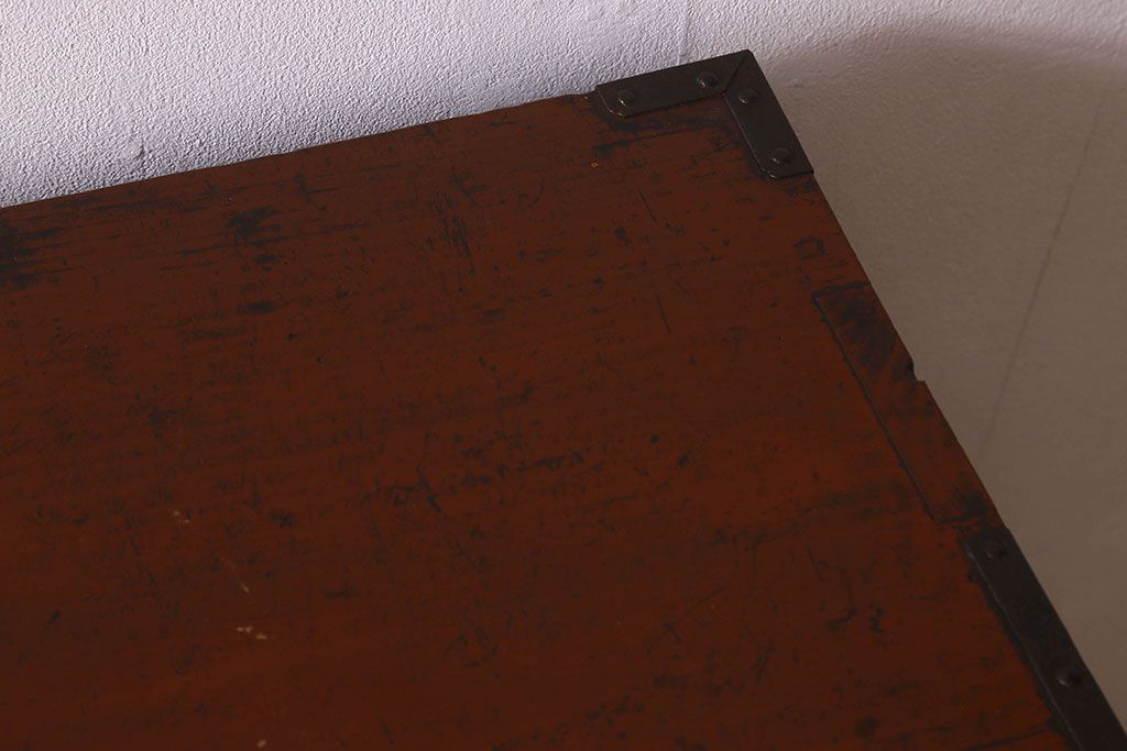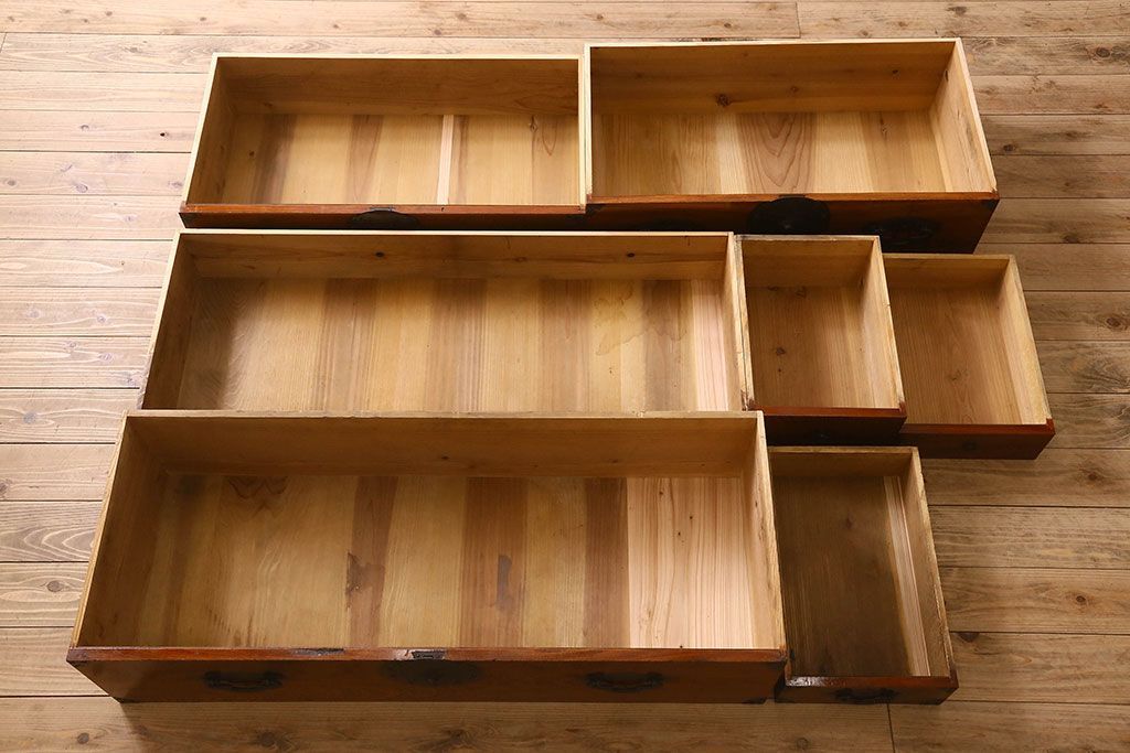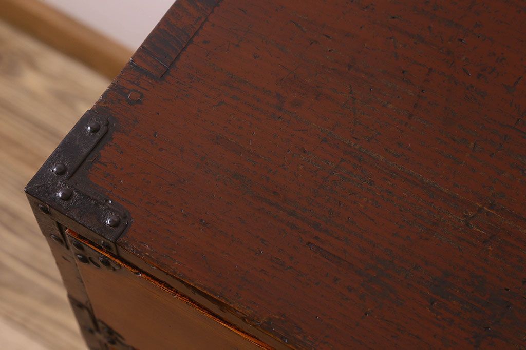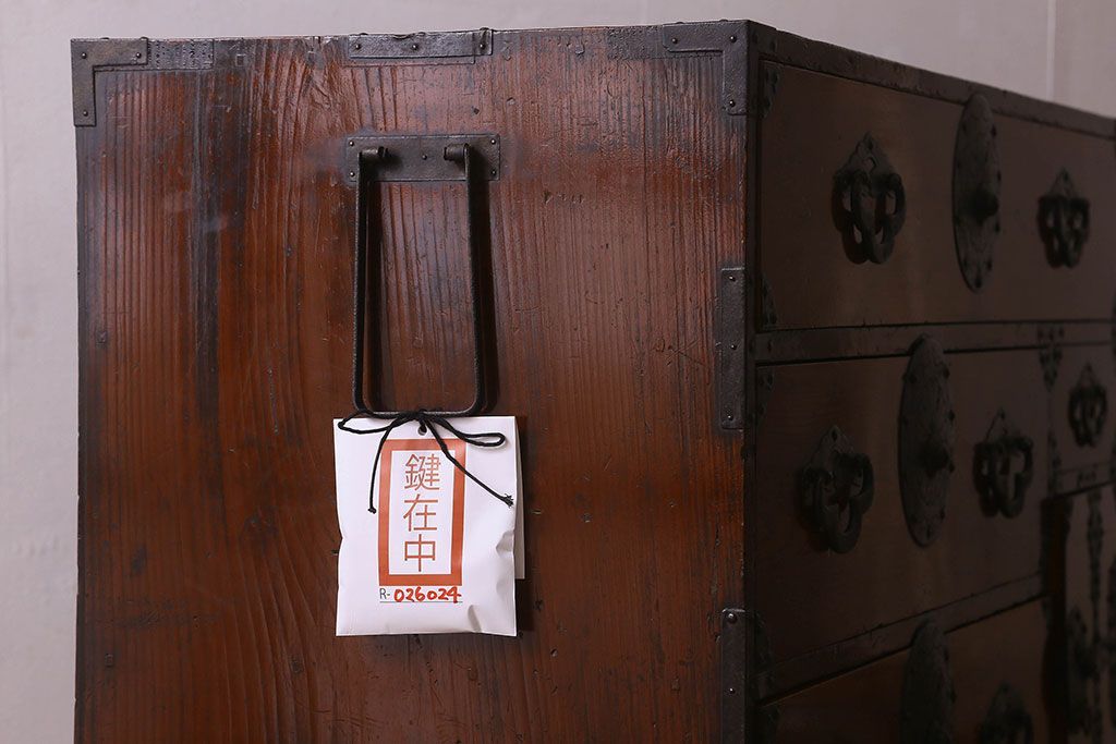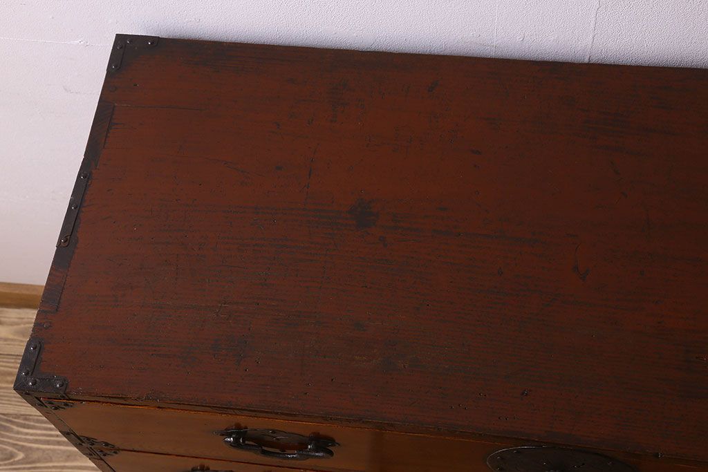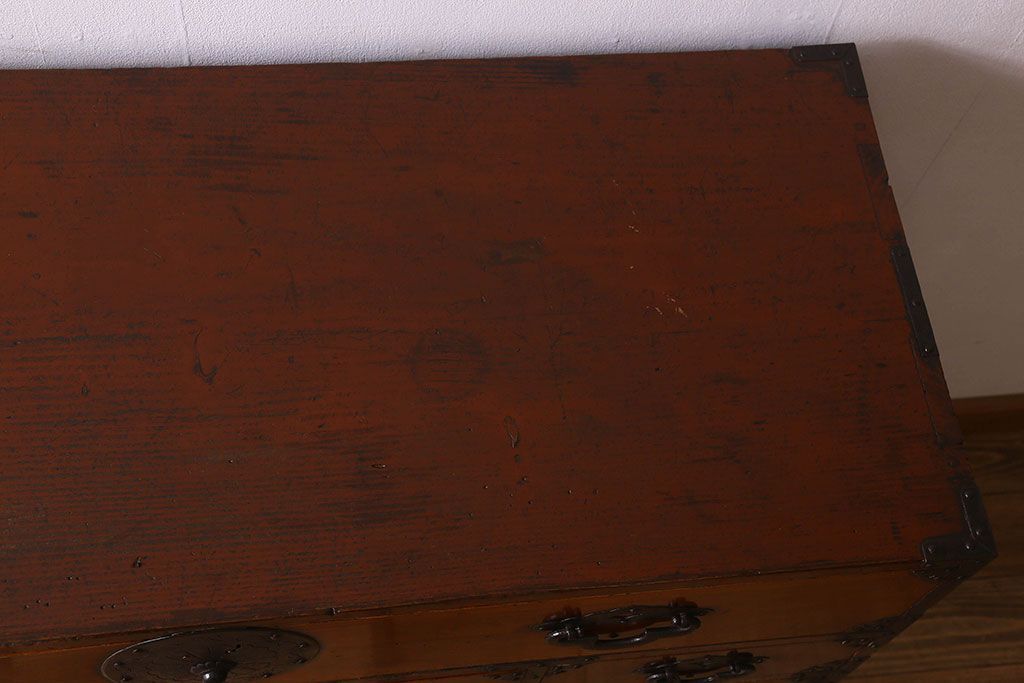 アンティーク家具 和製アンティーク 前面欅材 漆塗り 菊の描かれた金具が和の空間を引きたてる米沢箪笥(衣装箪笥、引き出し)