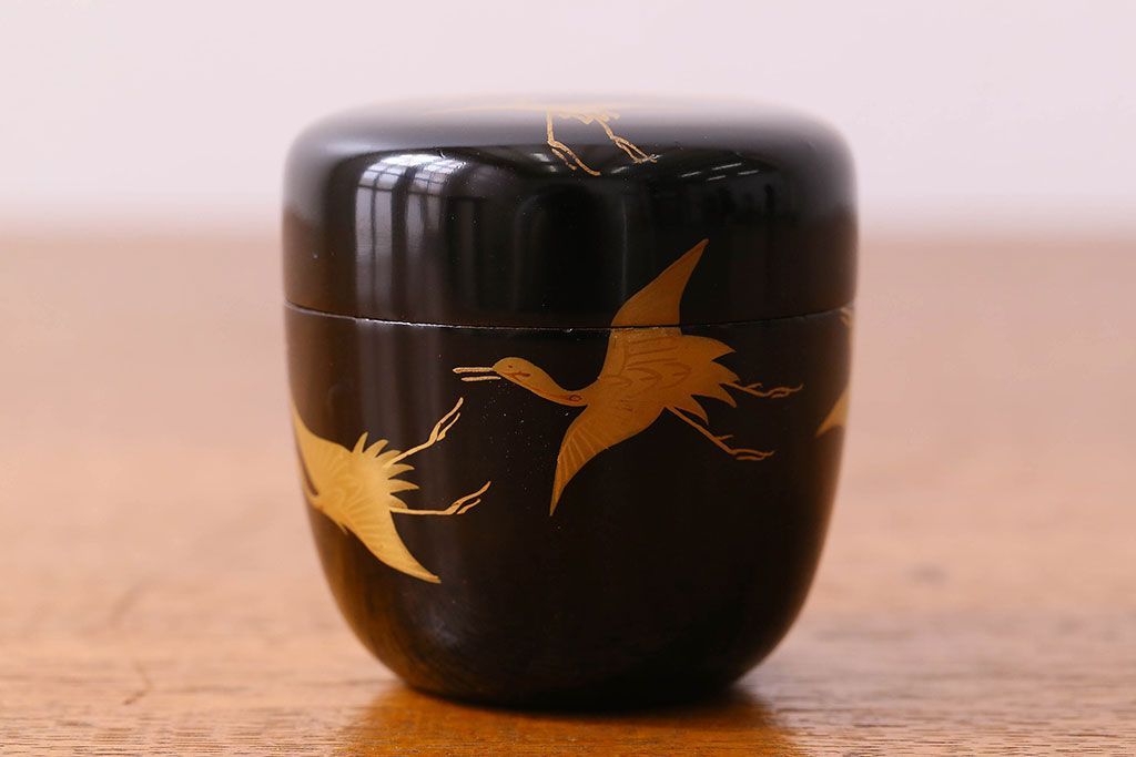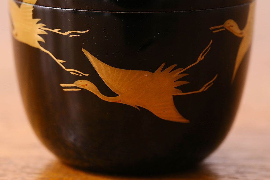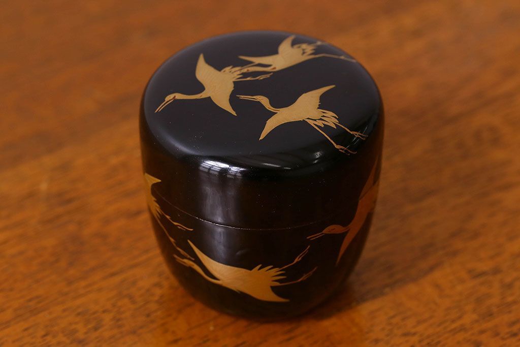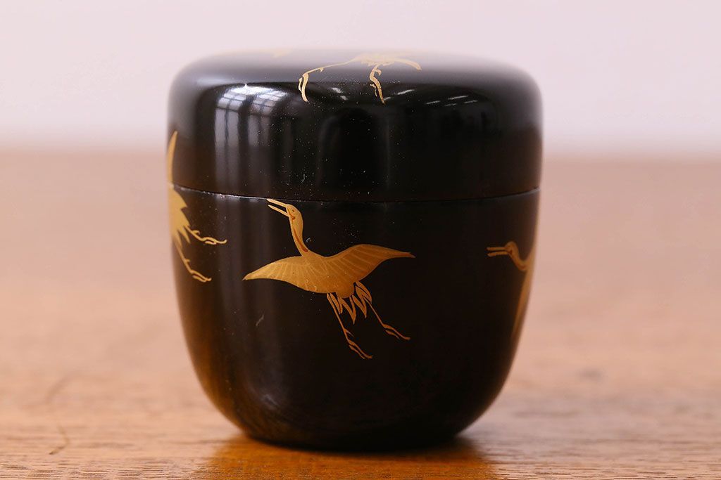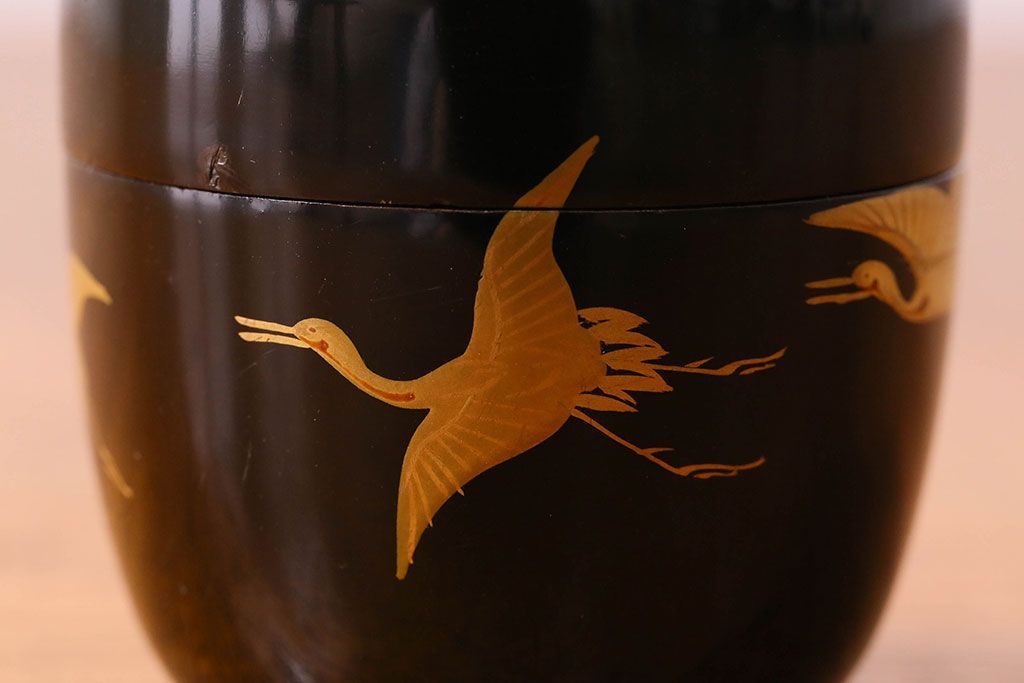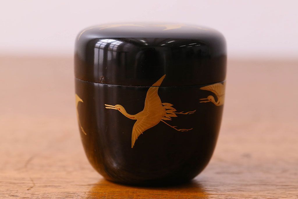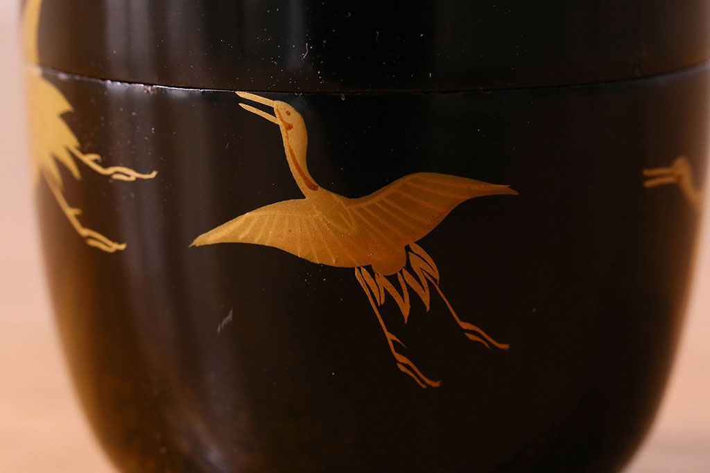 ラフジュ工房> 和食器・茶道具> 茶道具・鉄瓶 > アンティーク雑貨 明治大正期 鶴蒔絵 木製棗(なつめ、茶道具)