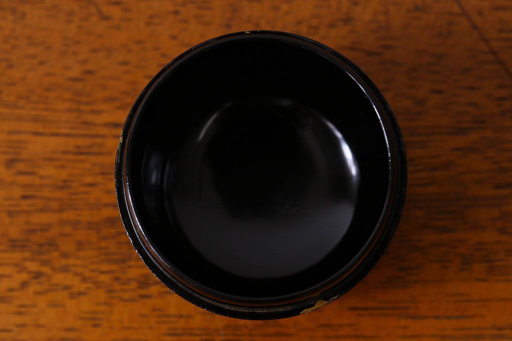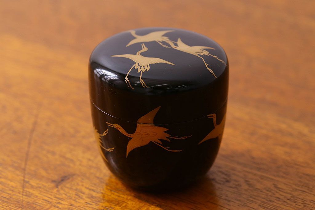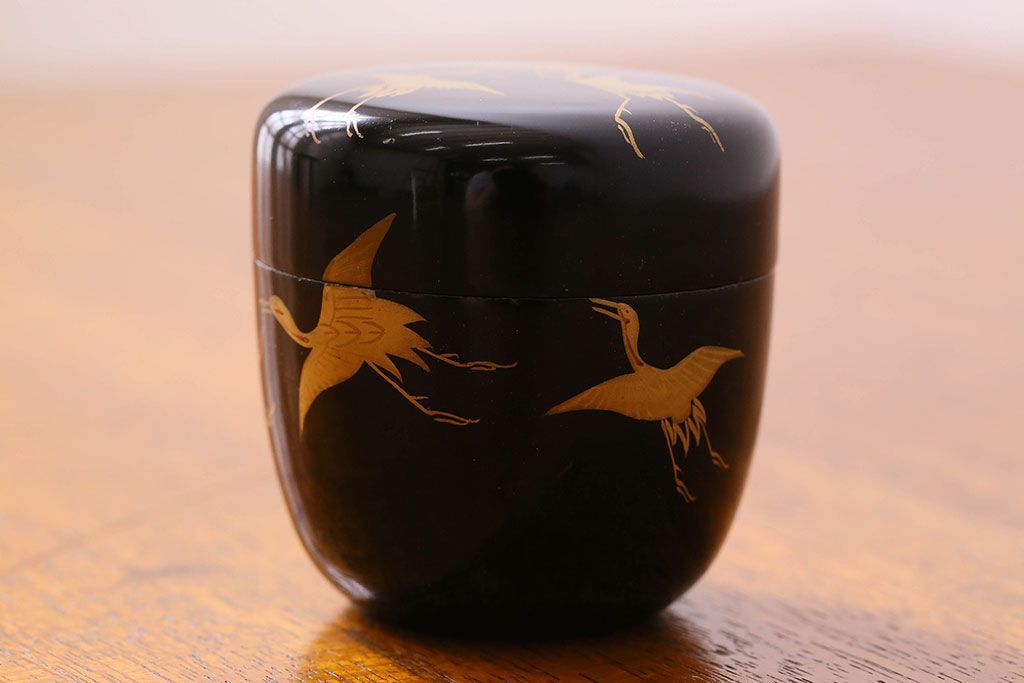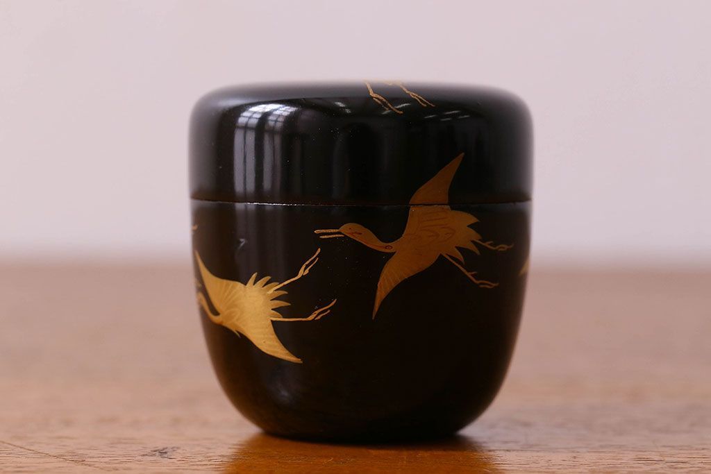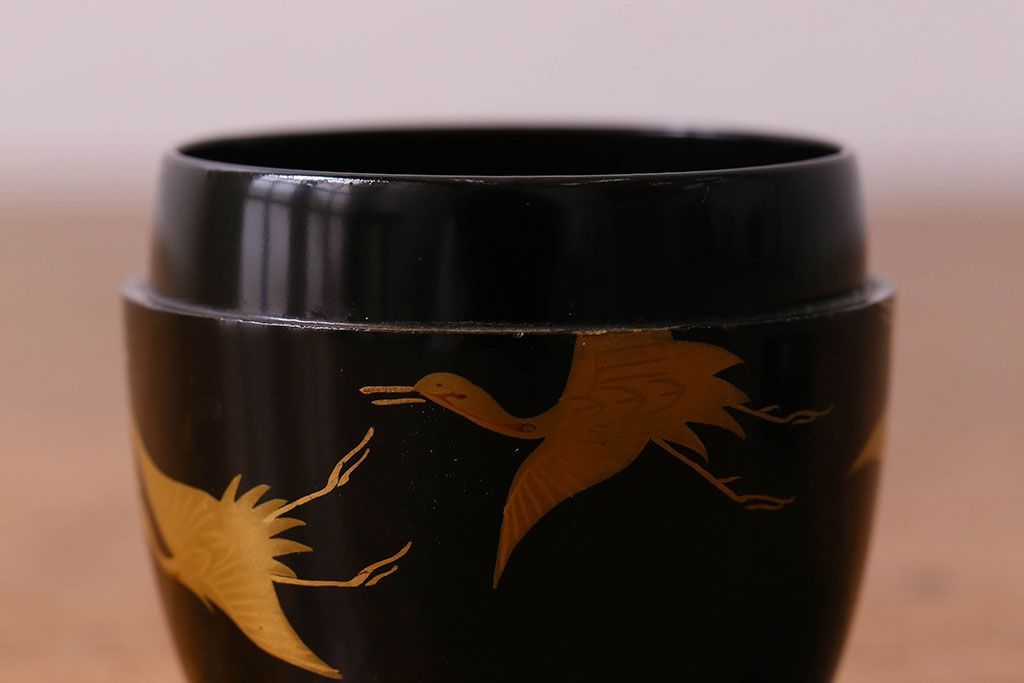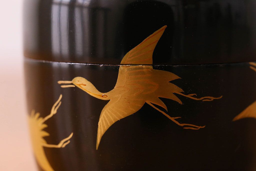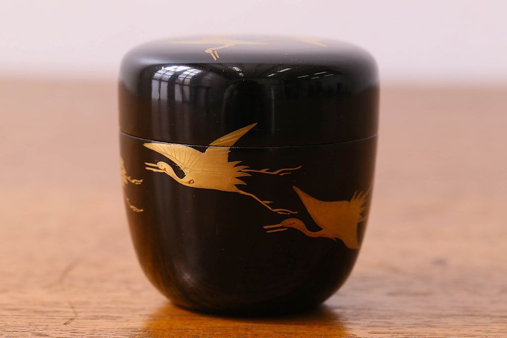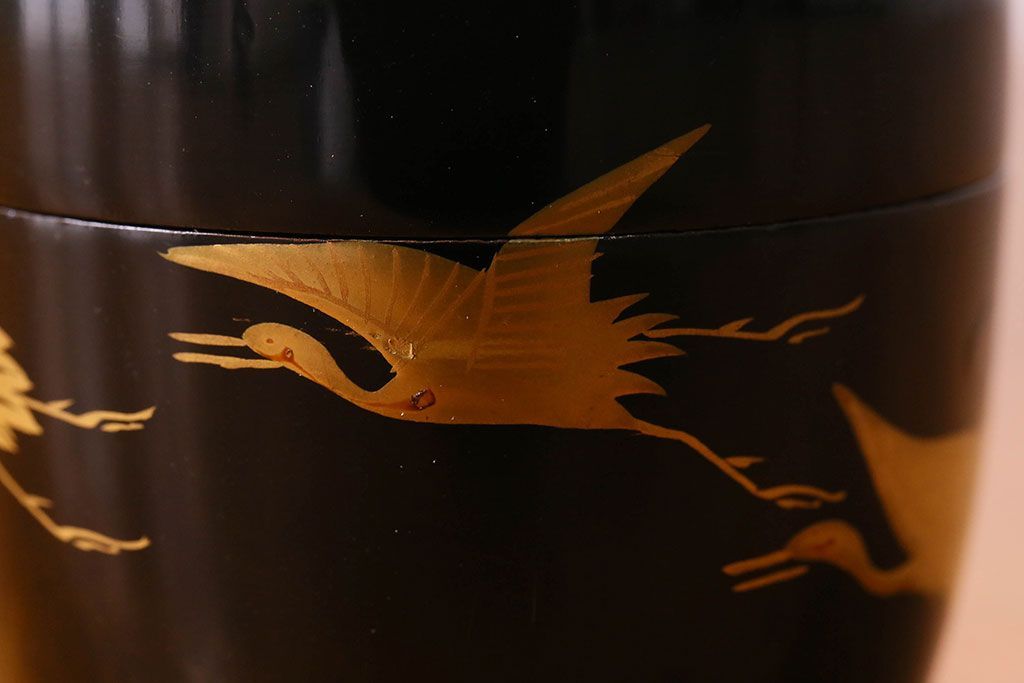 ラフジュ工房> 和食器・茶道具> 茶道具・鉄瓶 > アンティーク雑貨 明治大正期 鶴蒔絵 木製棗(なつめ、茶道具)