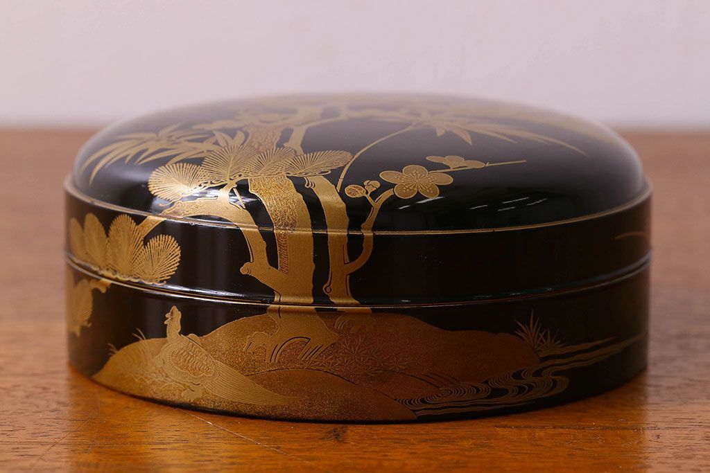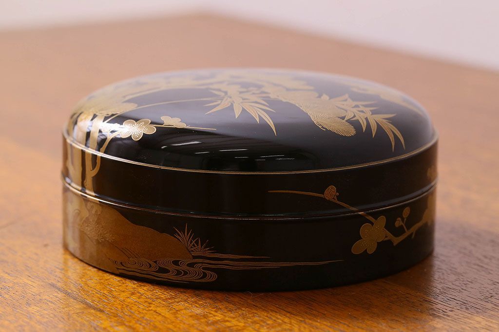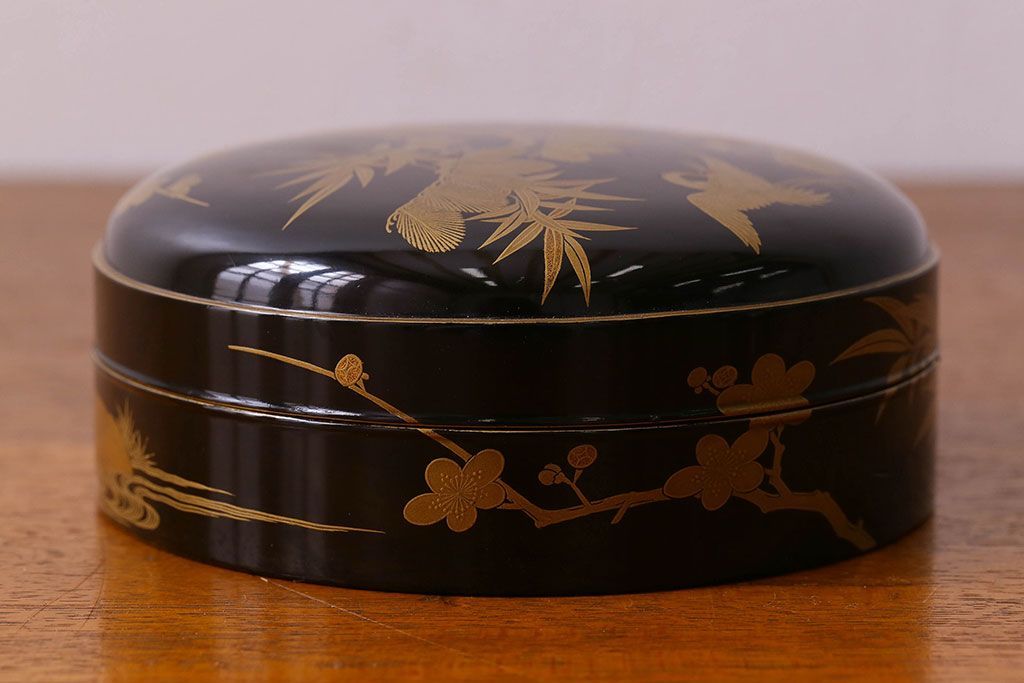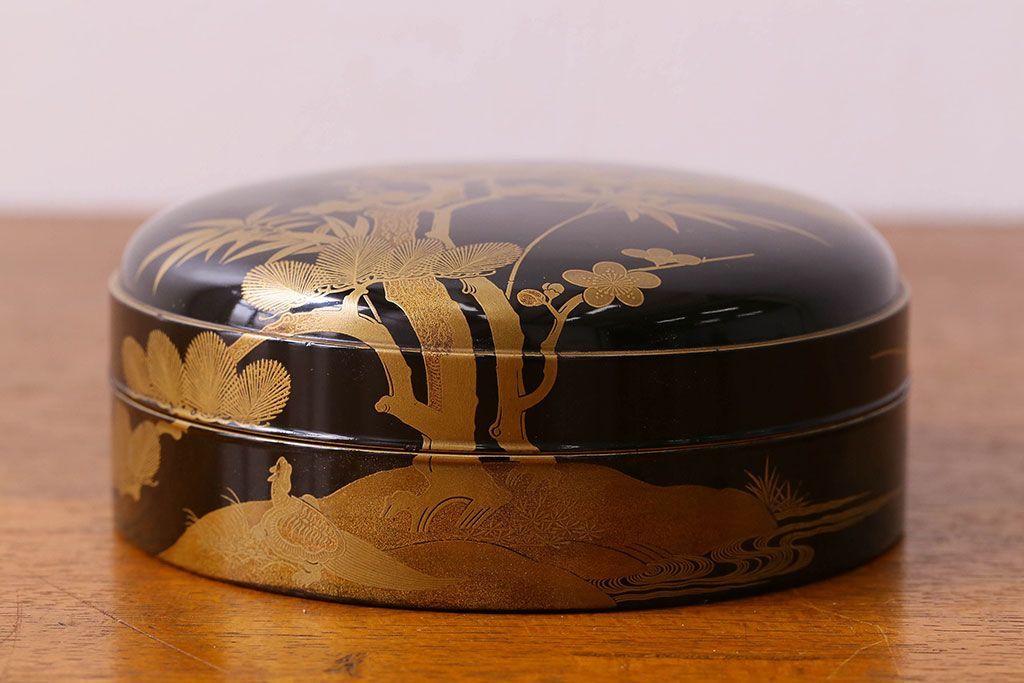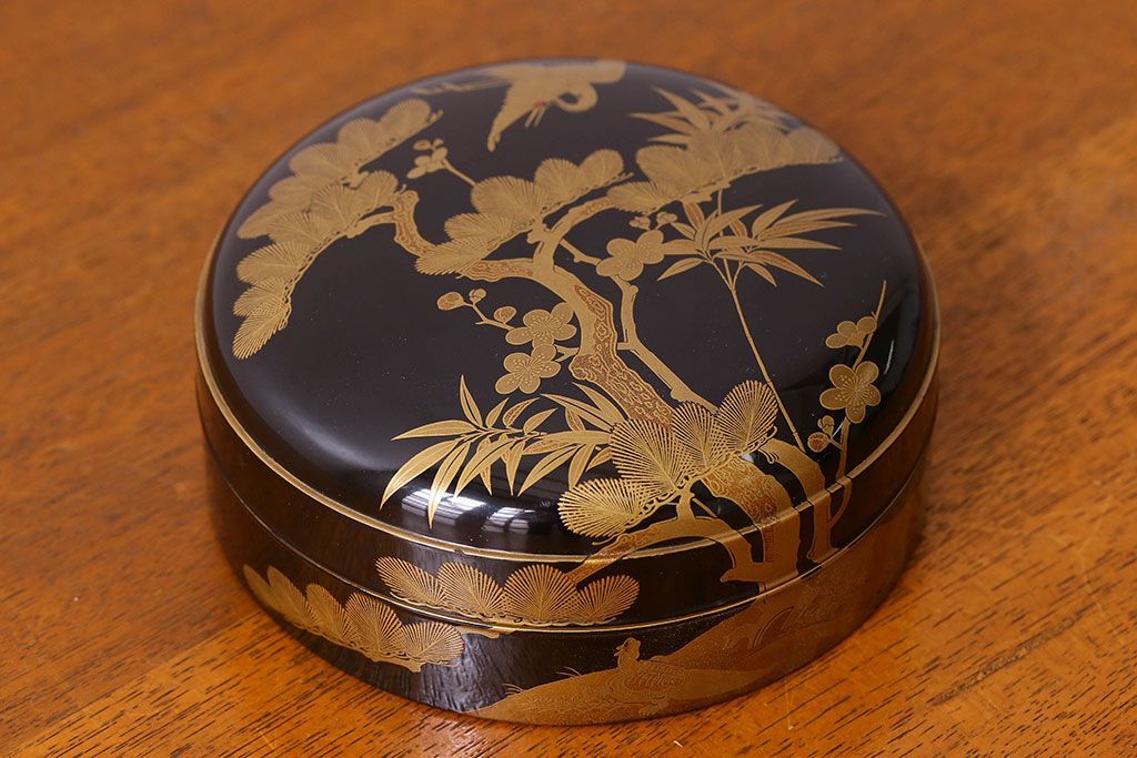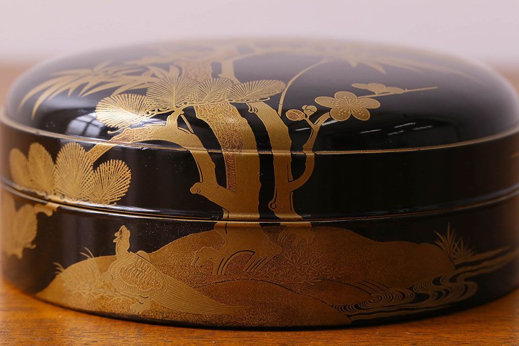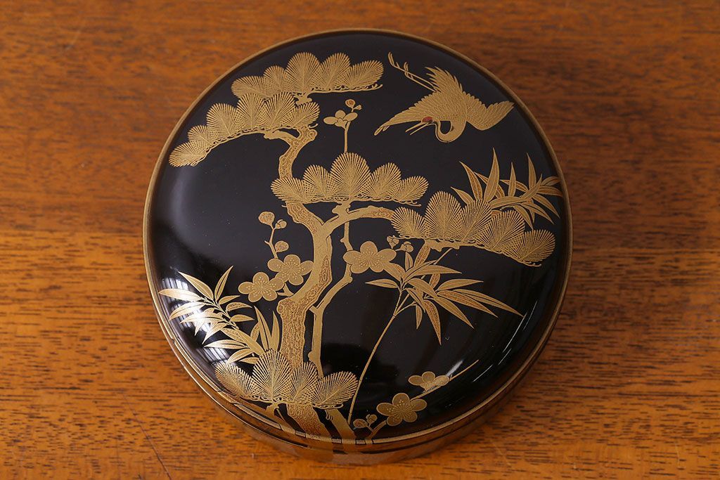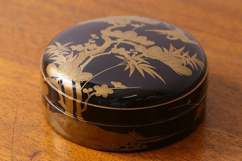 アンティーク雑貨 明治期 松竹梅鶴亀図 木製時代箱・蒔絵(小物収納箱、茶道具)