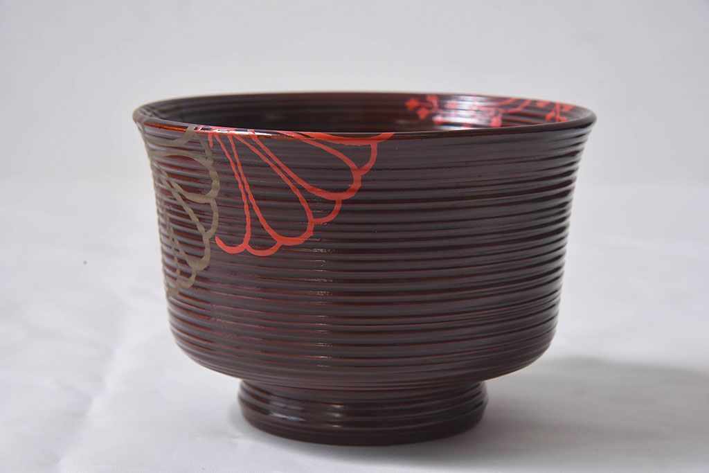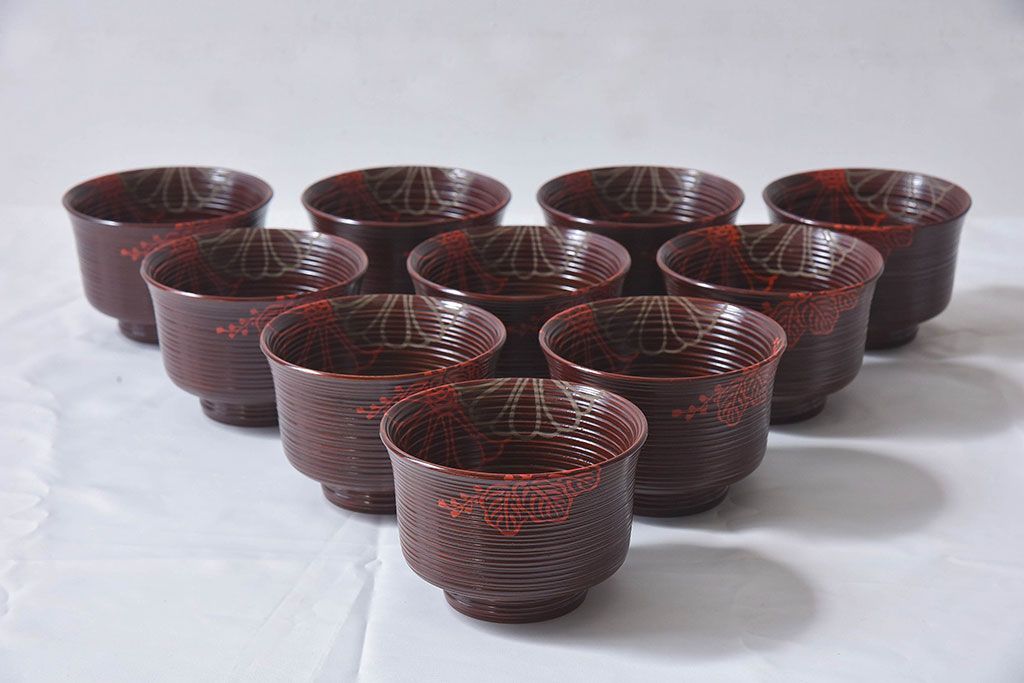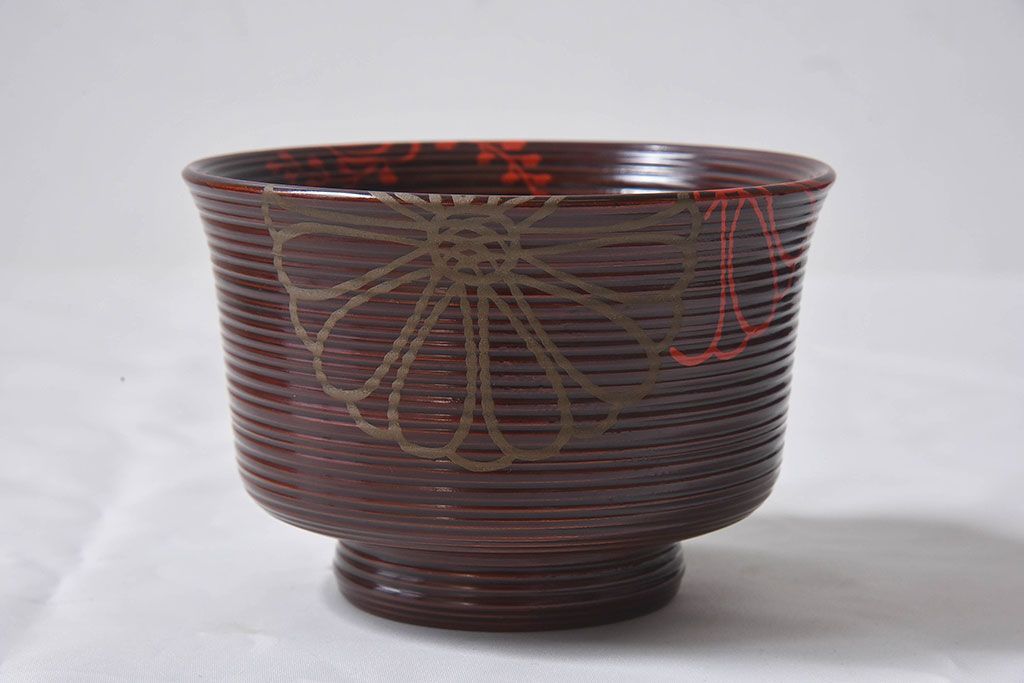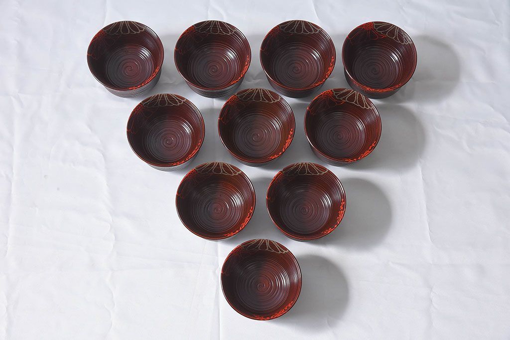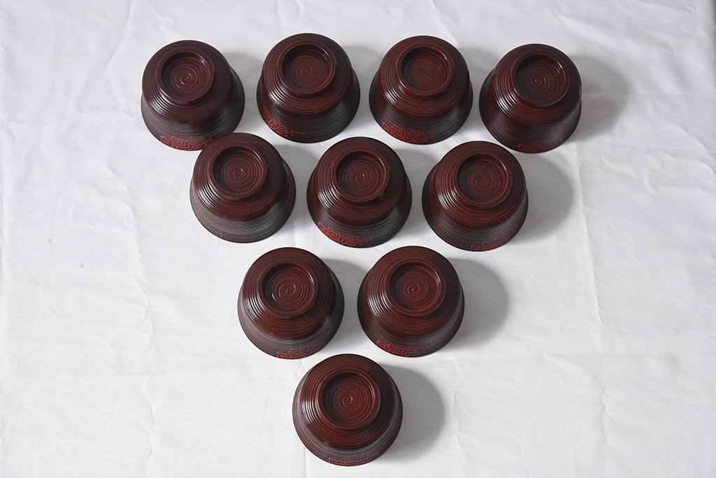 ラフジュ工房> 和食器・茶道具> お椀・茶碗 > アンティーク 春次作 引目溜塗菊桐 盃洗(お椀、漆器)10客