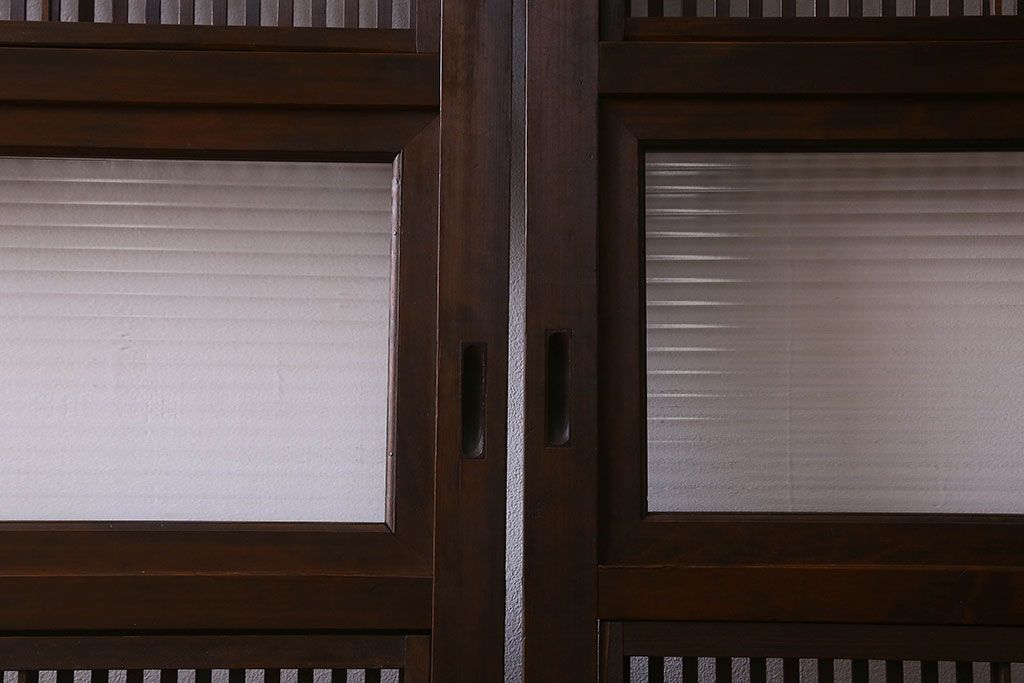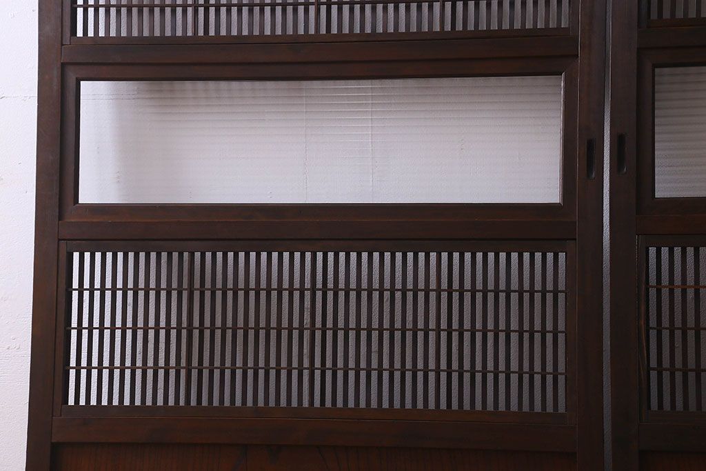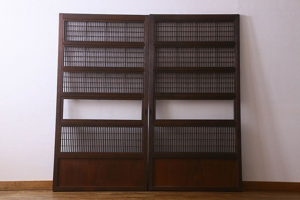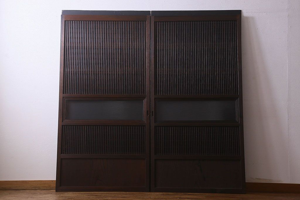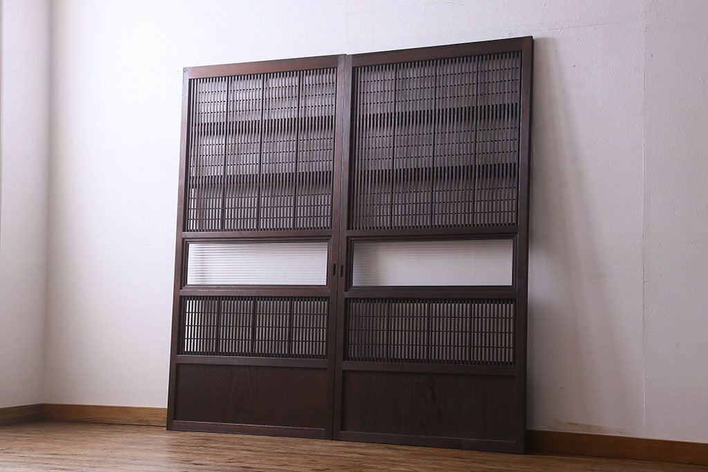和製アンティーク 腰板ケヤキ材 モダン 裏障子付きの帯格子戸(引き戸、建具)2枚組