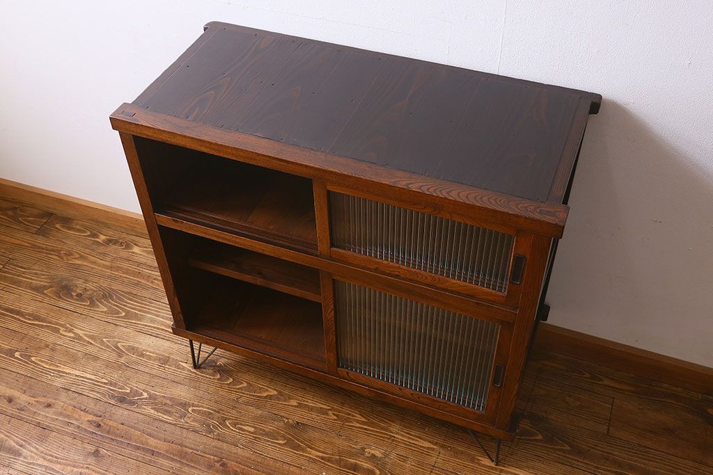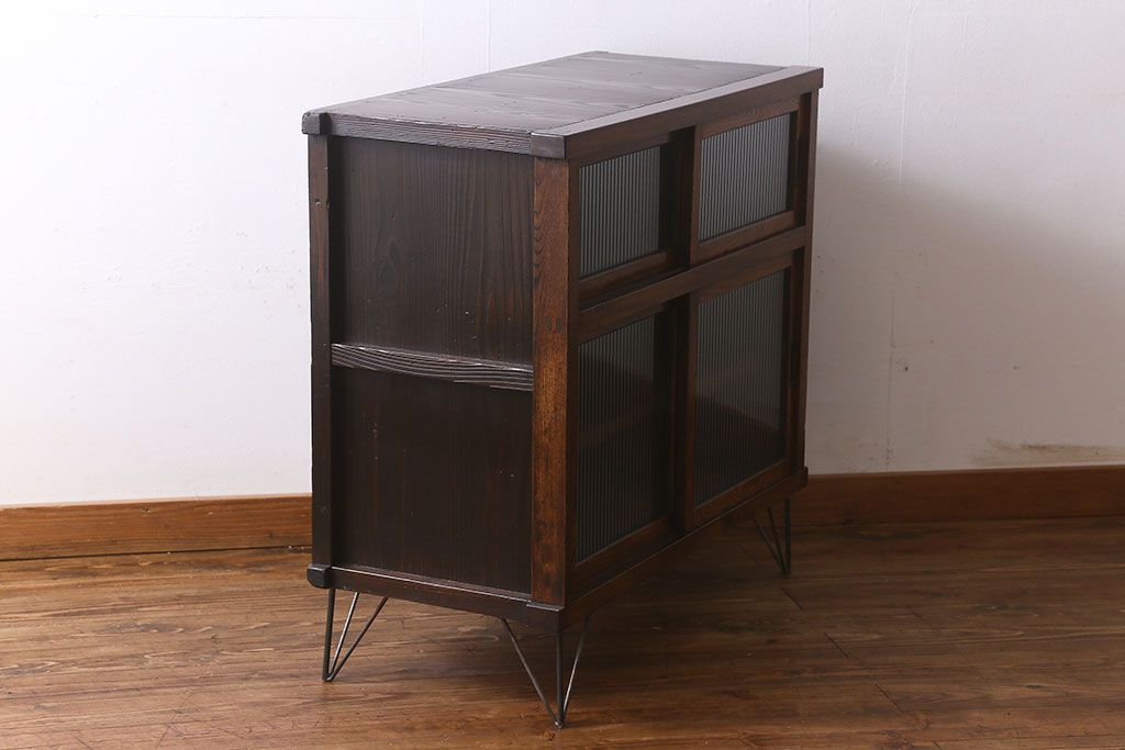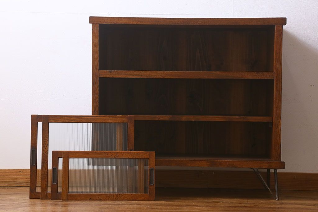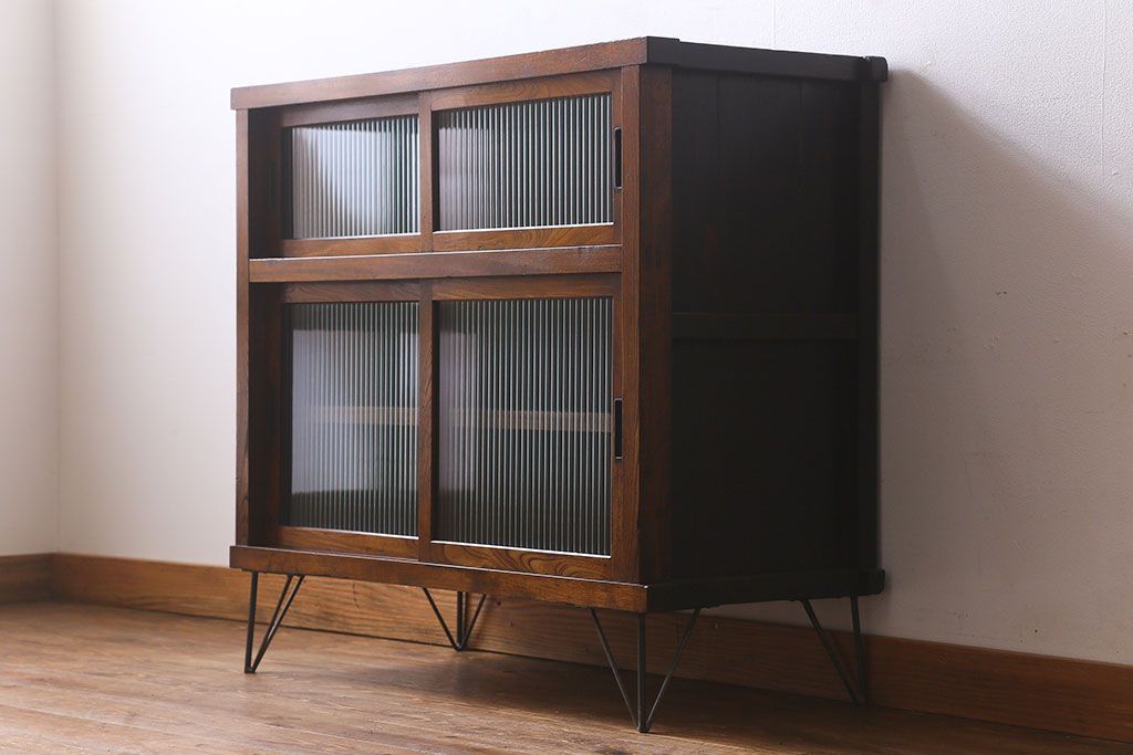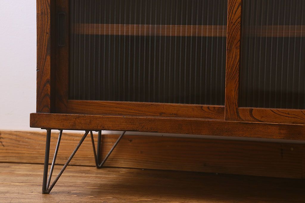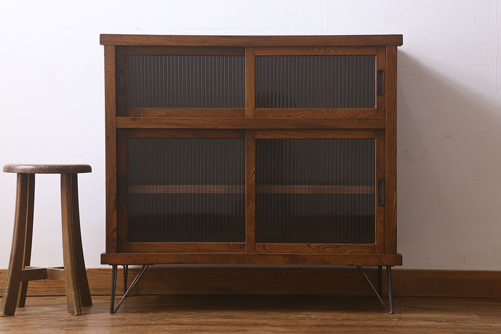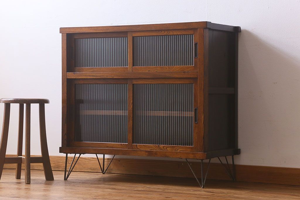 ラフジュ工房> キャビネット・戸棚> 食器棚・カップボード > アンティーク家具 和製アンティーク 前面ケヤキ材 モールガラスがおしゃれな鉄脚付の戸棚(収納棚、食器棚、本箱)