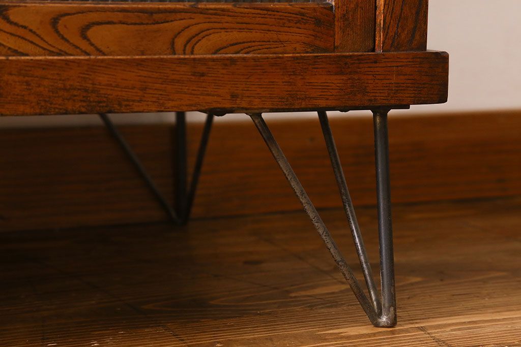 アンティーク家具 和製アンティーク 前面ケヤキ材 モールガラスがおしゃれな鉄脚付の戸棚(収納棚、食器棚、本箱)