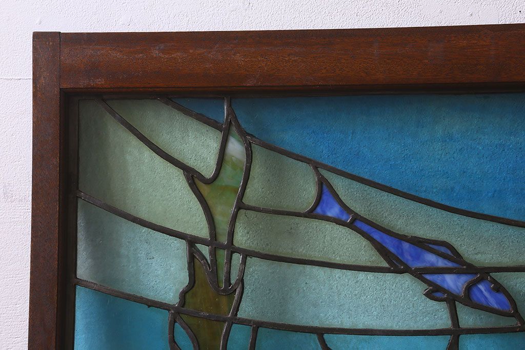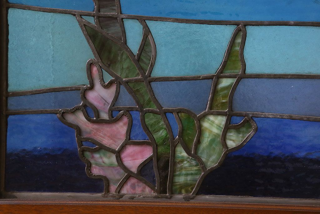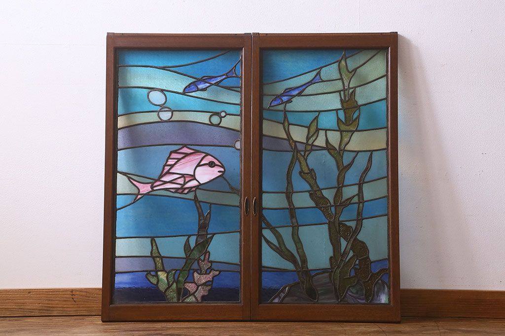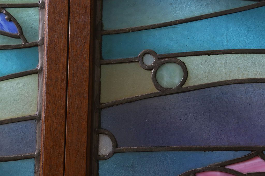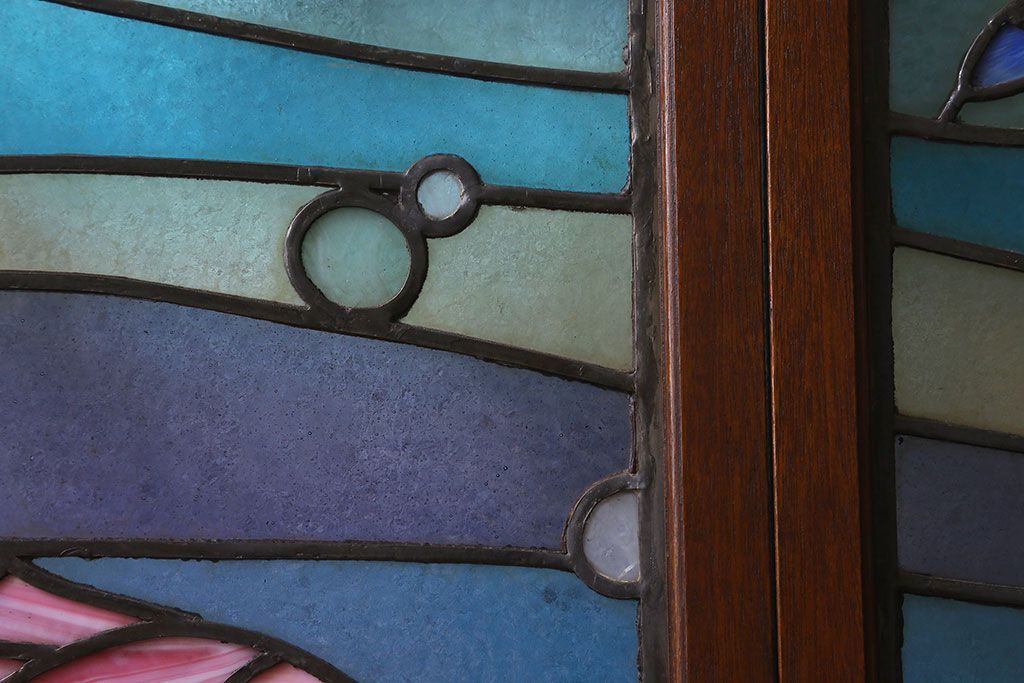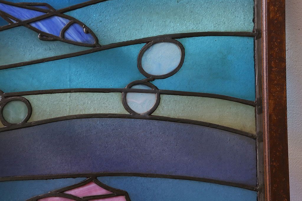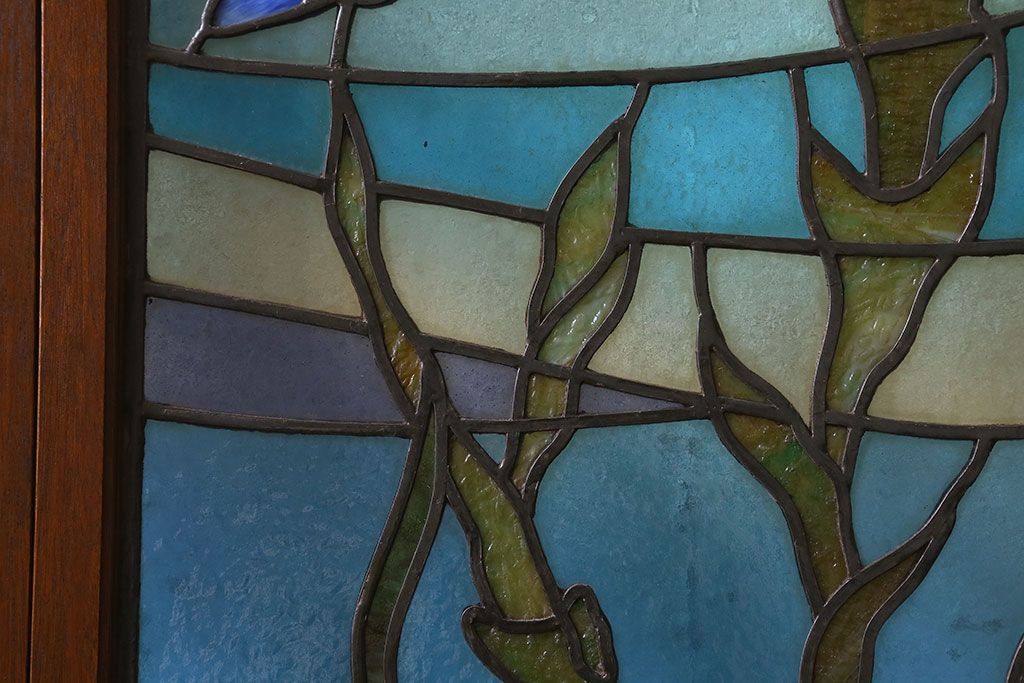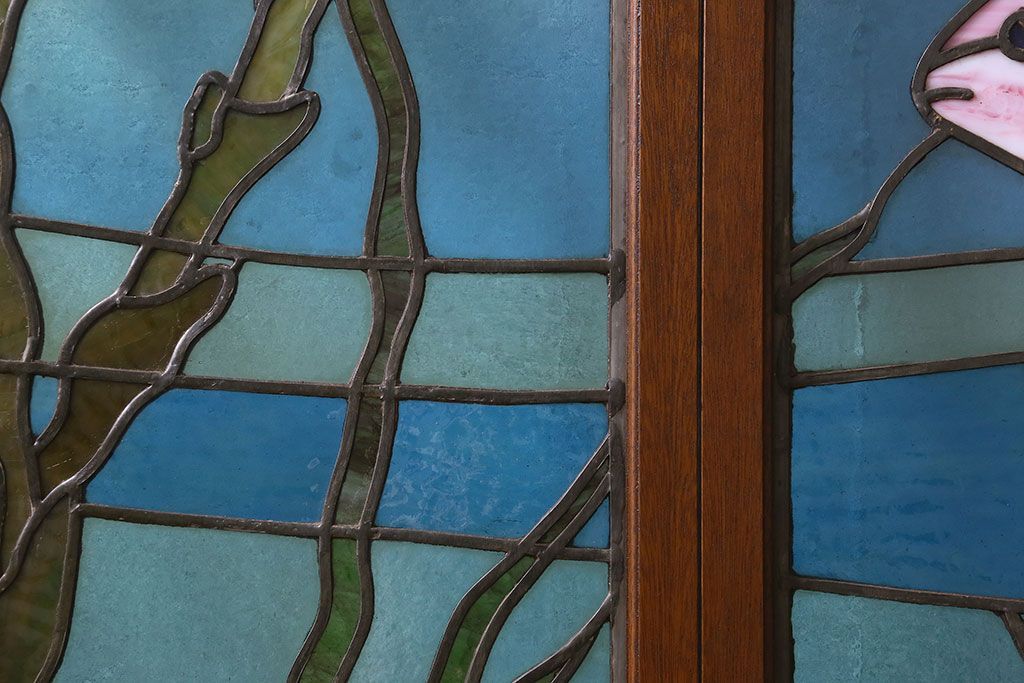 アンティーク雑貨 昭和初期 海の中にいるような図柄が素敵なステンドグラスのガラス戸(引き戸、建具)