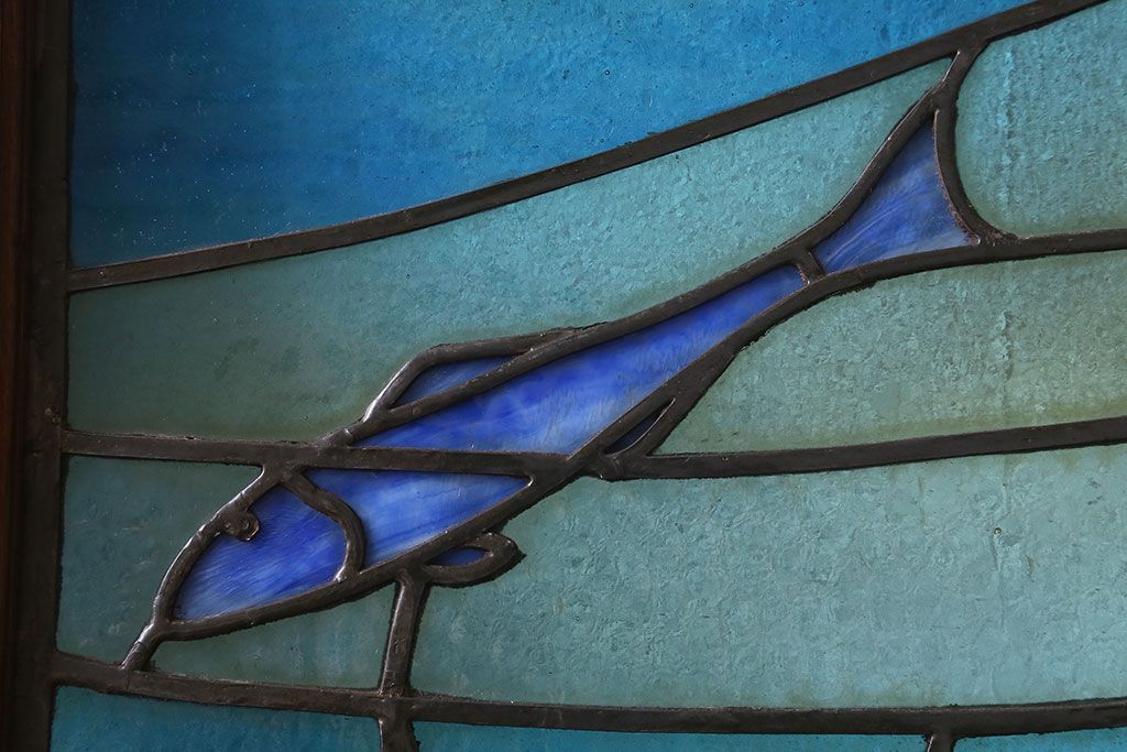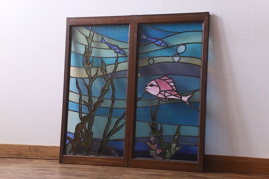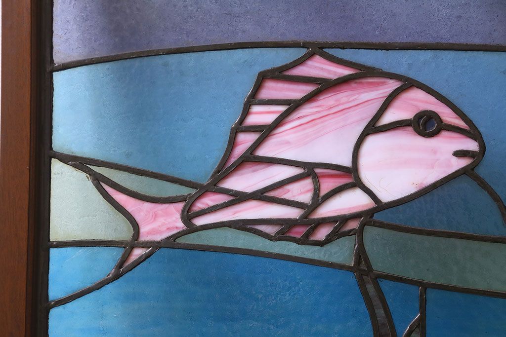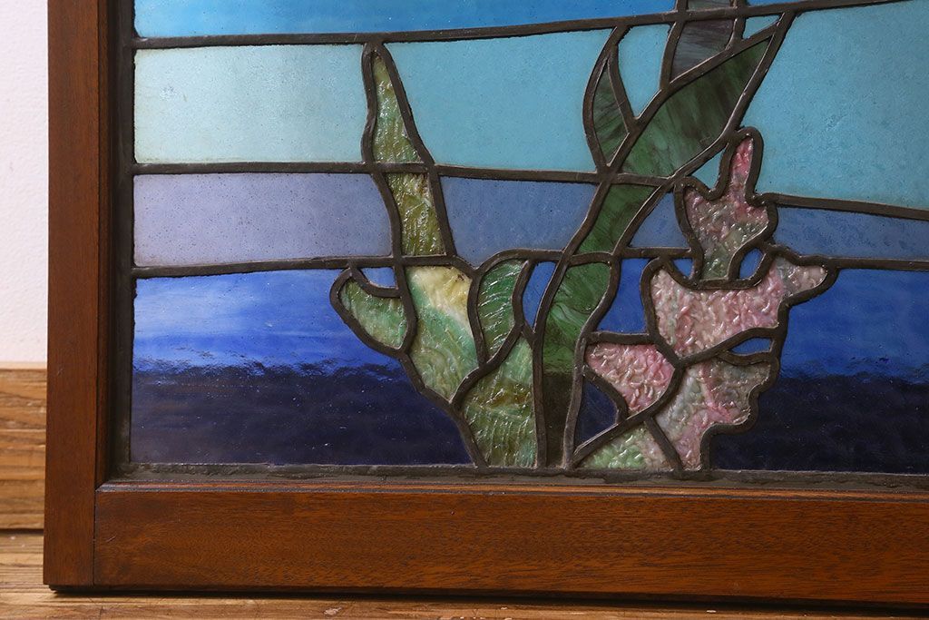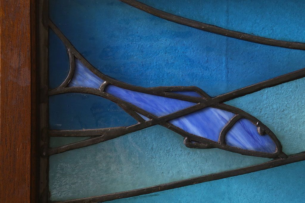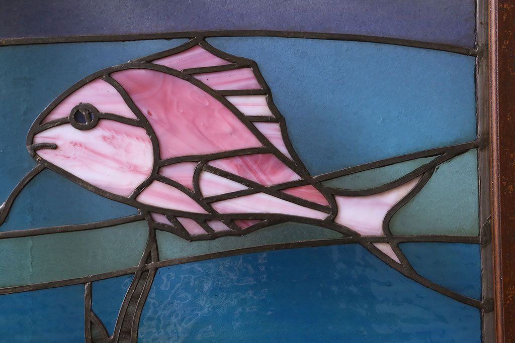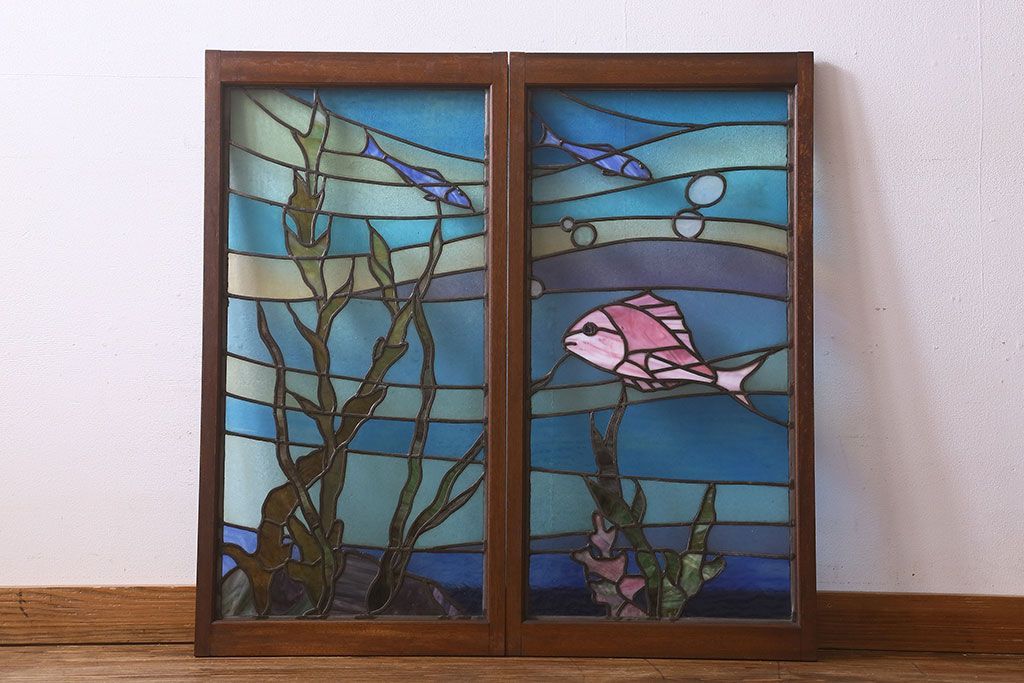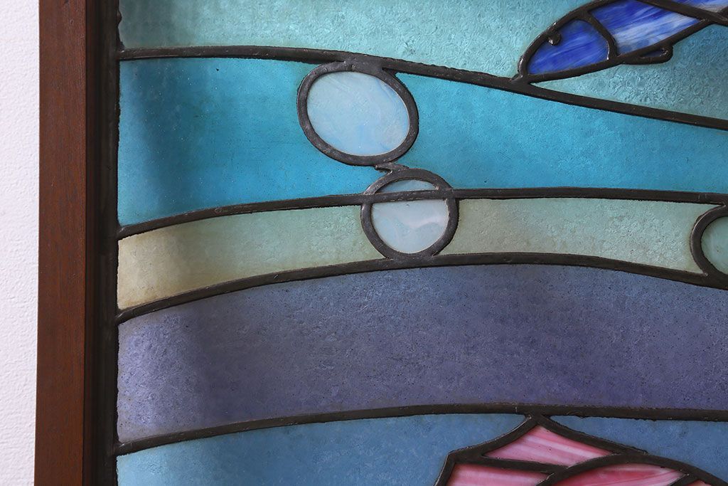 アンティーク雑貨 昭和初期 海の中にいるような図柄が素敵なステンドグラスのガラス戸(引き戸、建具)